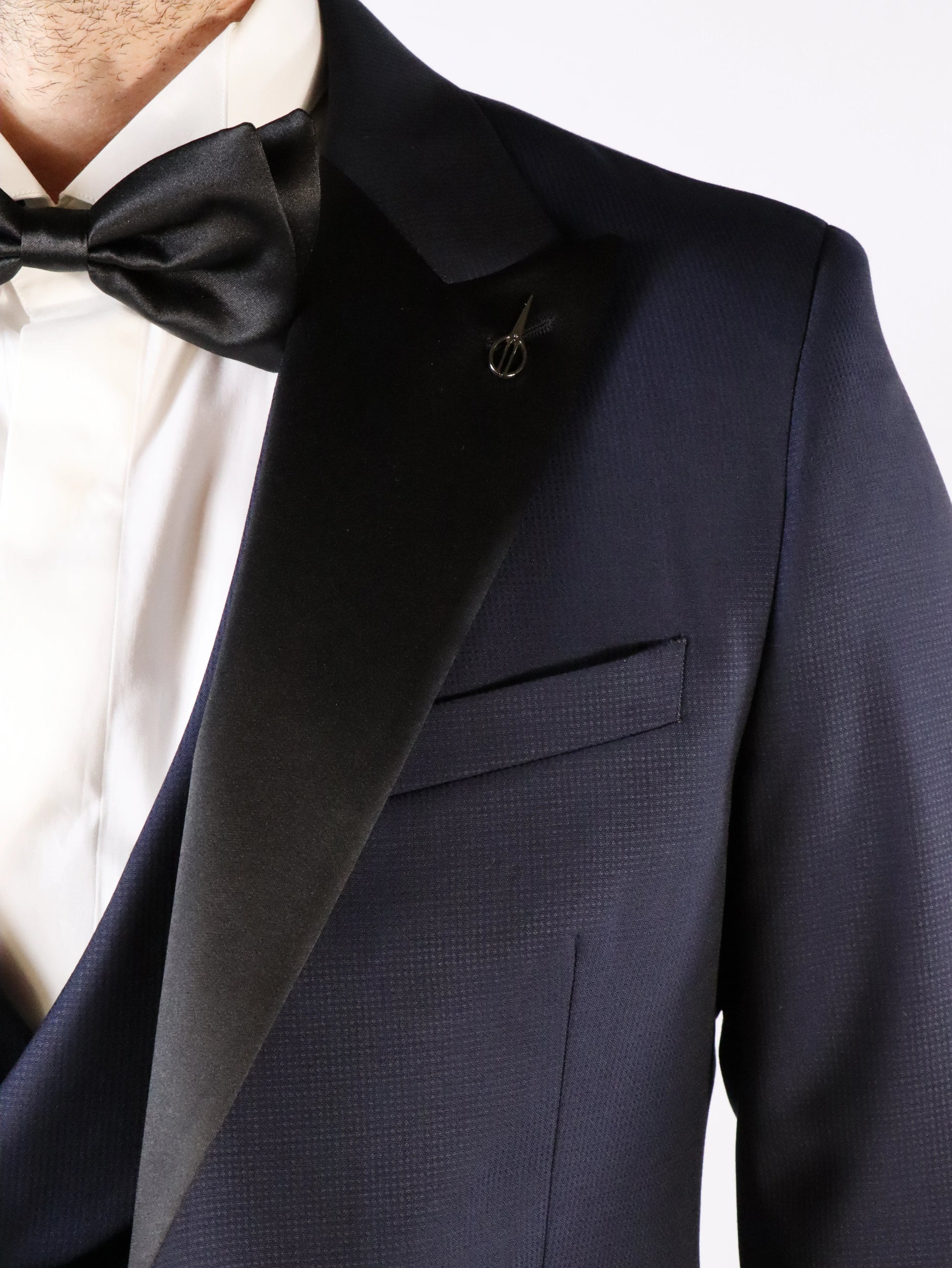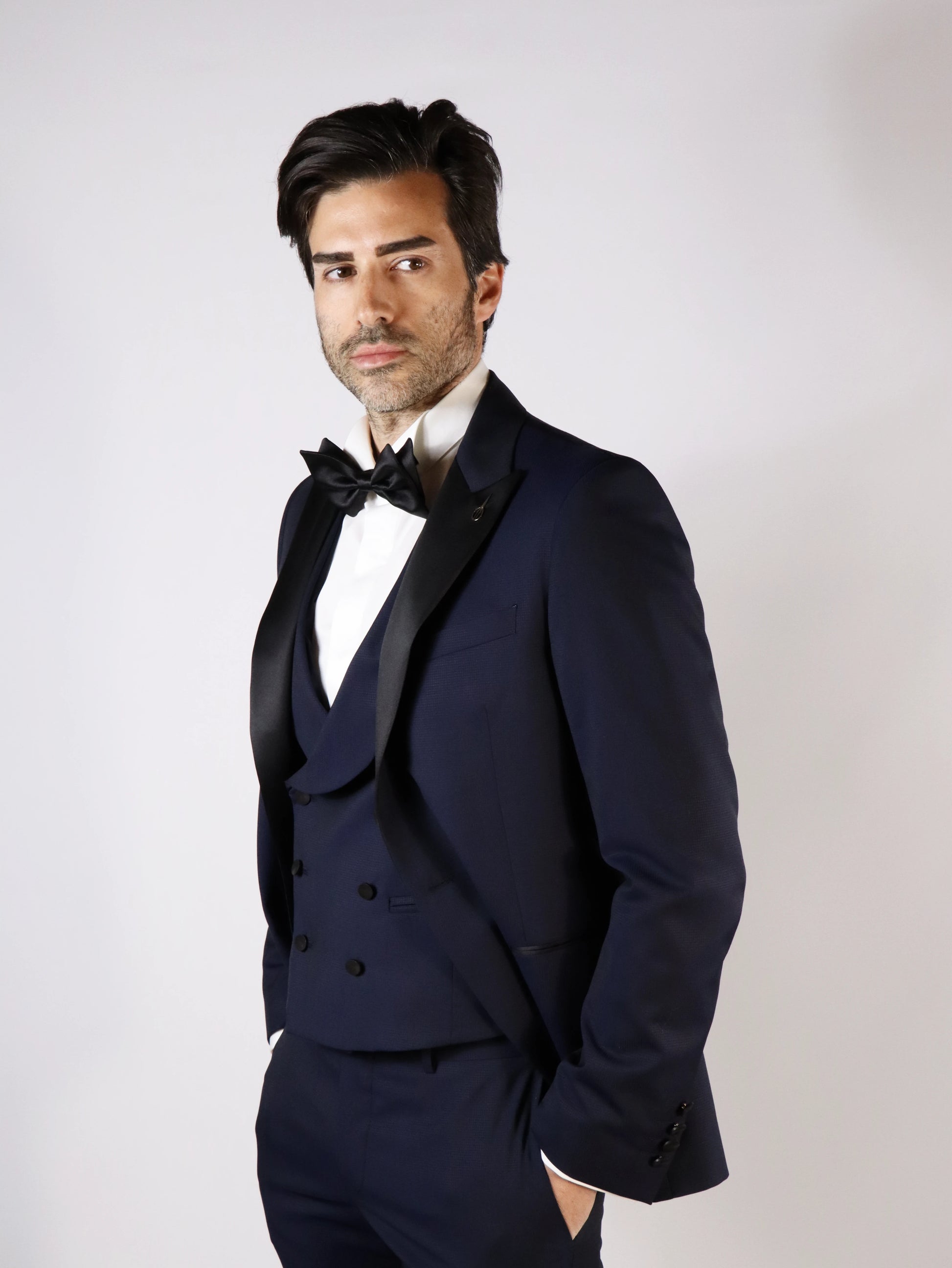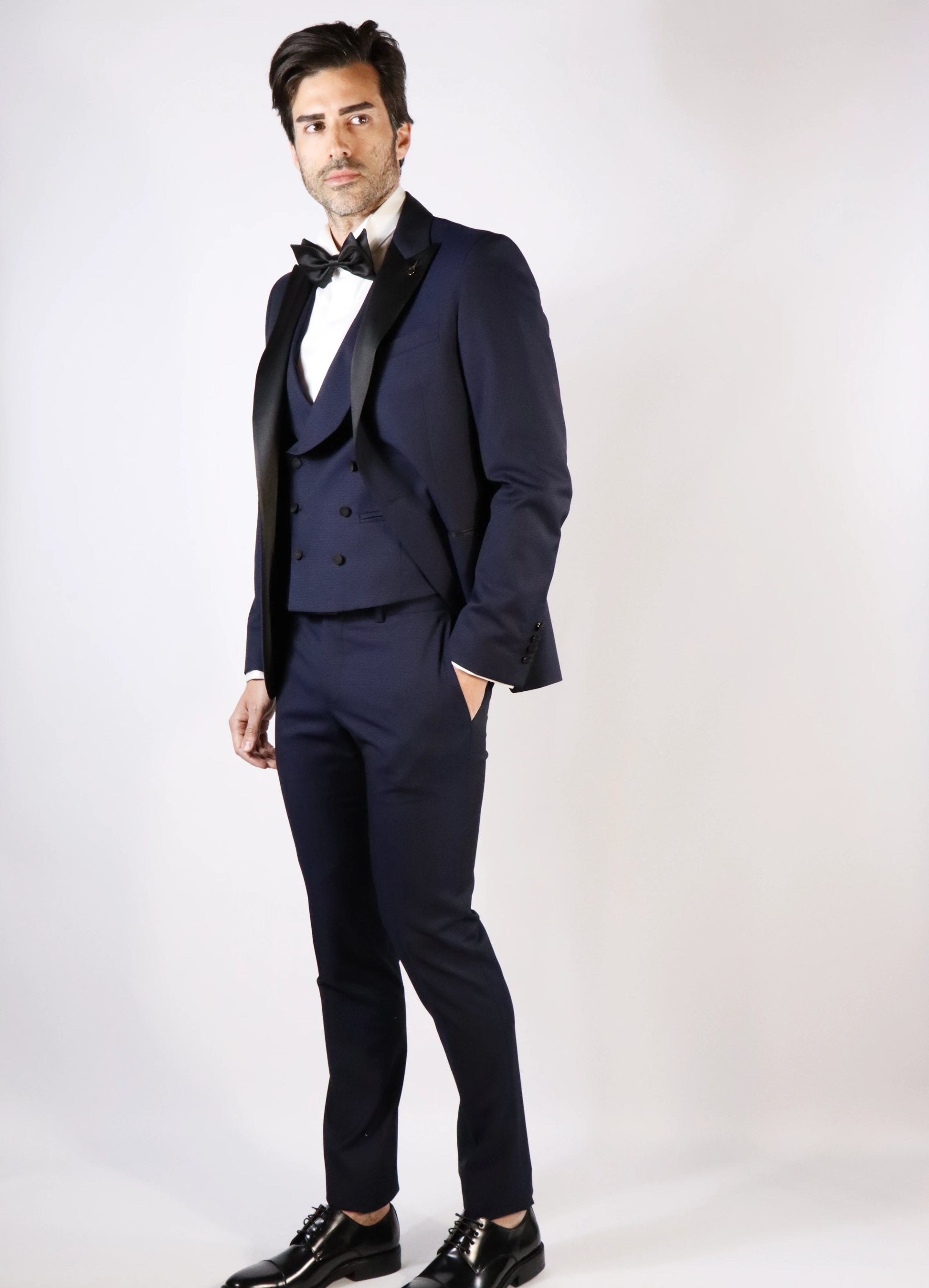 Abito monopetto con revers in raso, giacca con spacco centrale, bottone a contrasto nero, pantalone senza pinces fondo cm.18, gilet doppio petto con revers e tasche. Vestibilità SLIM FIT.