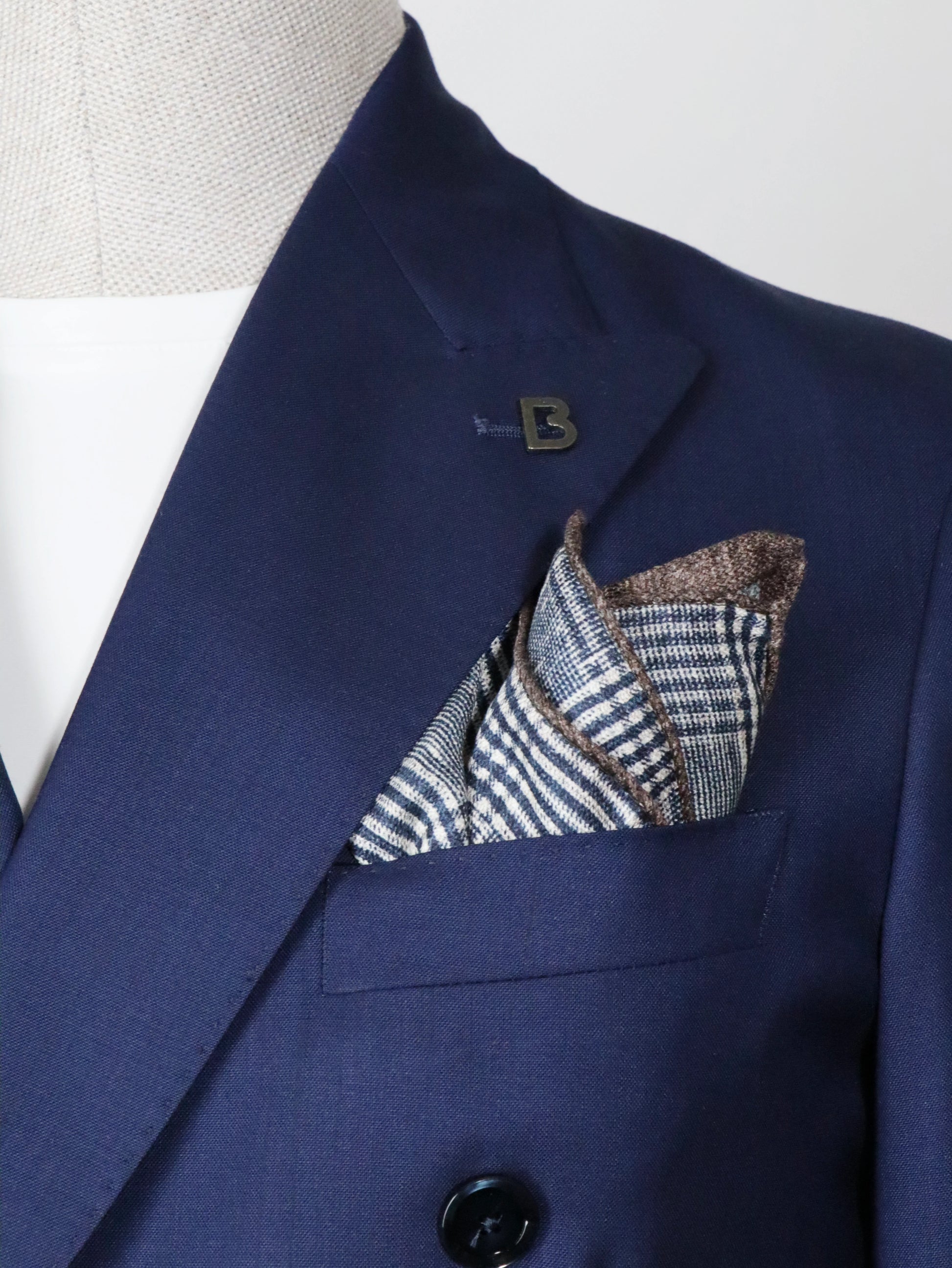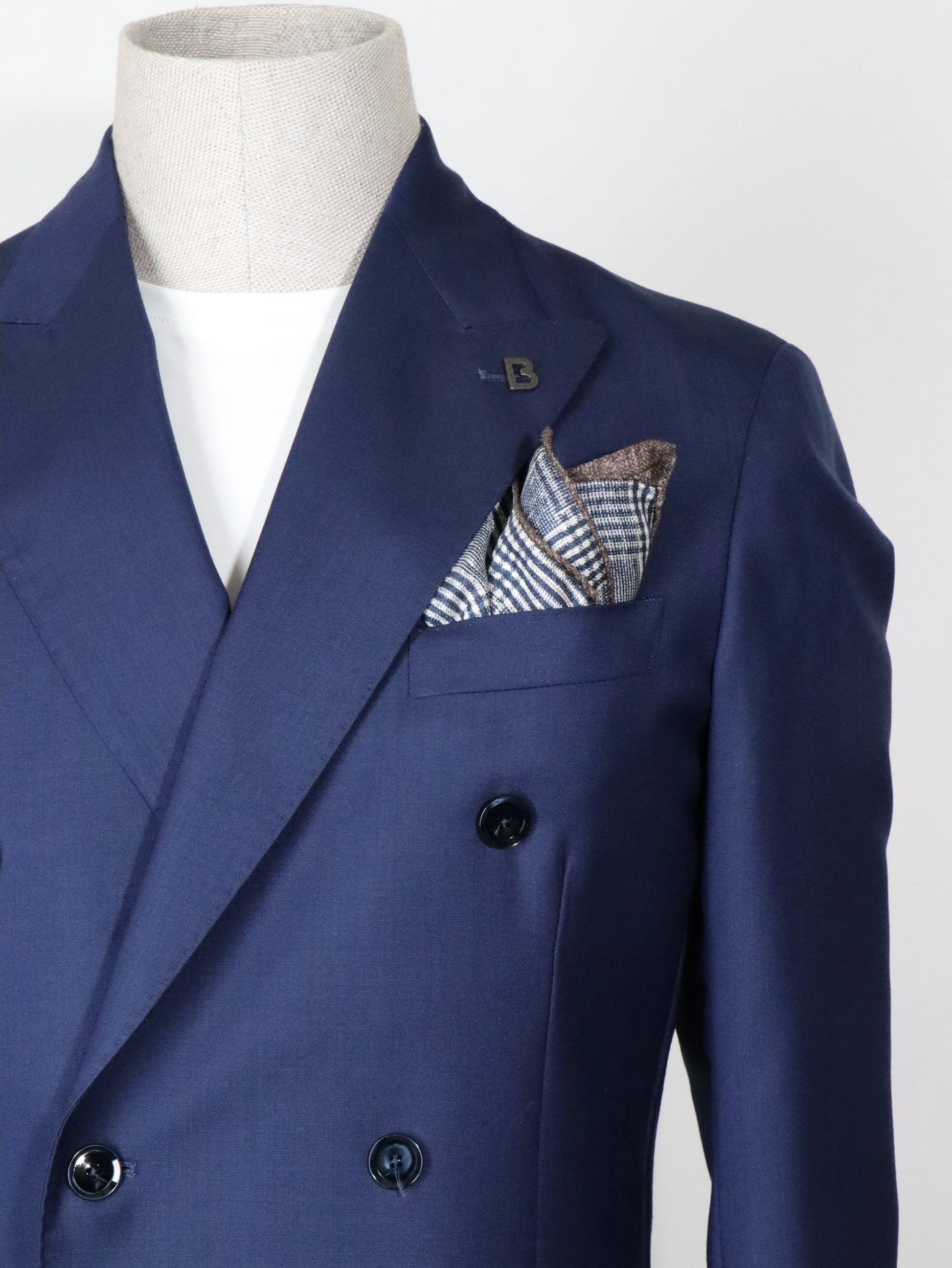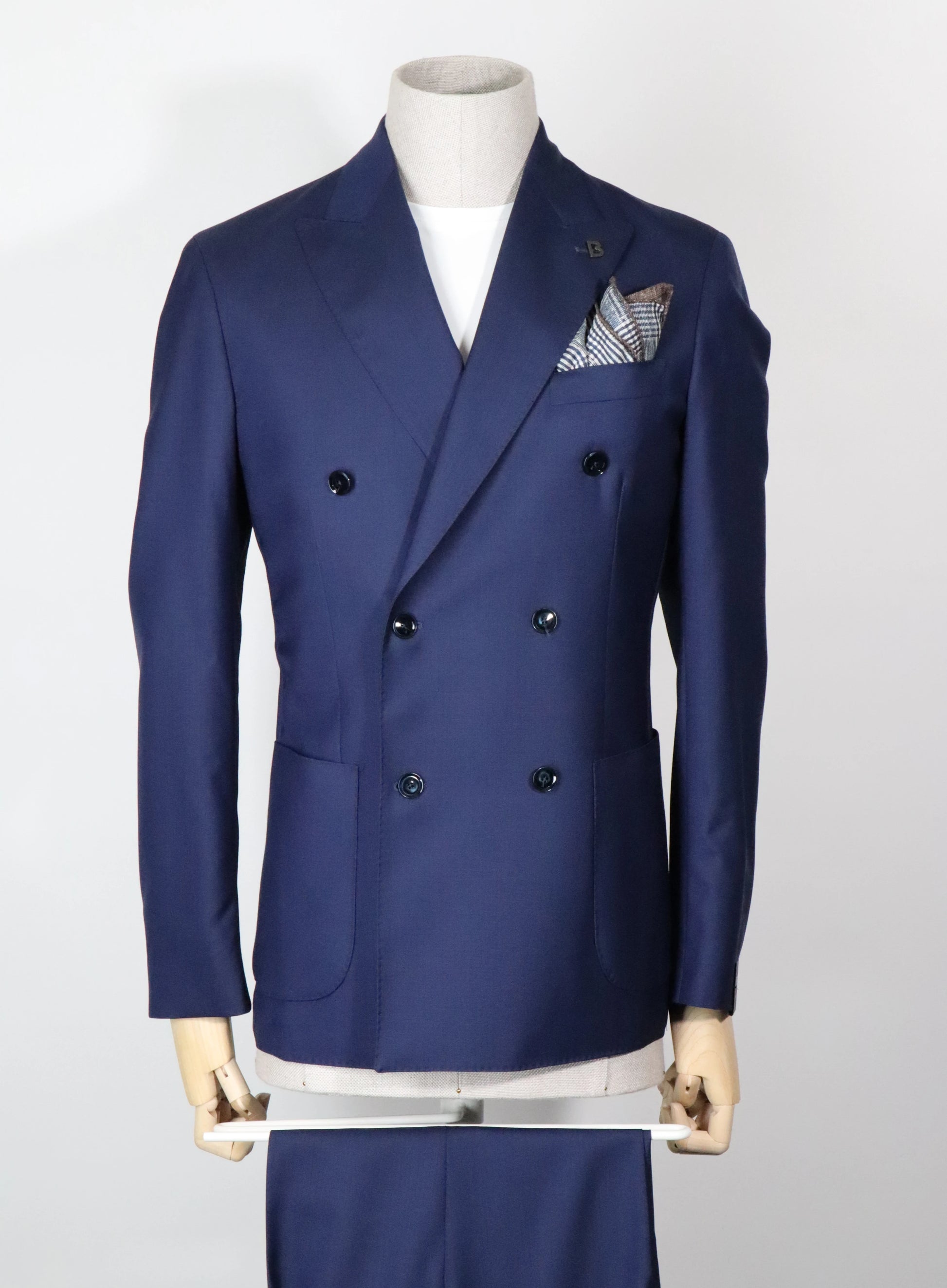 Abito doppio petto, tasche applicate, spacchi laterali, impunture sartoriali, sfoderato. Pantalone con 1 pinces, Made In Italy.
