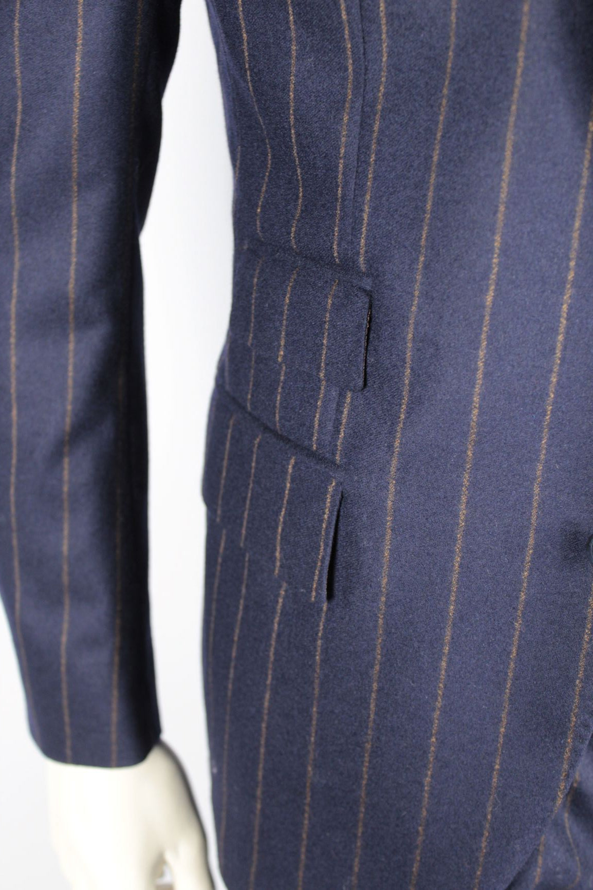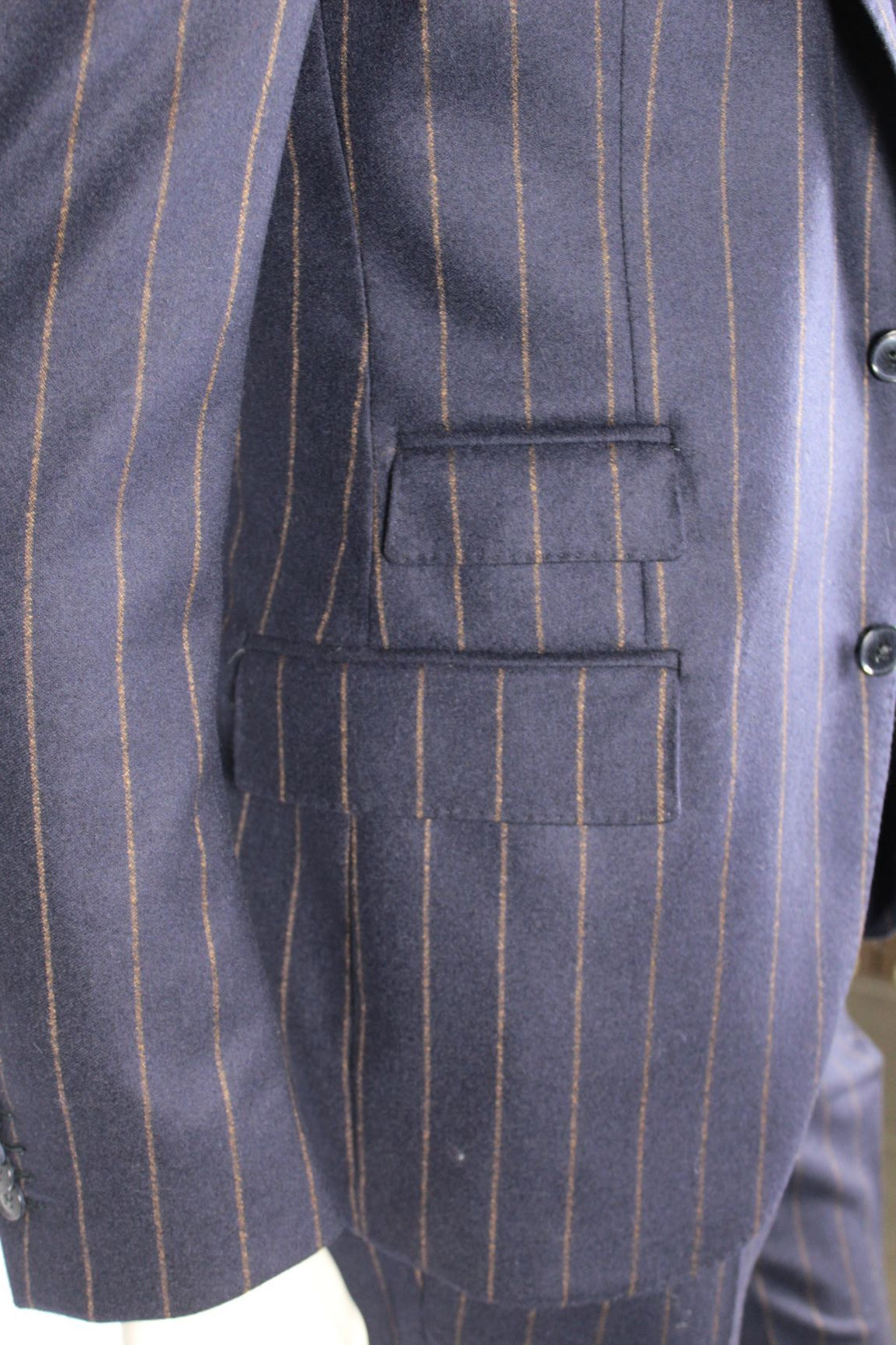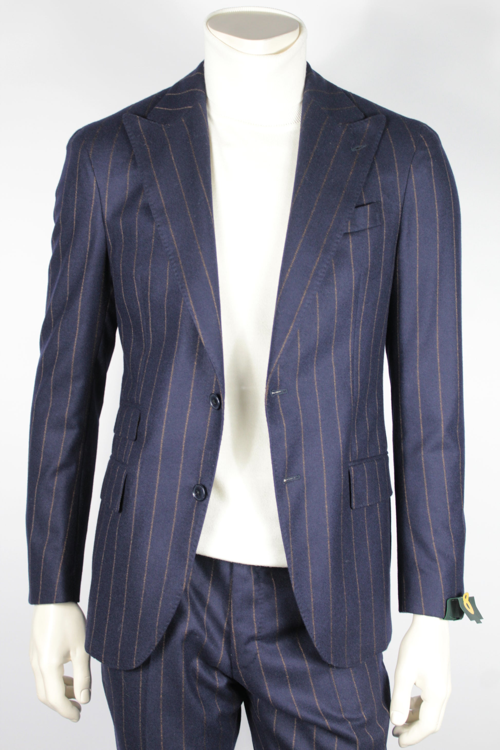 Abito gessato con rever a lancia, due bottoni, doppio taschino sul davanti, sfoderato. Pantalone sena pinces. Vestibilità slim
