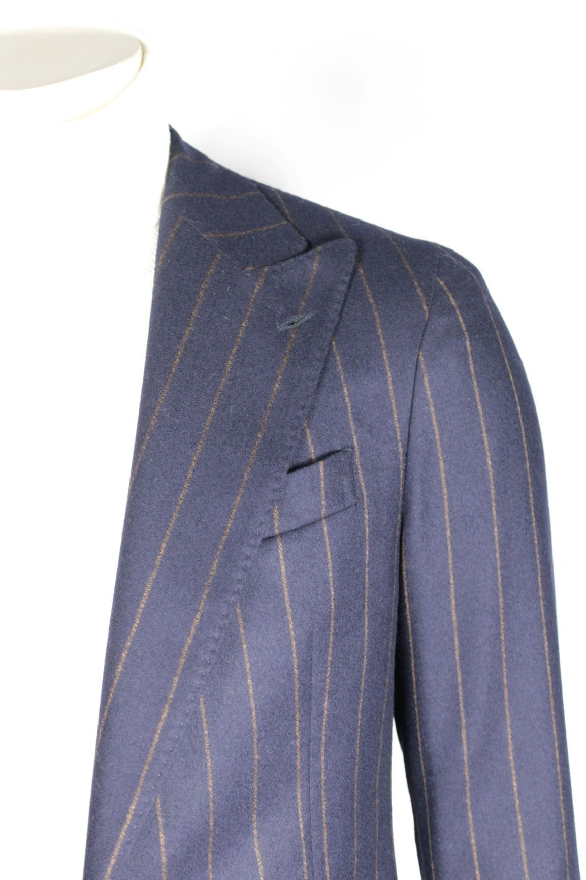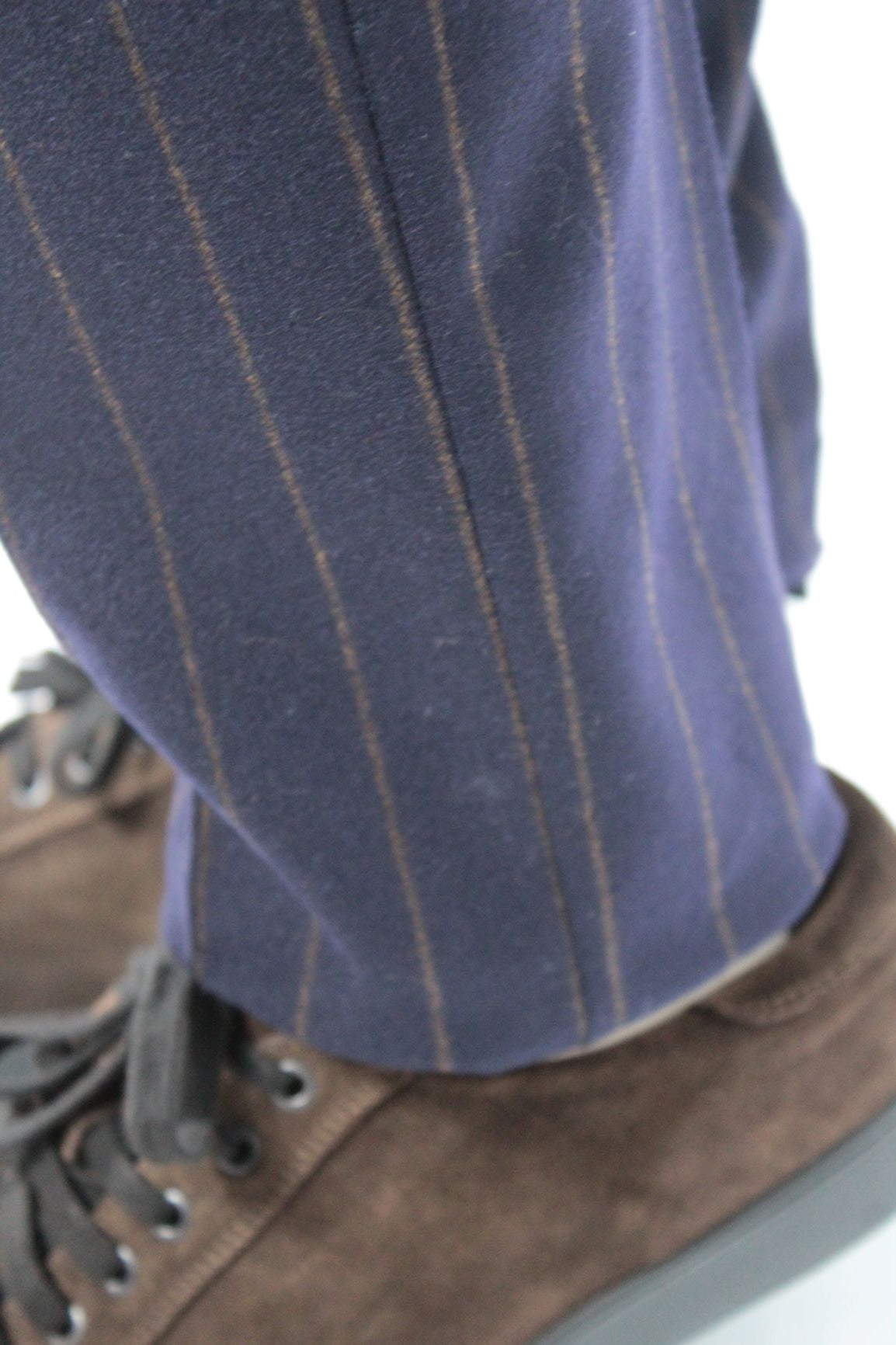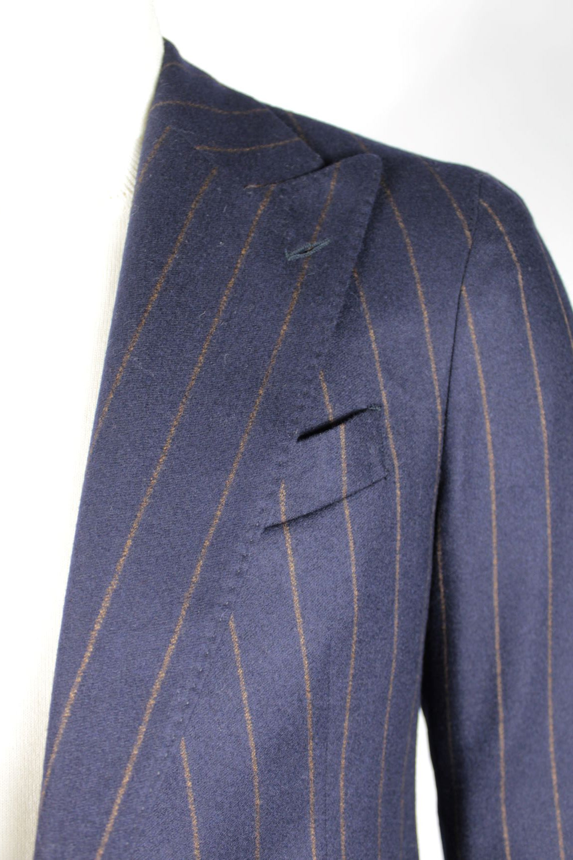 Abito gessato con rever a lancia, due bottoni, doppio taschino sul davanti, sfoderato. Pantalone sena pinces. Vestibilità slim