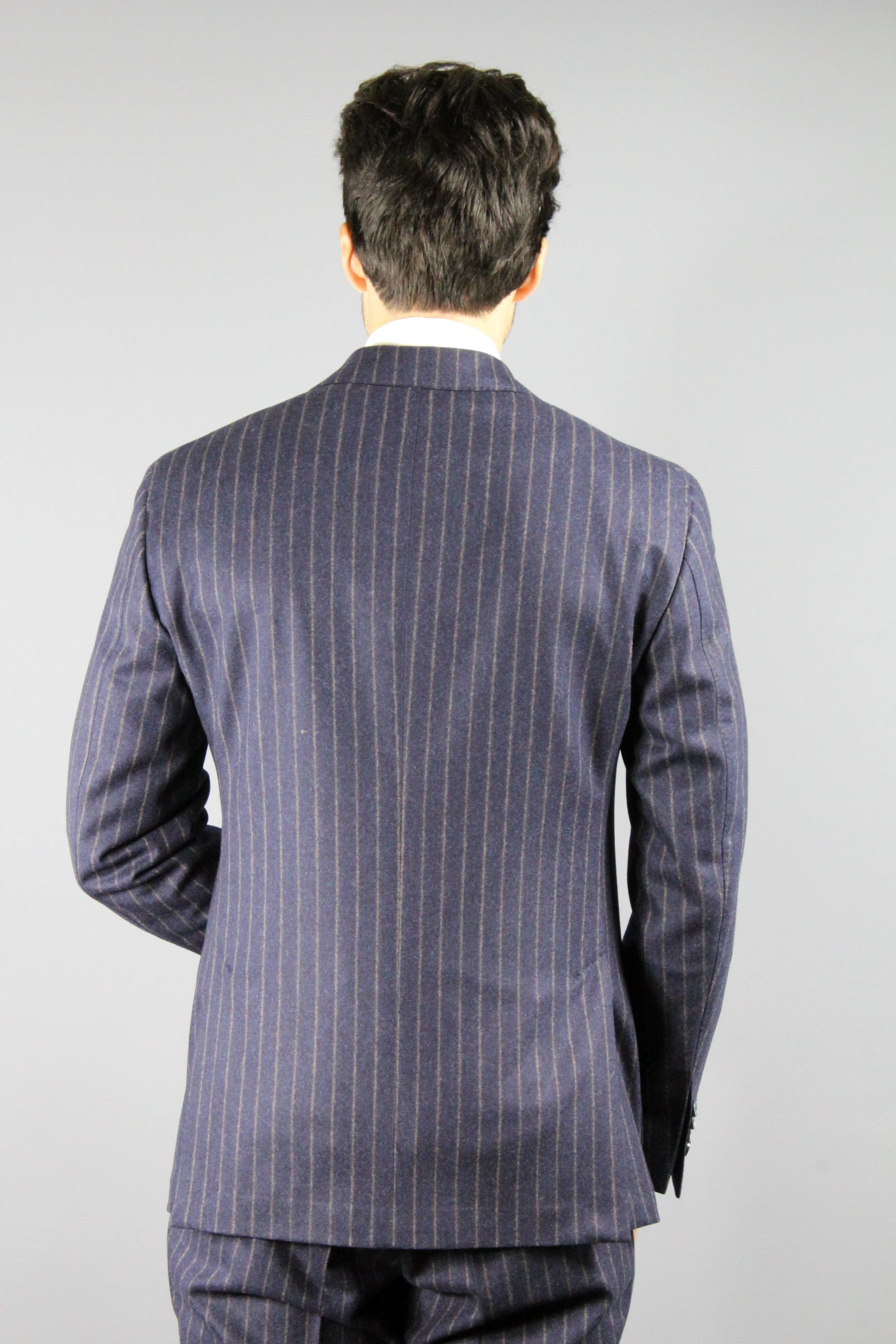 Abito sartoriale gessato in flanella di Vitale Barberis canonico, con due tasche applicate, spacchi laterali, sfoderato
