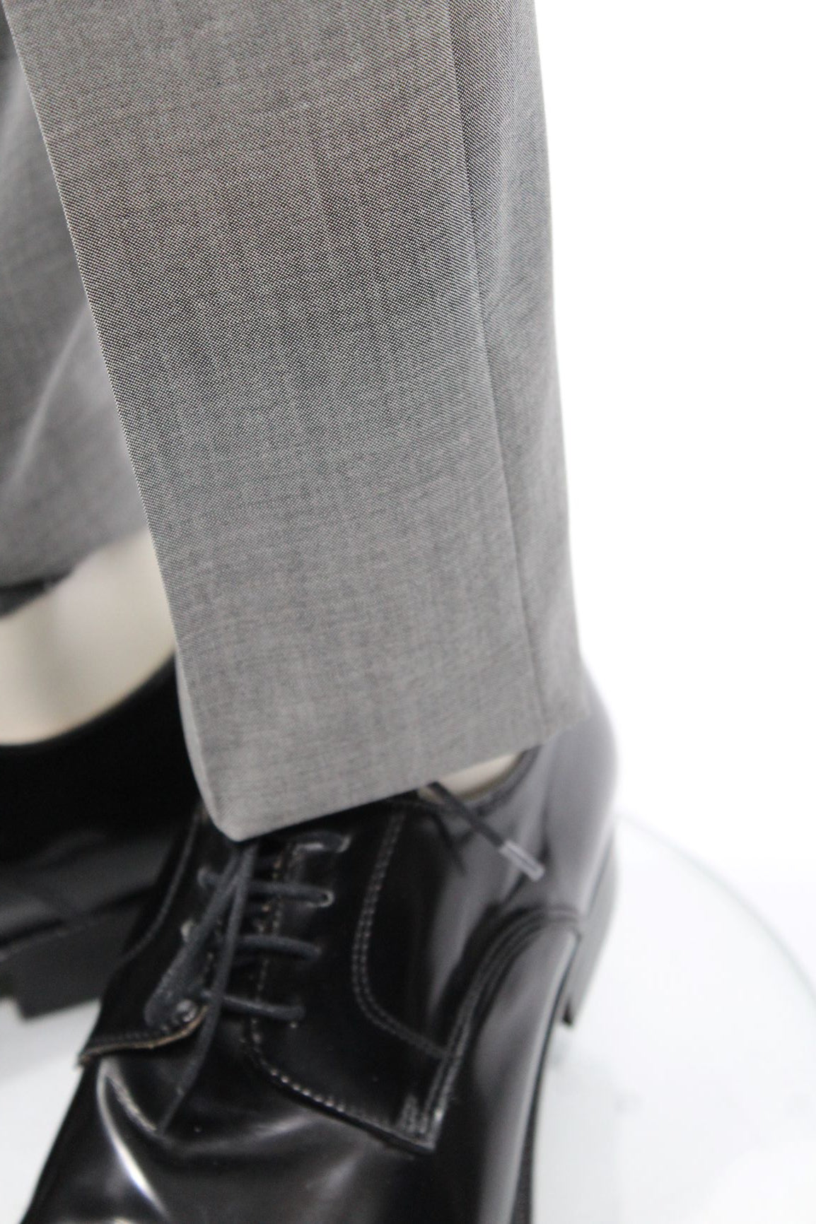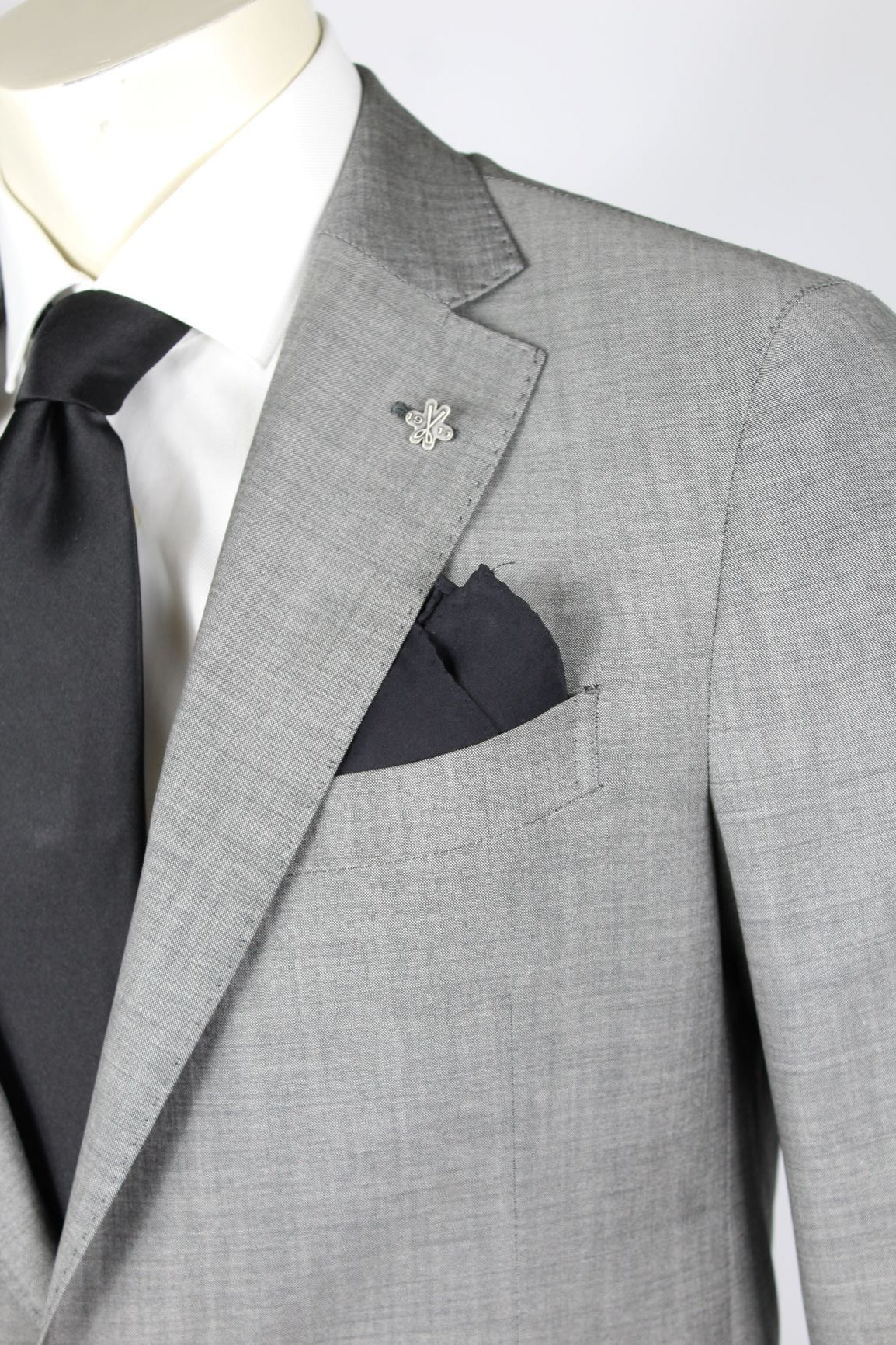 Abito con giacca a due bottoni con spacchi laterali ed impunture sartoriali, due tasche con pattina, pantalone senza pinces fondo cm.18 vestibilità D. 7.
