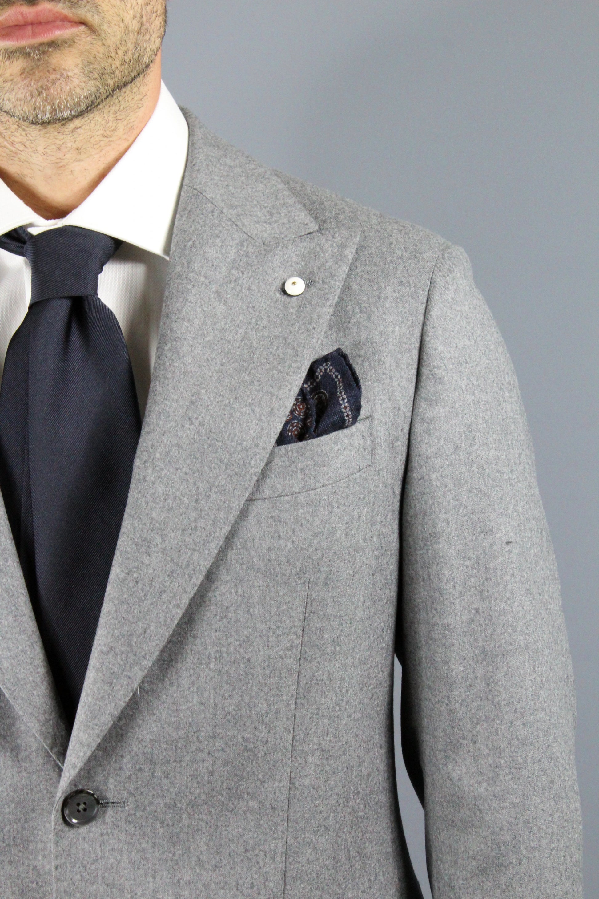 Abito in pura lana vergine in grigio mélange. Reverse con punte a lancia, doppio taschino, spacchi laterali.