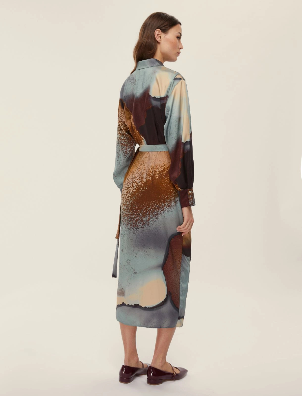 Abito sofisticato in twill tecnico, decorato da una macro stampa astratta che abbraccia i colori del cielo e della terra. La costruzione con gonna a portafoglio crea movimento sul punto vita.