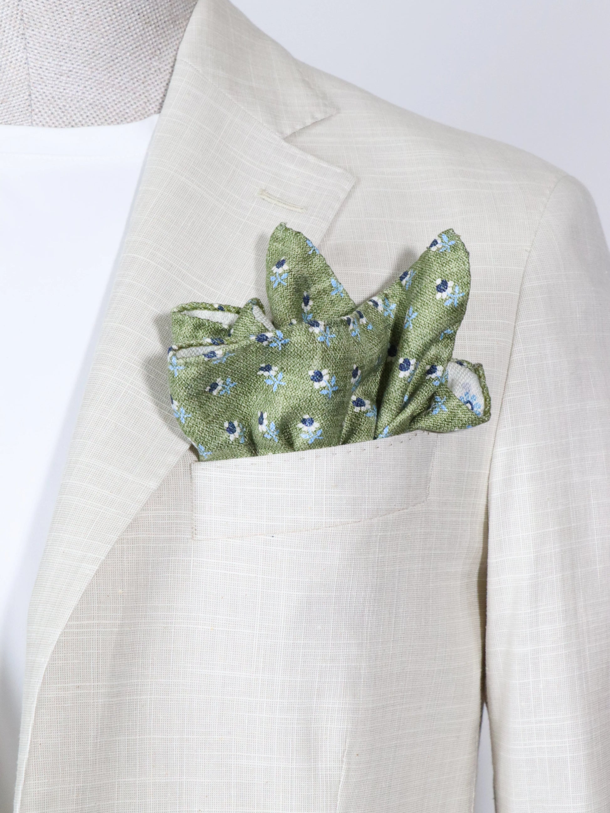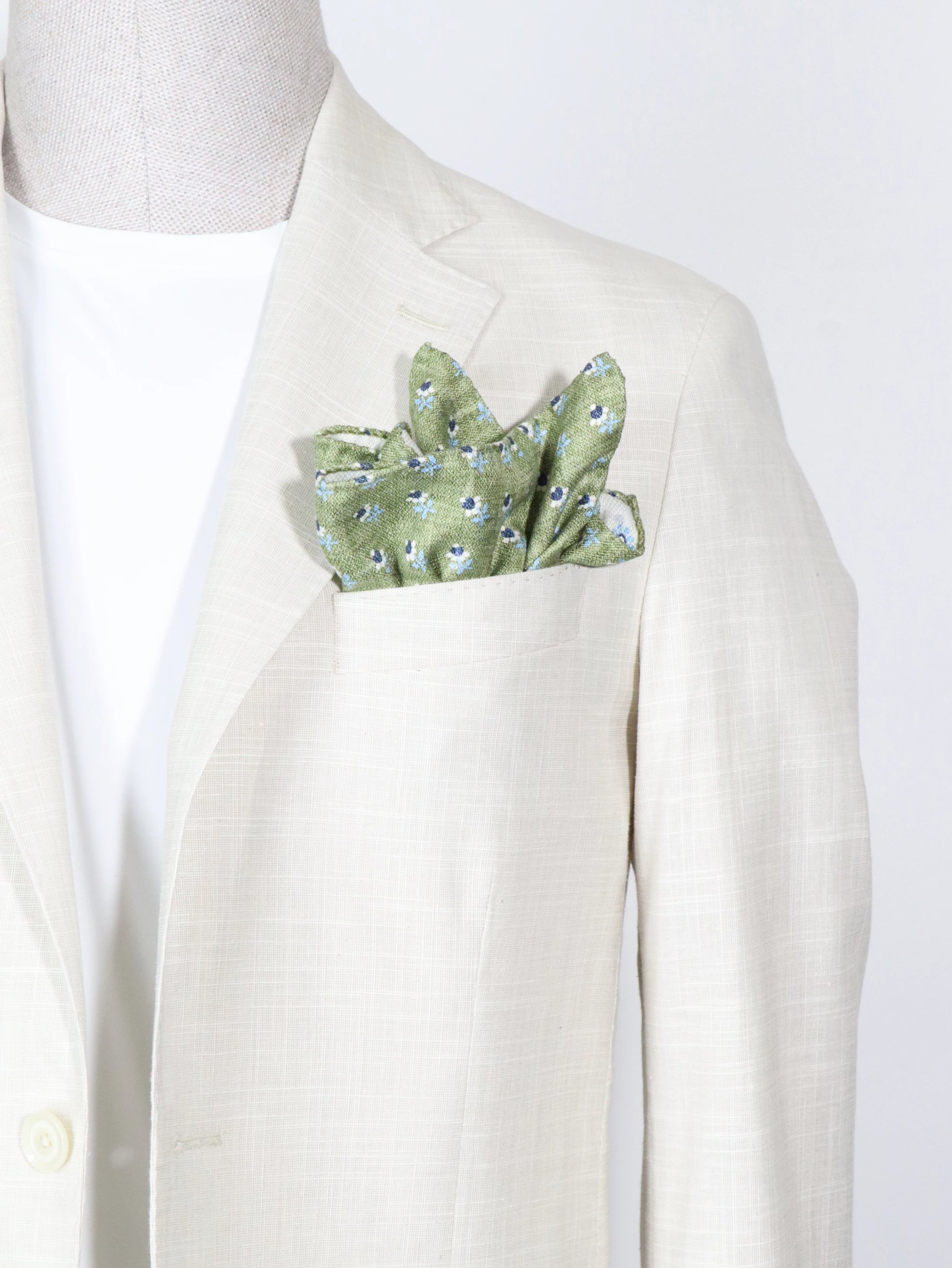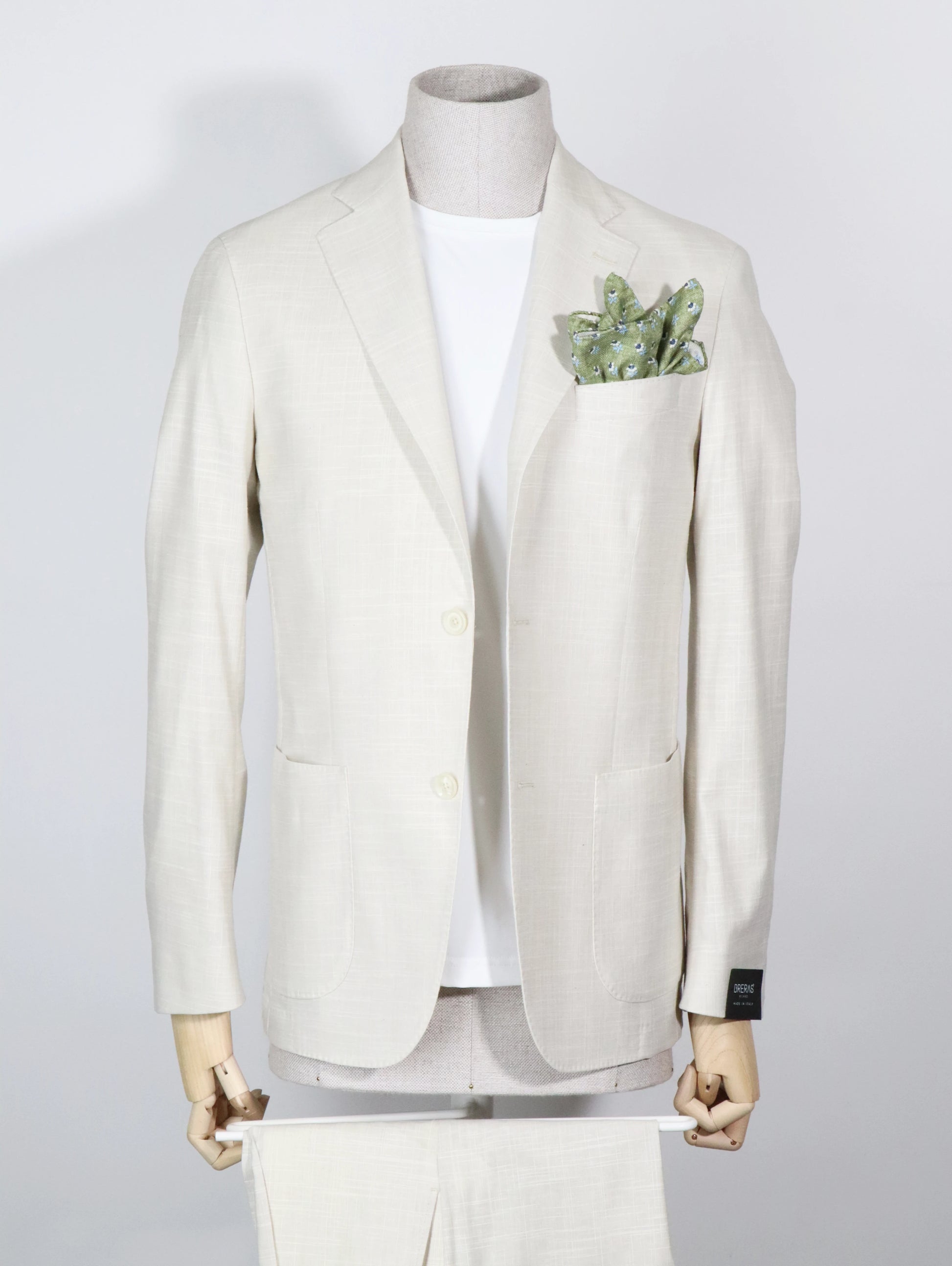 Abito monopetto sfoderato, tasche applicate, spacchi laterali, impunture amf, pantalone con 1 pinces. Made in Italy