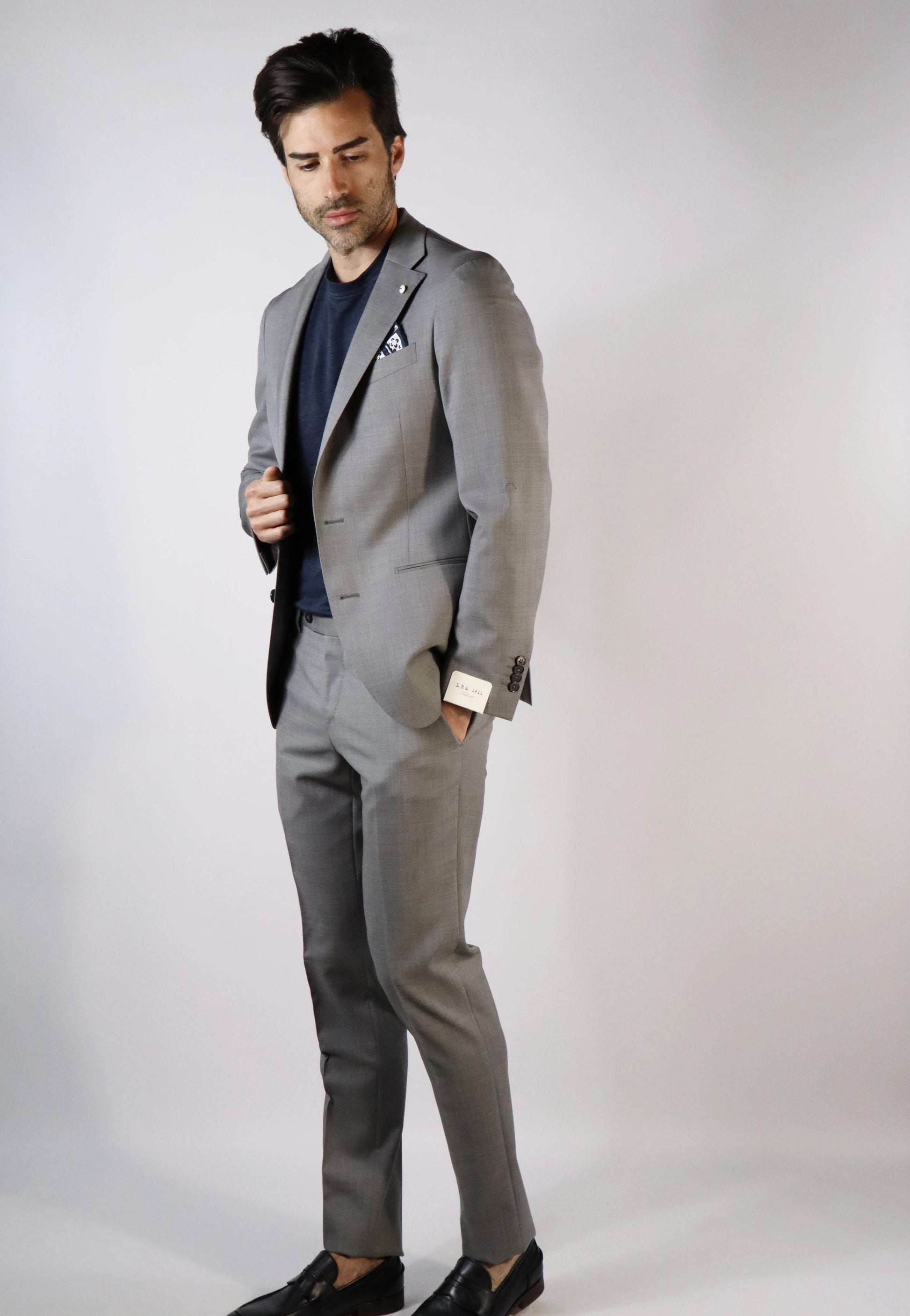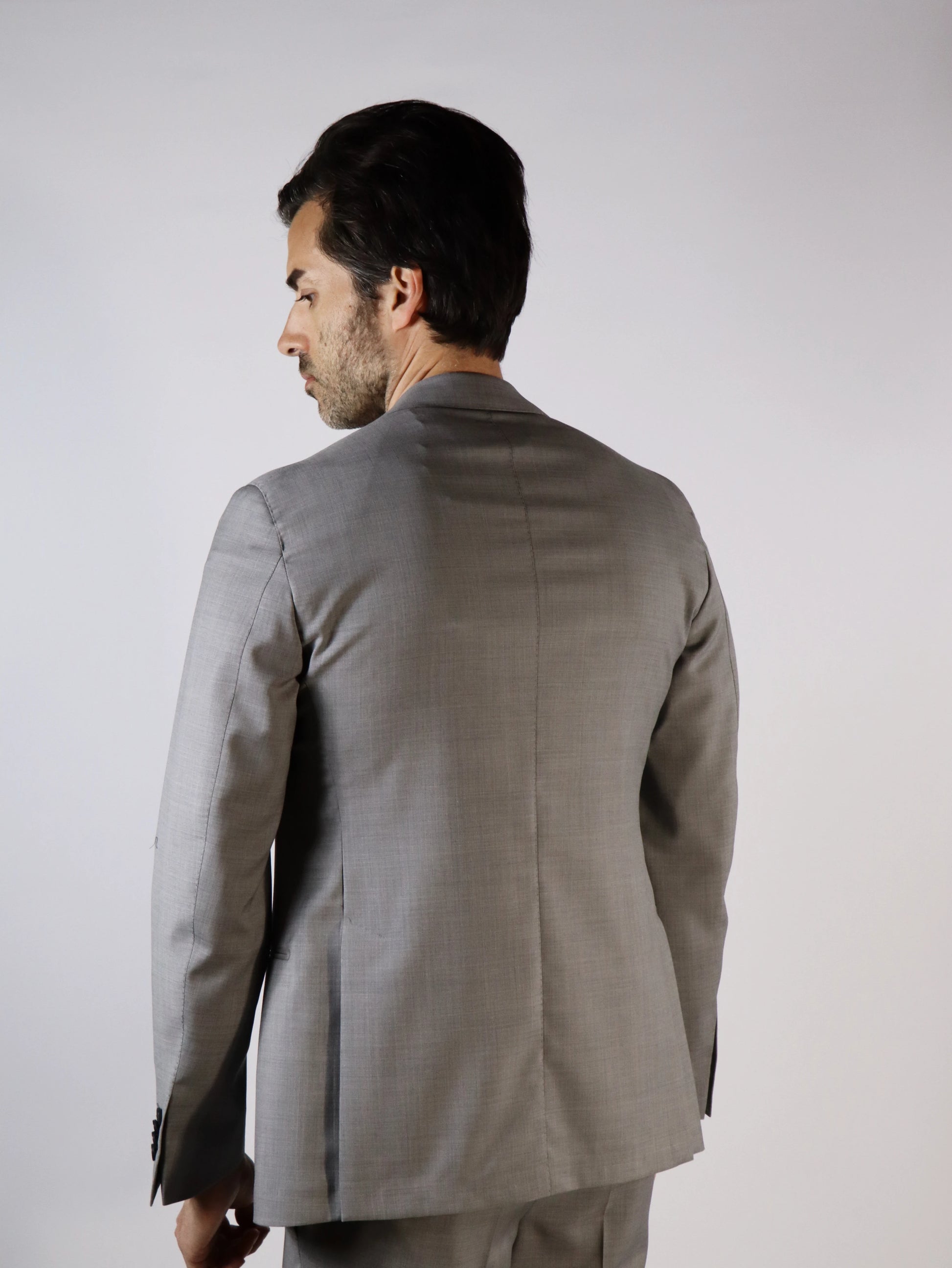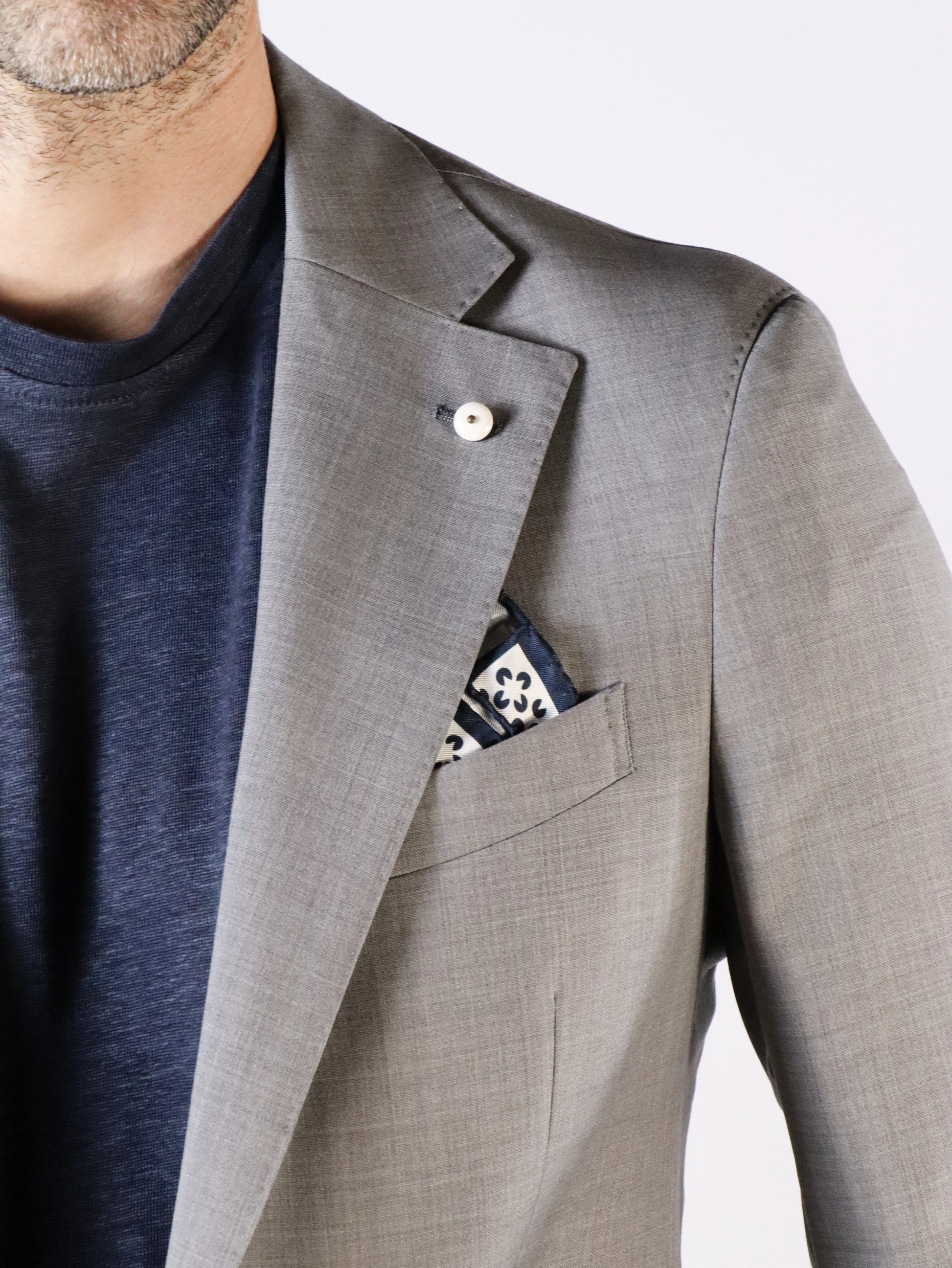 Abito monopetto in lana con tasche a pattina su fondo blu. Il motivo a tinta unita grigio rende questo capo un pezzo unico nel guardaroba estivo.