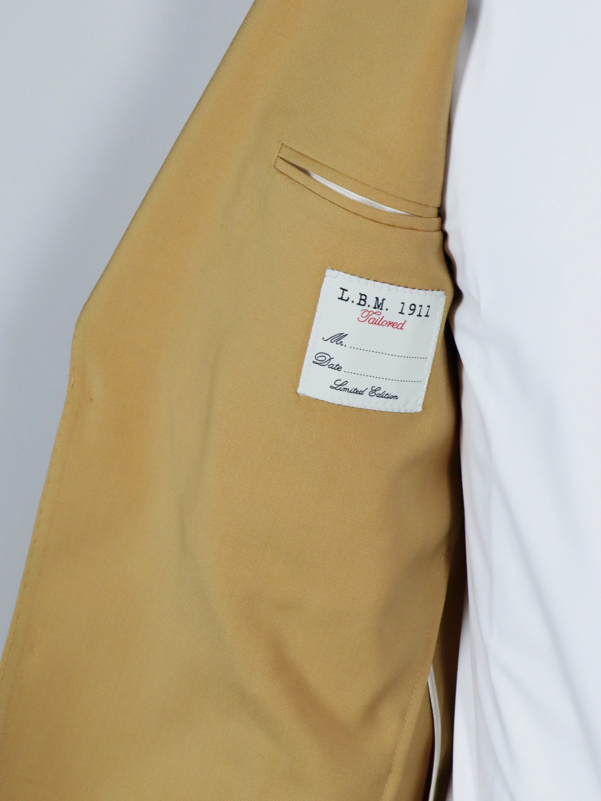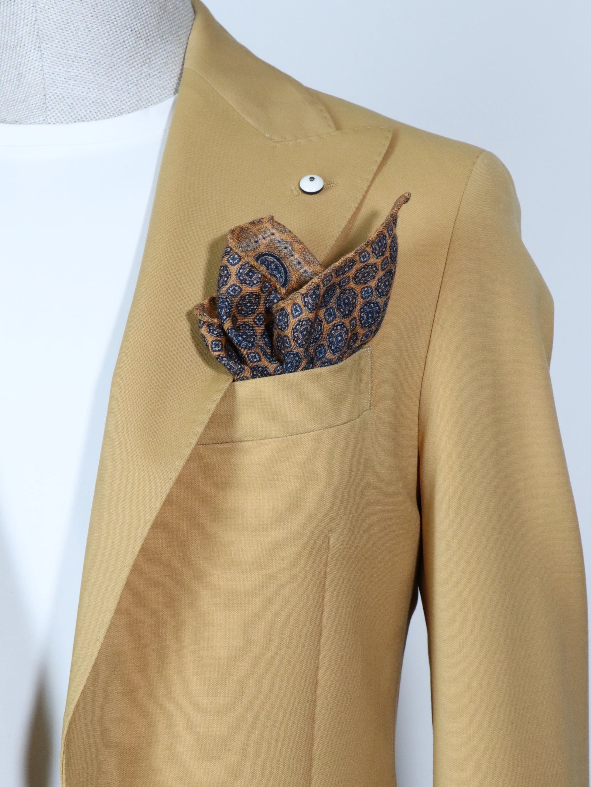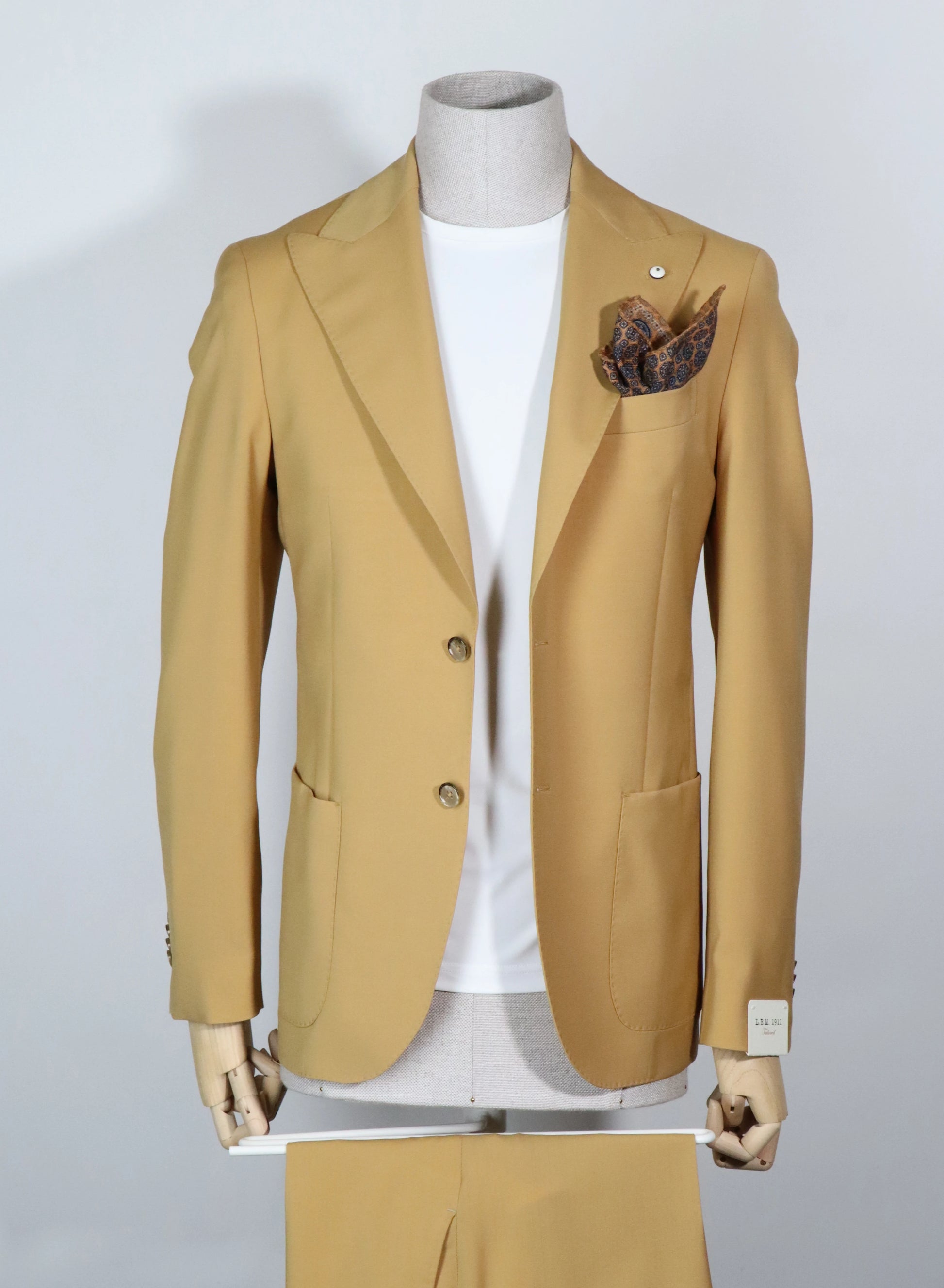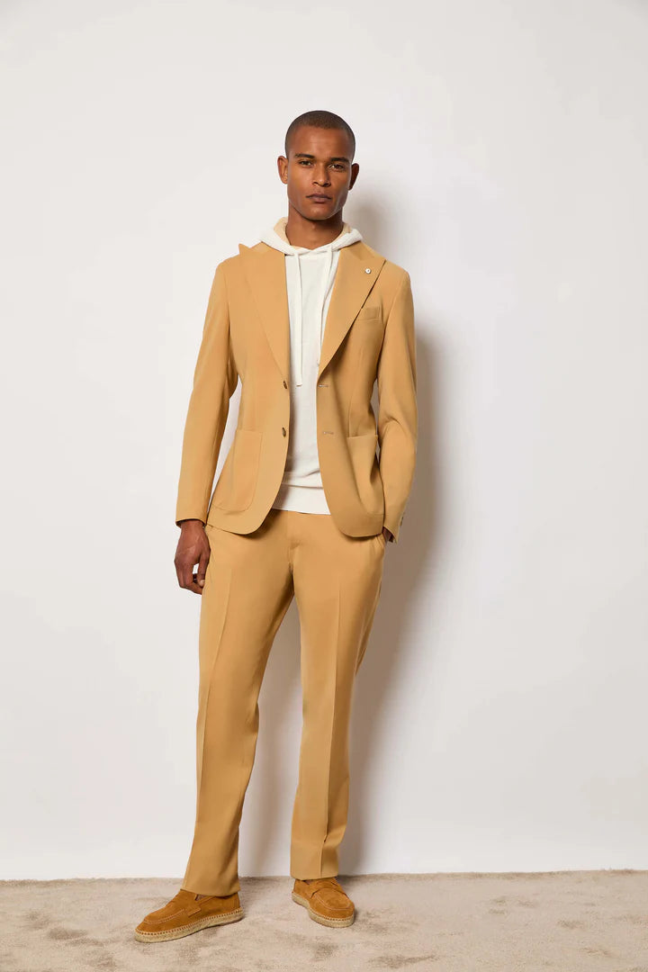 Abito da uomo elegante ed essenziale realizzato in 100% lana vergine nei toni del giallo ocra. Composto da un blazer sartoriale con una struttura classica a due bottoni e rever a punta lancia con tasche applicate. Perfetto per occasioni semi-formali o per un look smart casual.