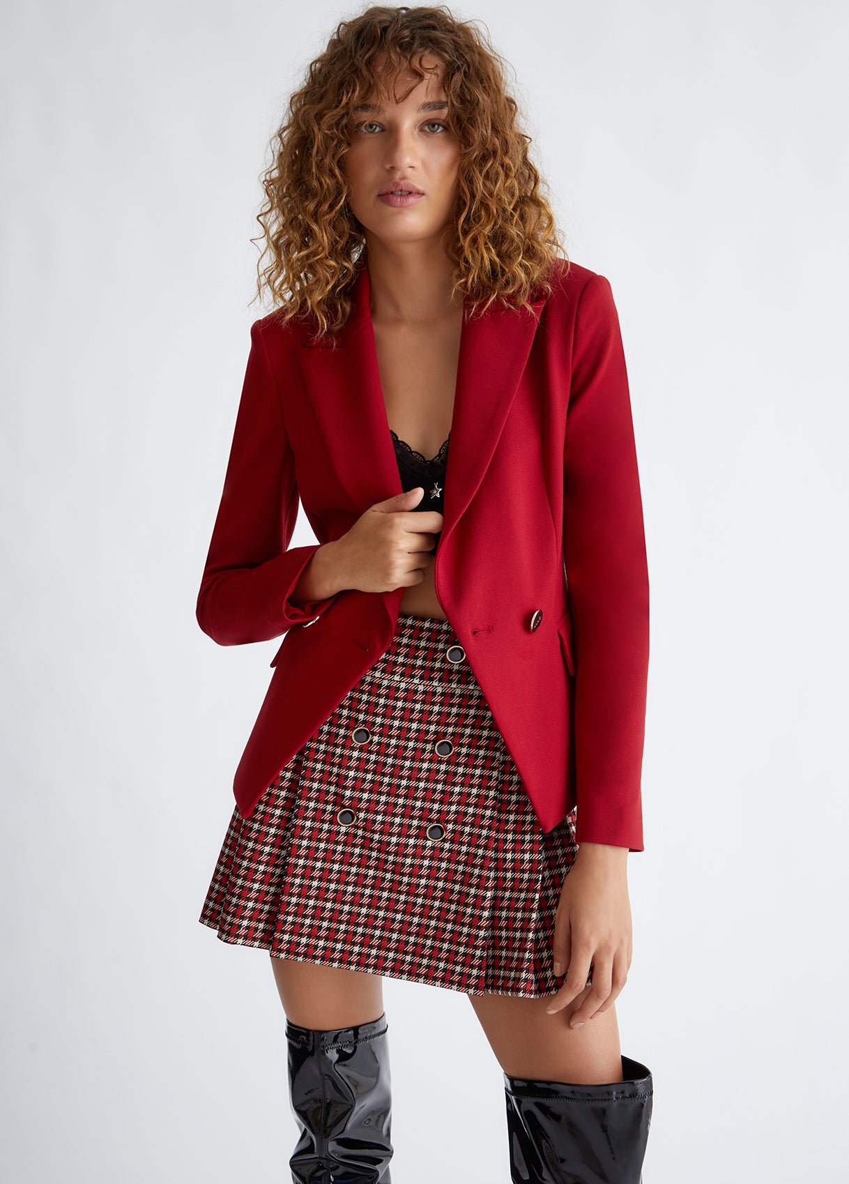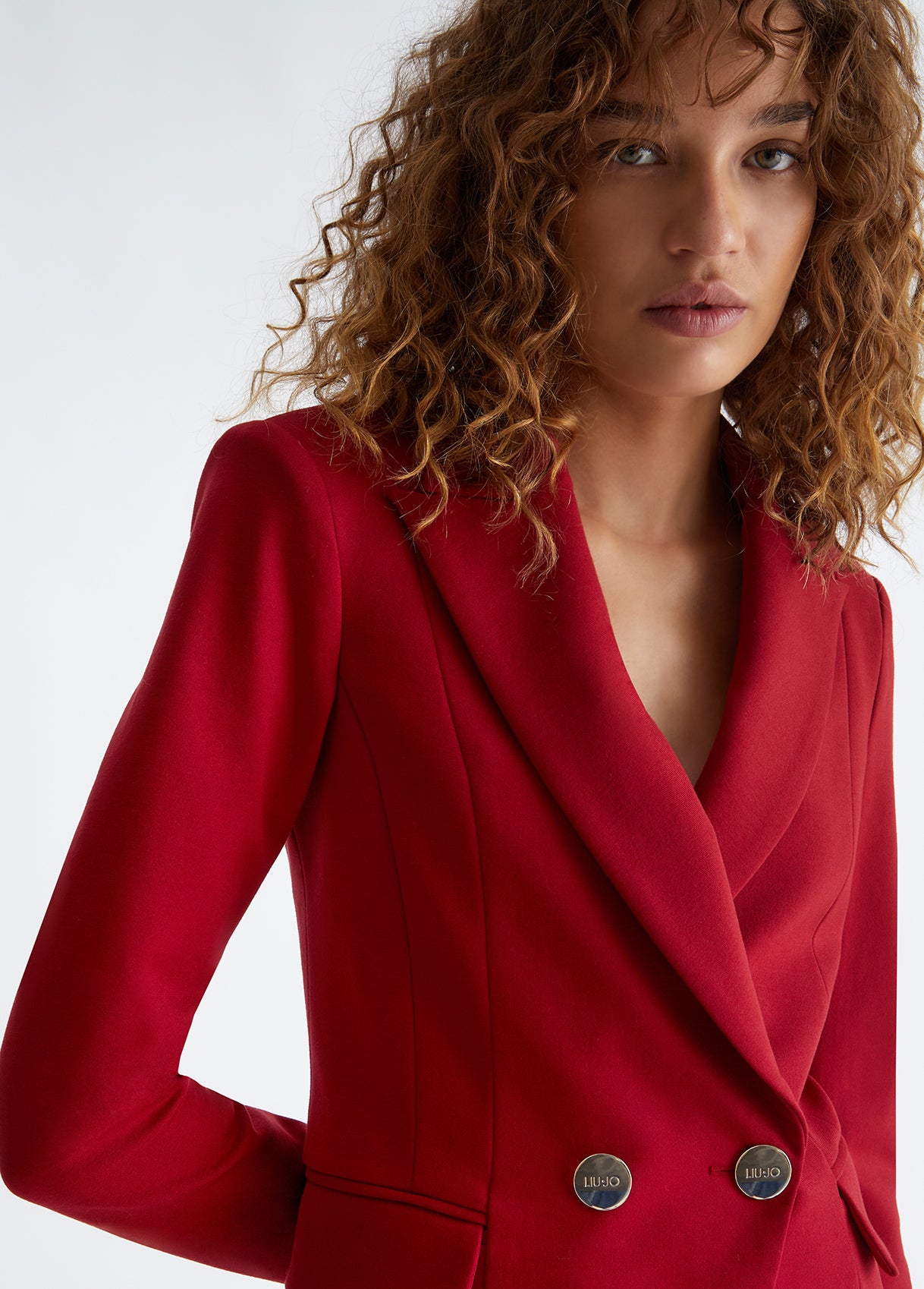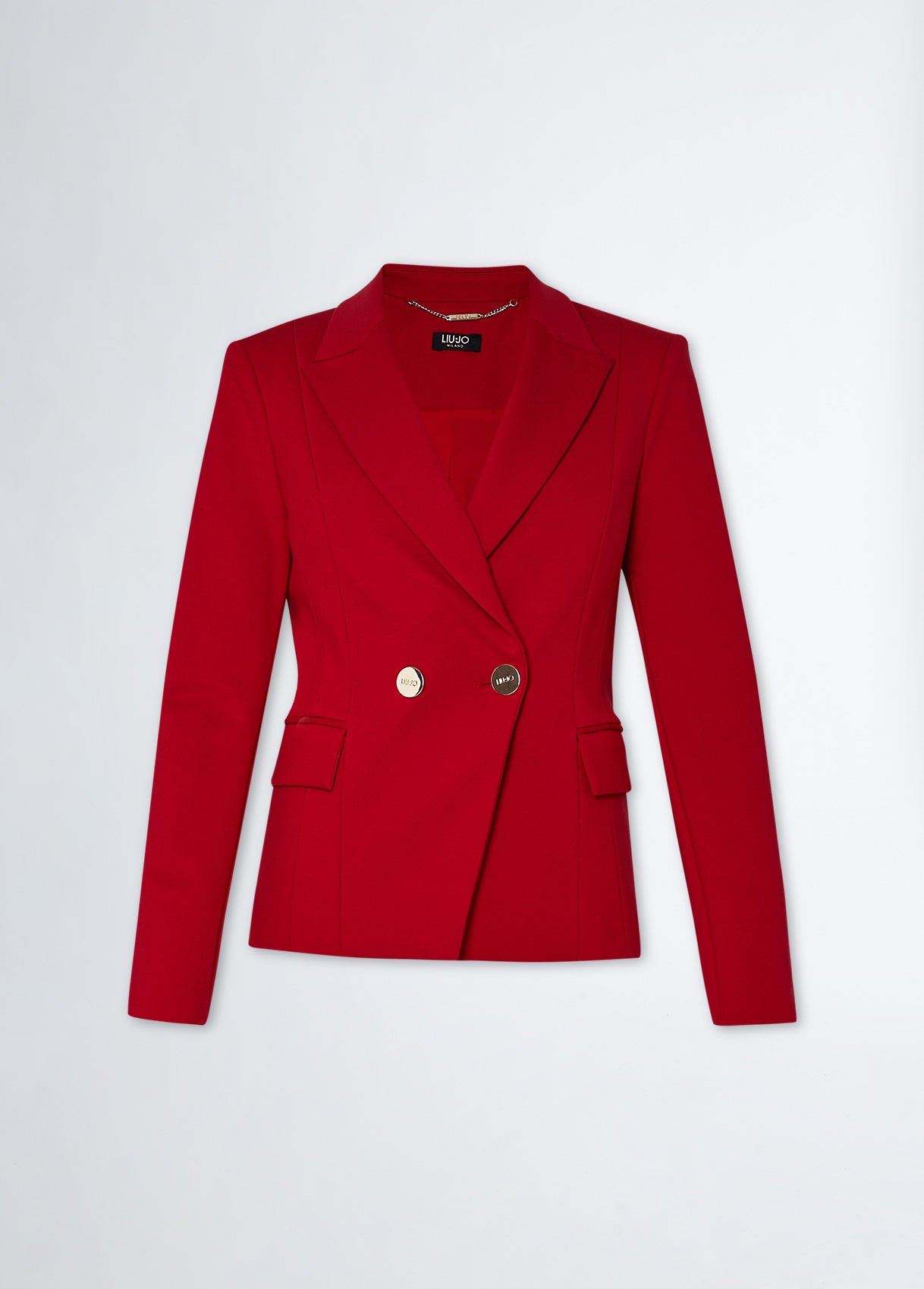 L'eleganza incontra il glam in questo blazer rosso Liu Jo, realizzato in jersey punto milano per accompagnare i tuoi movimenti. Nulla è lasciato al caso, dalla linea sartoriale con chiusura doppiopetto ai bottoni golden logati, fino alla catena gioiello sul dietro. Impossibile resistere.