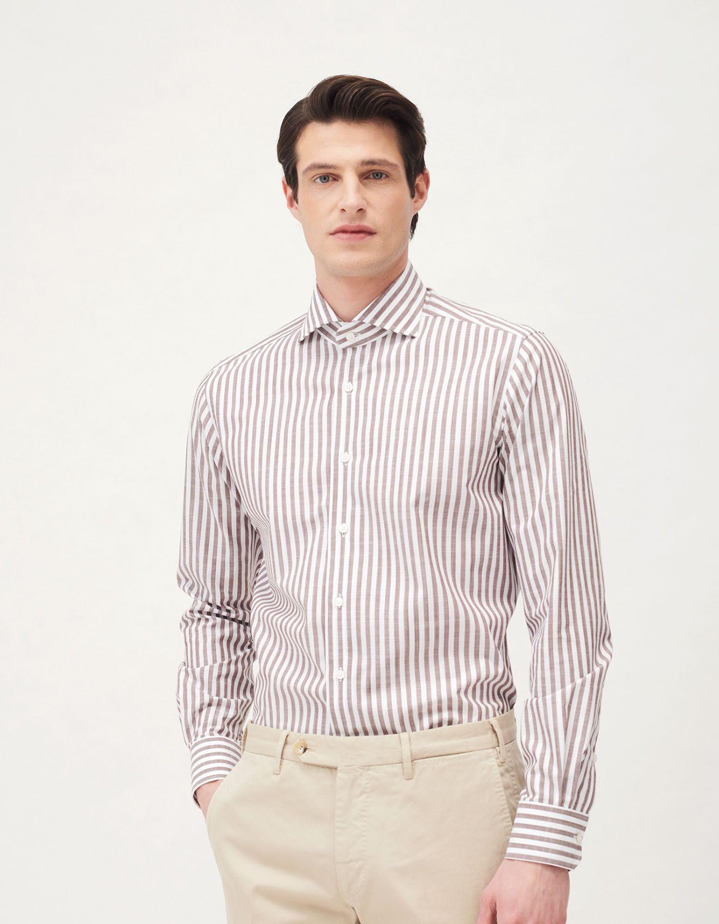 Camicia uomo con collo francese con interni rigidi ideale per abbinamenti piu' formali e impeccabili, non disdegna un utilizzo casual e senza cravatta. Realizzata nella vestibilità intermedia tailor fit, questo capo rispetta la migliore tradizione di camiceria sartoriale. Cuciture ad un ago con 7 punti per centimetro, adesivi di prima qualità e gambo su ogni bottone per una migliore tenuta degli stessi, sono solo alcuni dei dettagli che rendono questa camicia insostituibile nel guardaroba maschile.