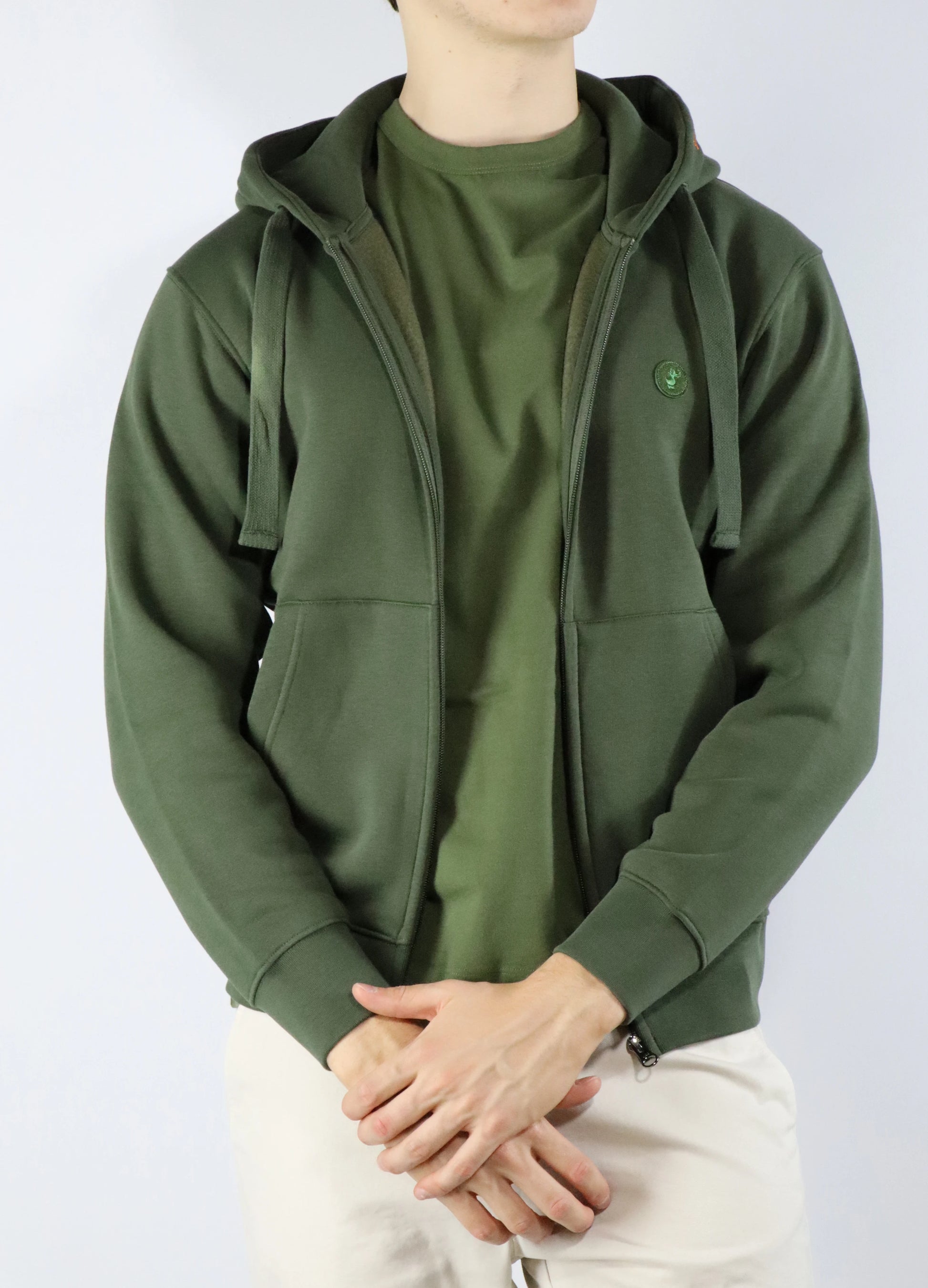 Felpa aperta con zip e cappuccio, due tasche applicate sul davanti, logo in tinta, vestibilità regolare