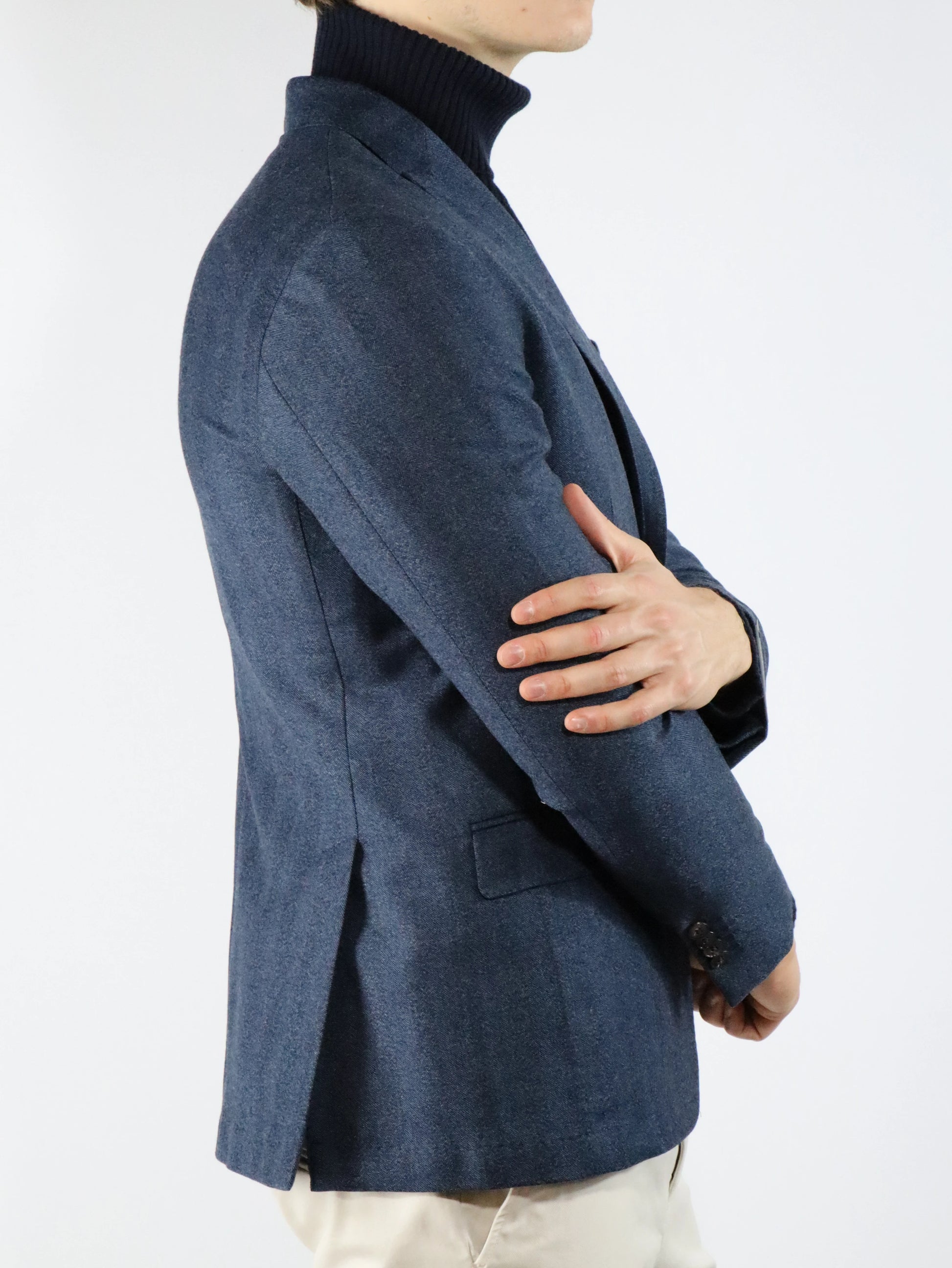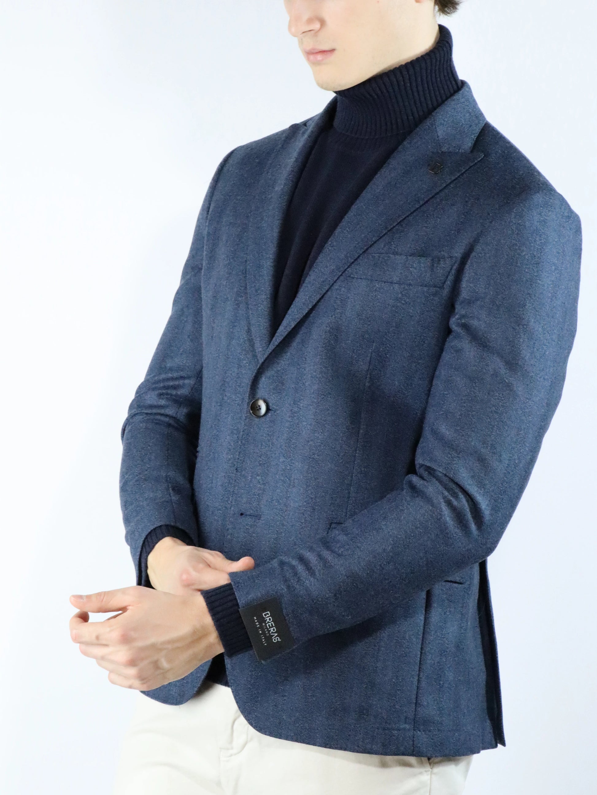 Giacca da uomo realizzata in pura lana con effetto a spina. Il capo si caratterizza da pratiche tasche a toppa, taschino sul petto a barchetta, rever con punta a lancia, spacchi laterali e doppio taschino interno. Completamente sfoderata per il massimo confort. Made in Italy