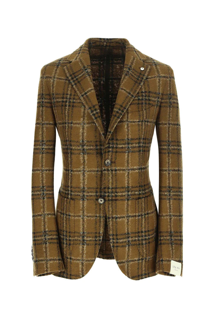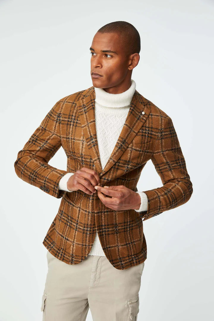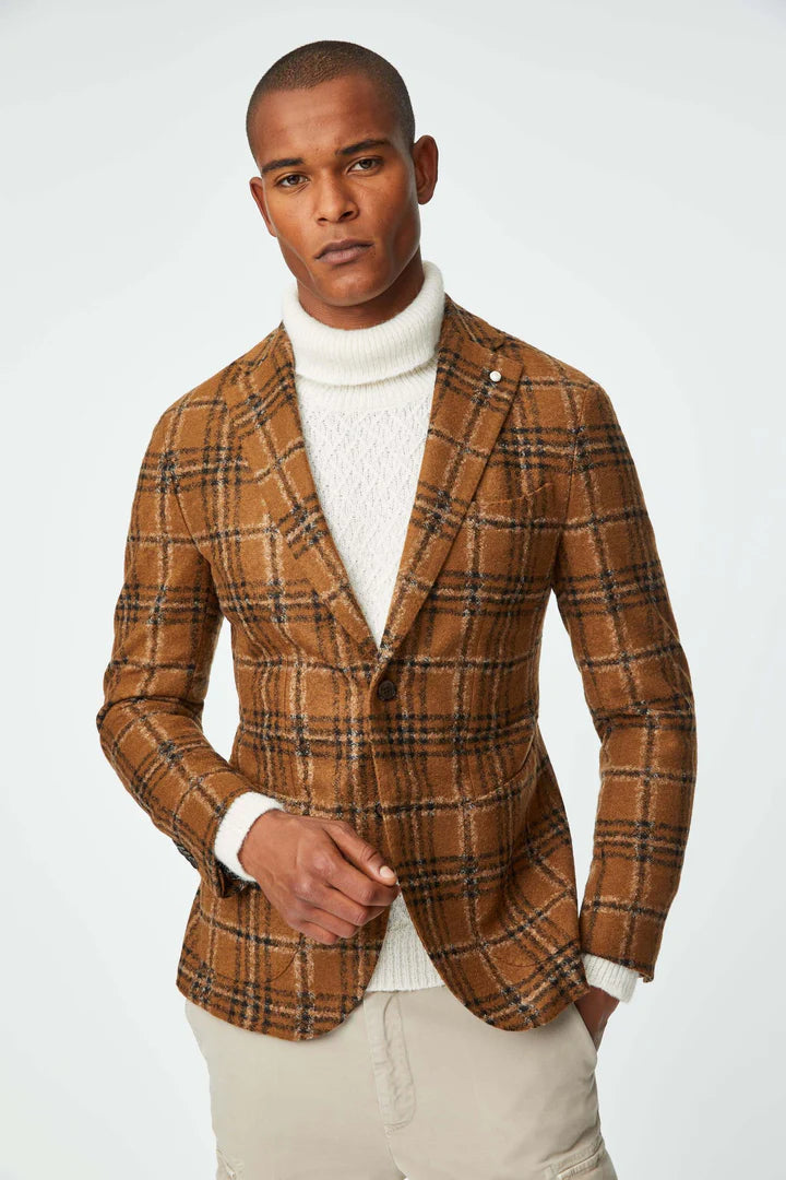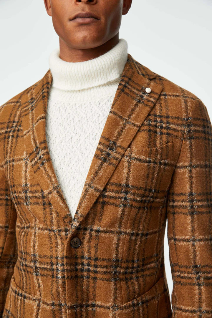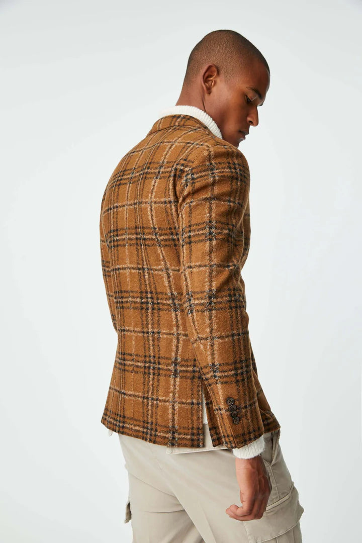 Giacca in jersey elasticizzato in principe di galles, chiusura a due bottoni, doppio spacco laterale, due tasche applicate sul davanti, vestibilità regolare.