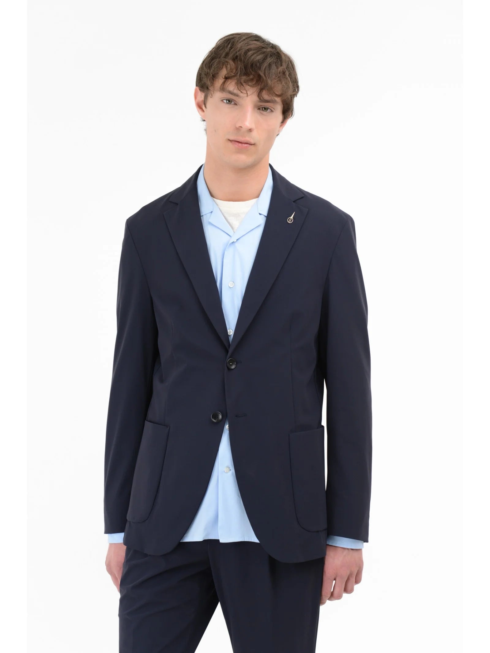 Giacca "tecnica" semifoderata, monopetto due bottoni, tasche a toppa sul davanti, spacchi laterali, bottoni fondo manica. Lunghezza su tg. 50 cm 74. Tessuto altamente elastico, realizzato con elastomero e poliammide riciclata, resistente alle pieghe, protezione dai raggi UV, Bi-Stretch.