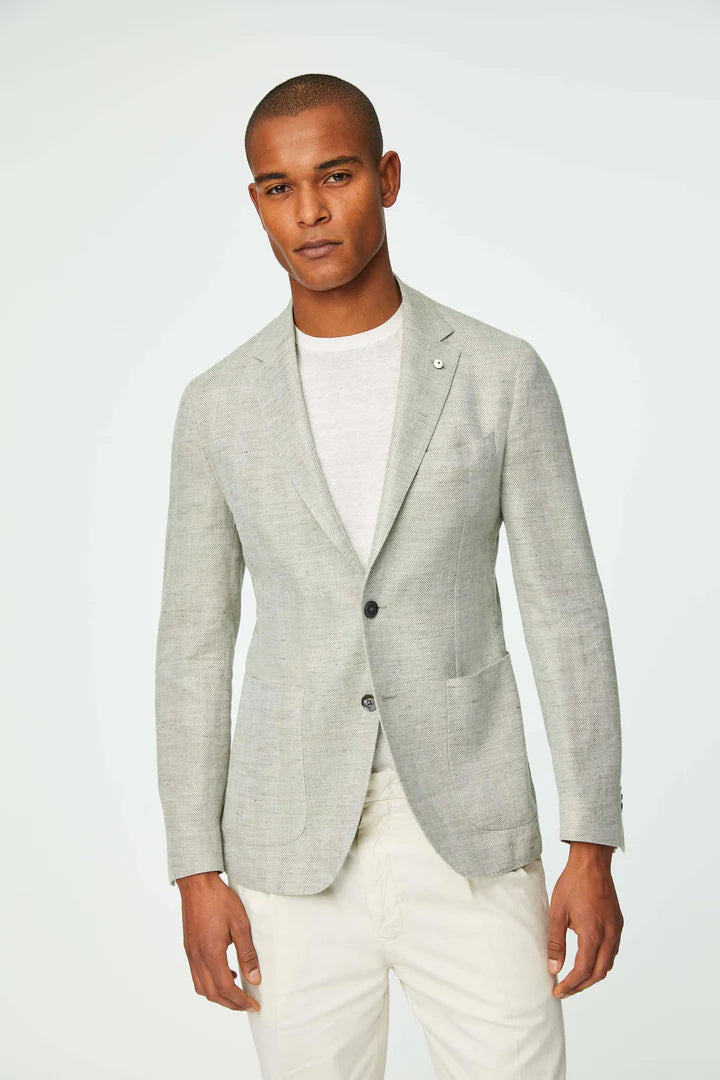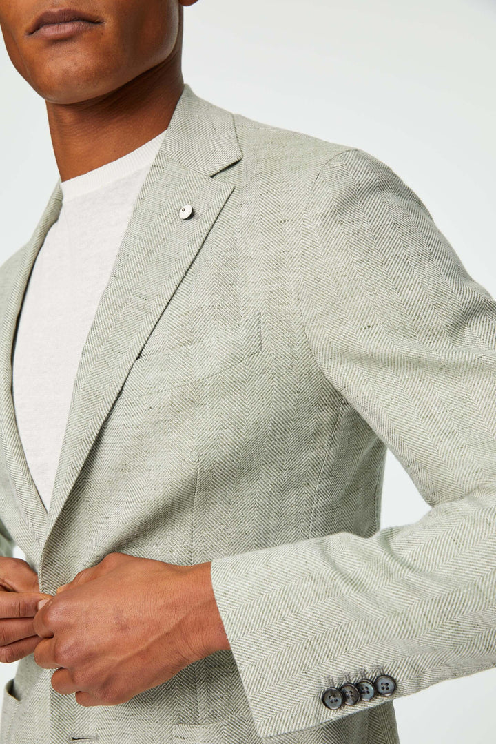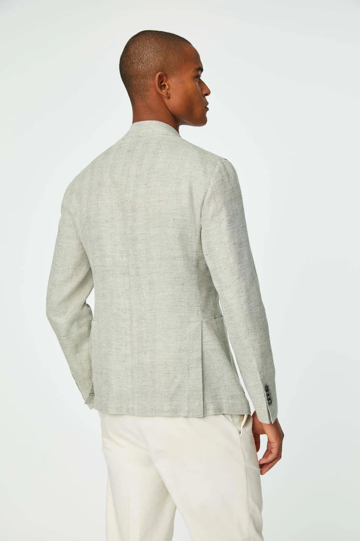 Giacca monopetto realizzata in una delicata mischia di cotone e lino che rende il capo leggero ma resistente. I colori leggeri del verde e del bianco uniti in fantasia spinata conferiscono movimento e rendono questa giacca un must have per le stagioni meno fredde.