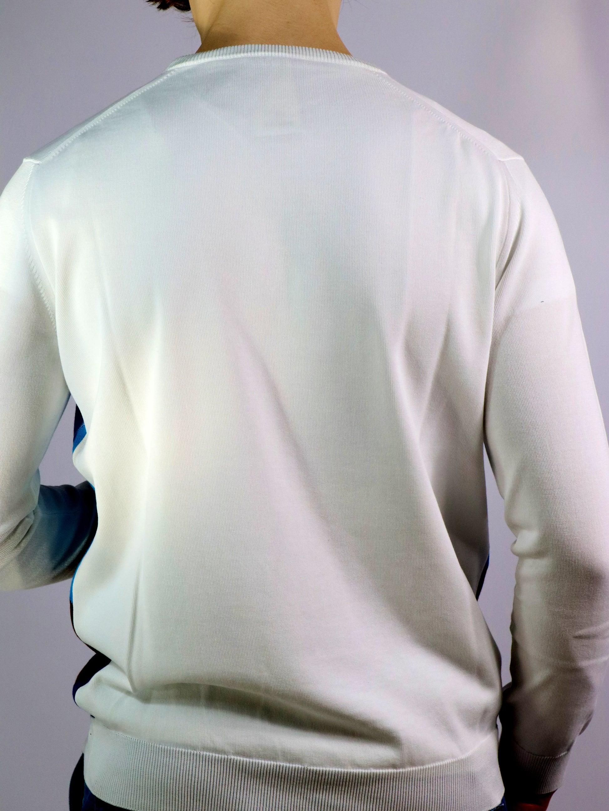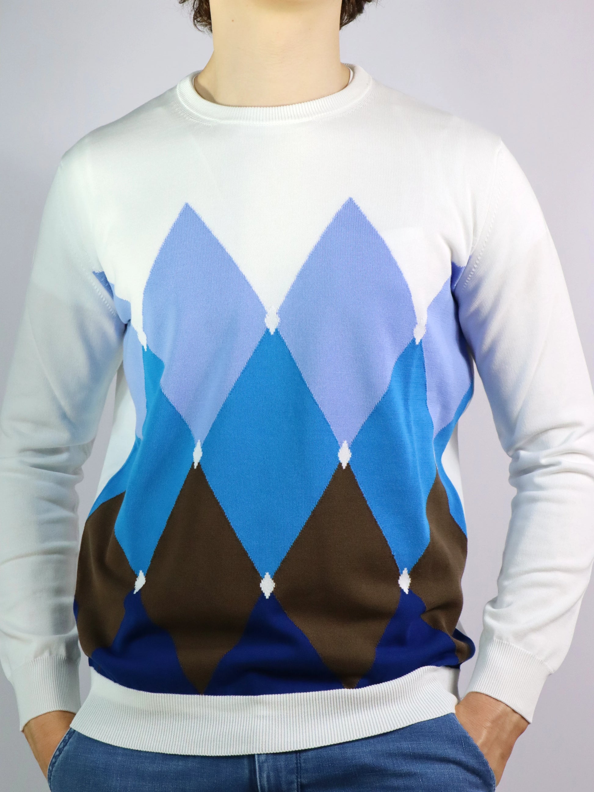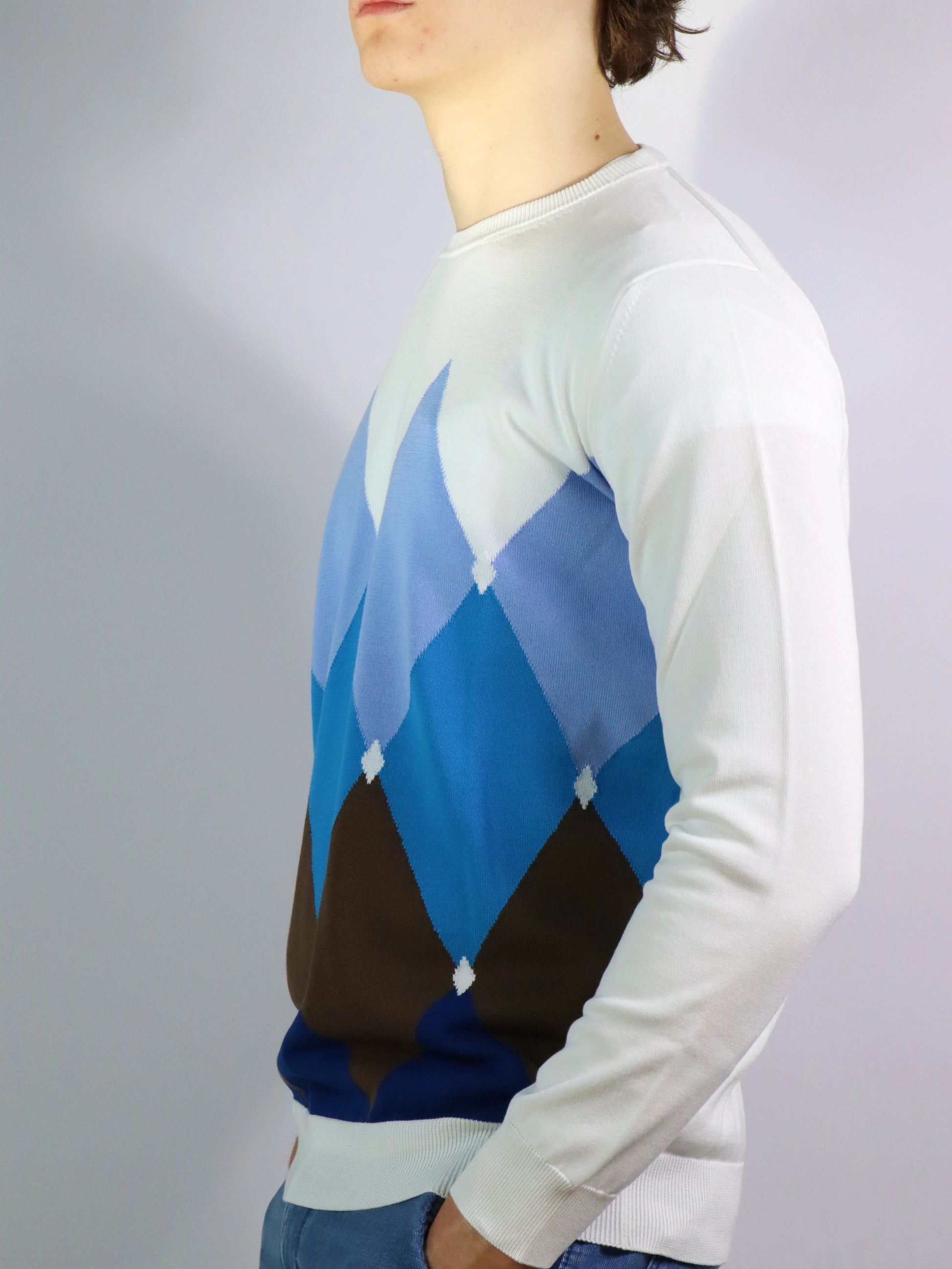 Maglia in cotone girocollo con motivo a losanghe, fondo e polsi a costine, vestibilità regolare, made in Italy.