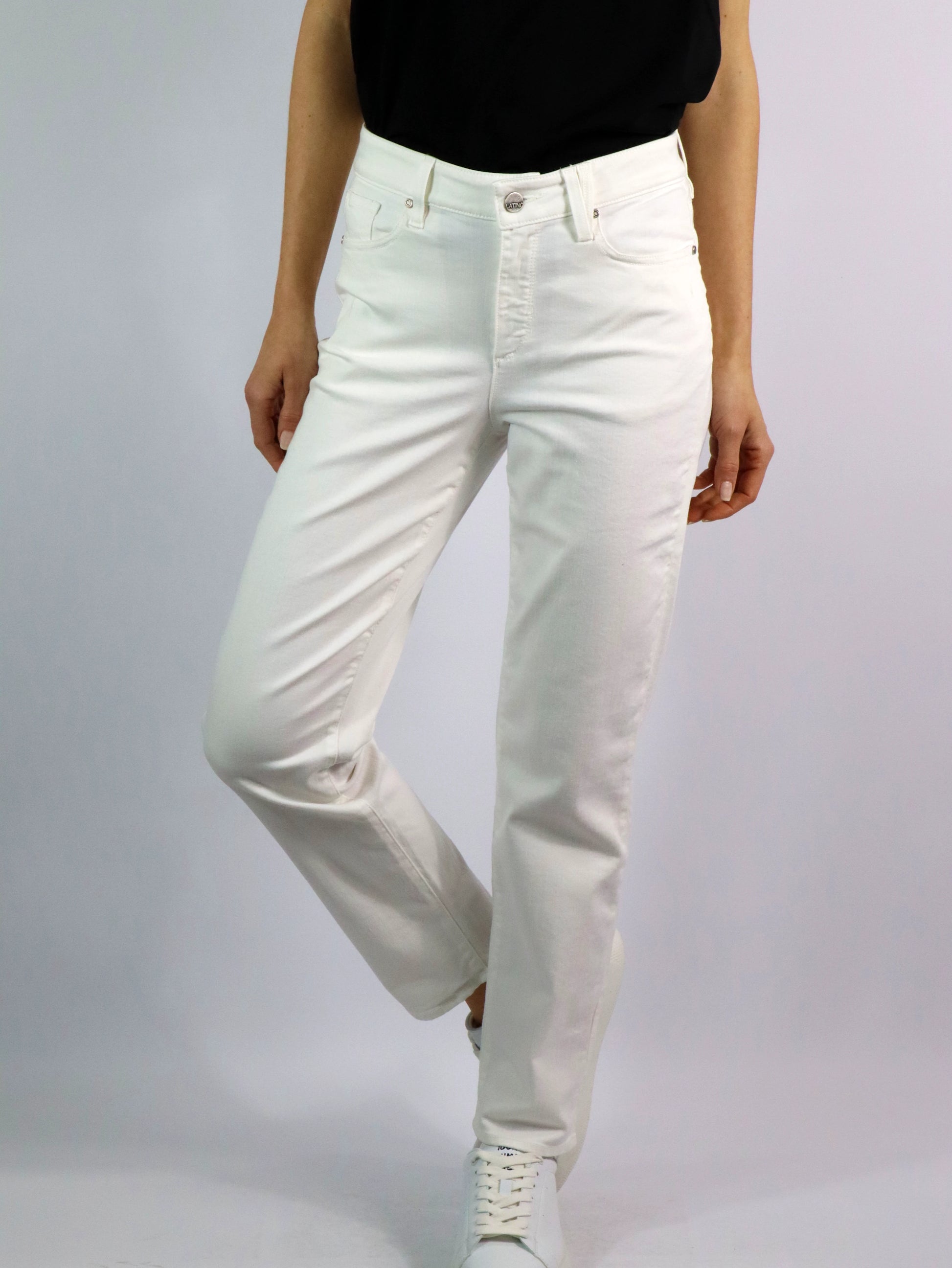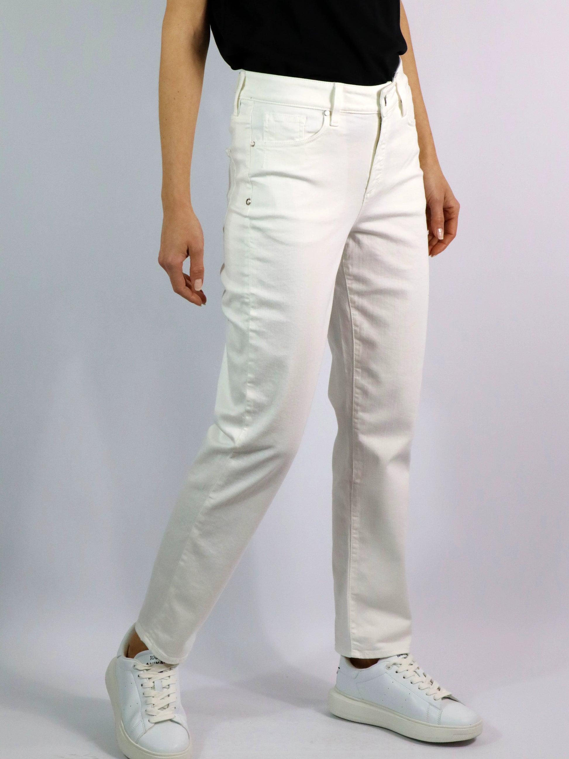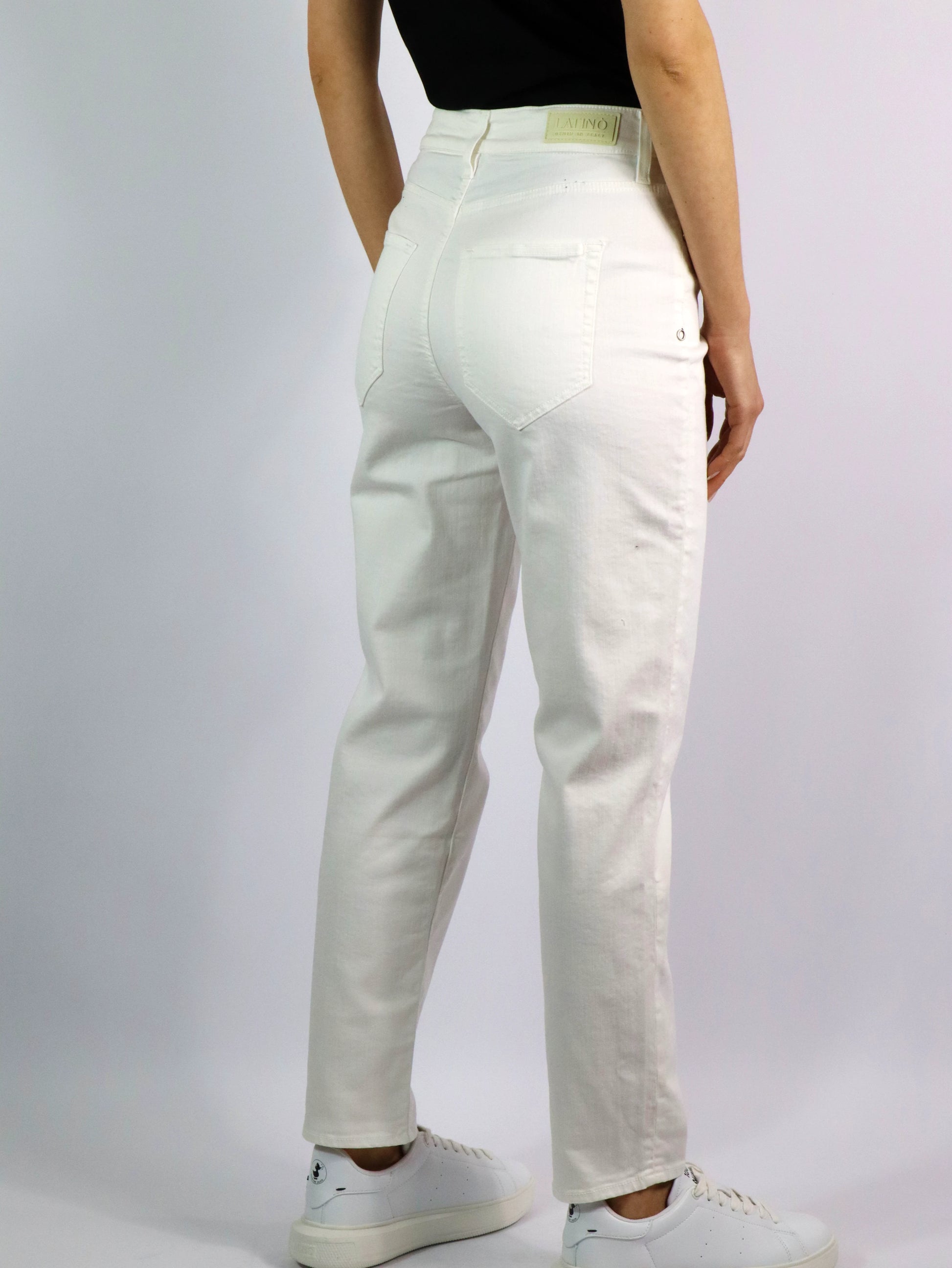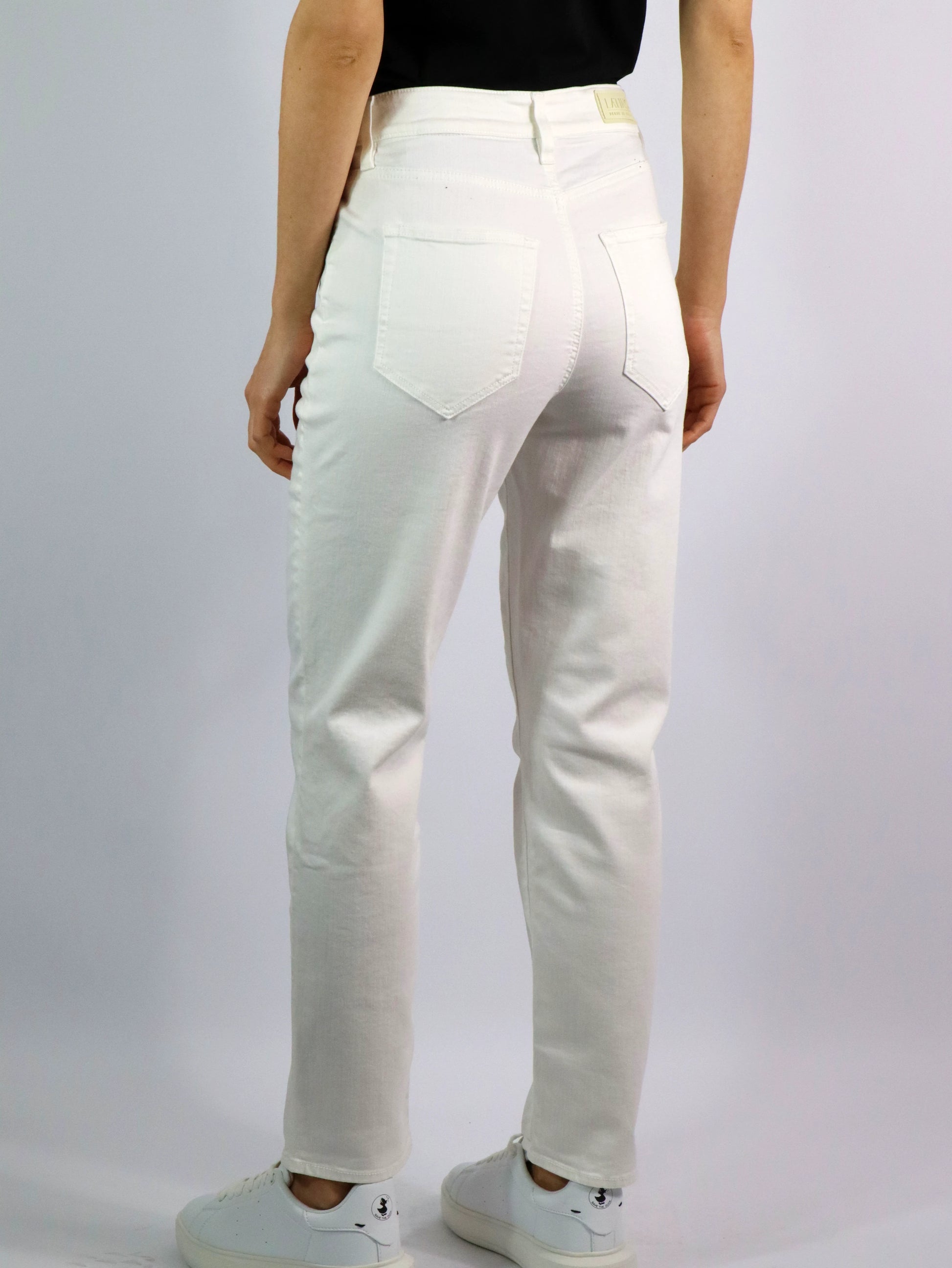 Jeans bianco in bull di cotone elasticizzato, vita medio alta, linea semi aderente, Made in Italy.