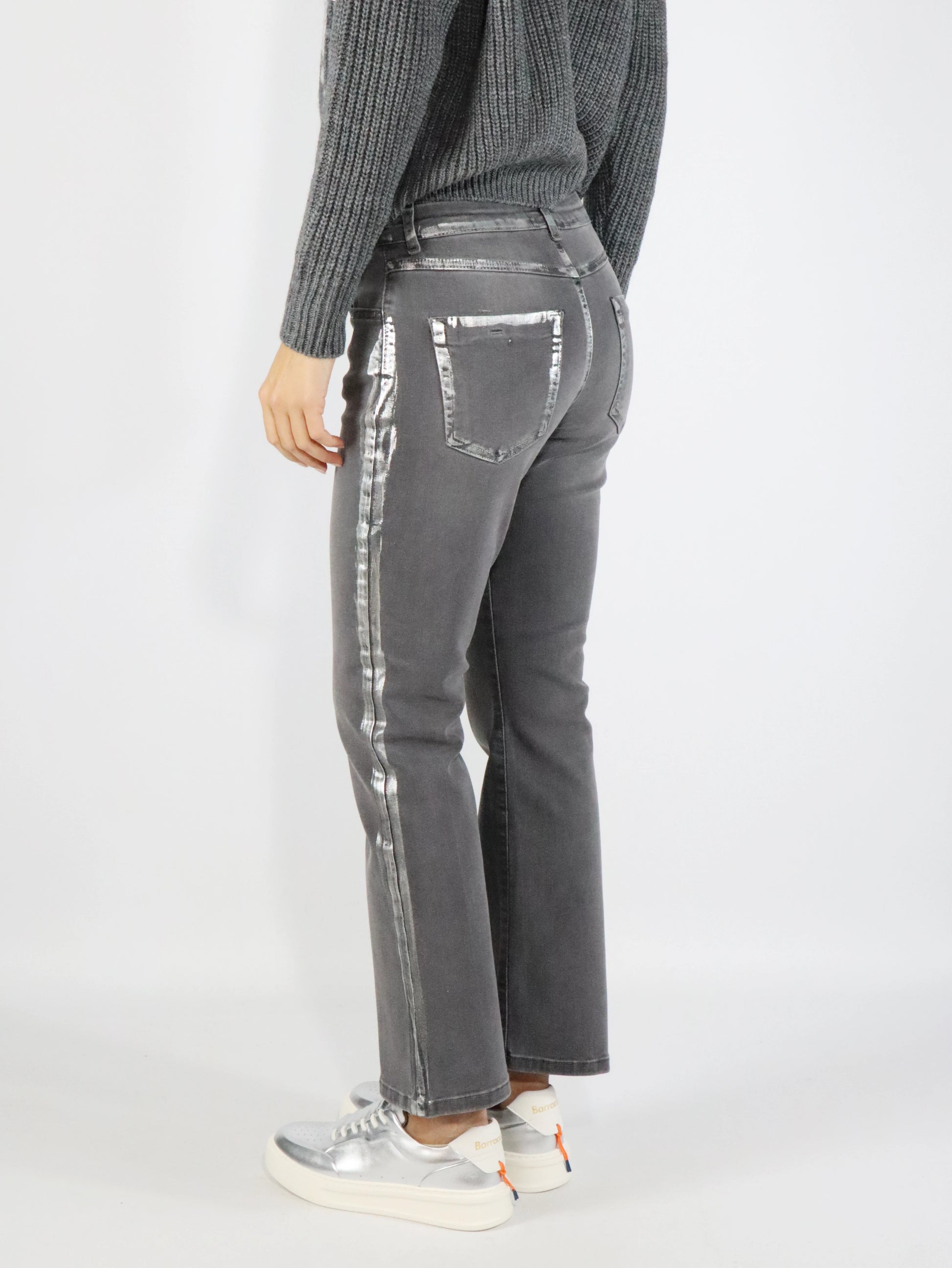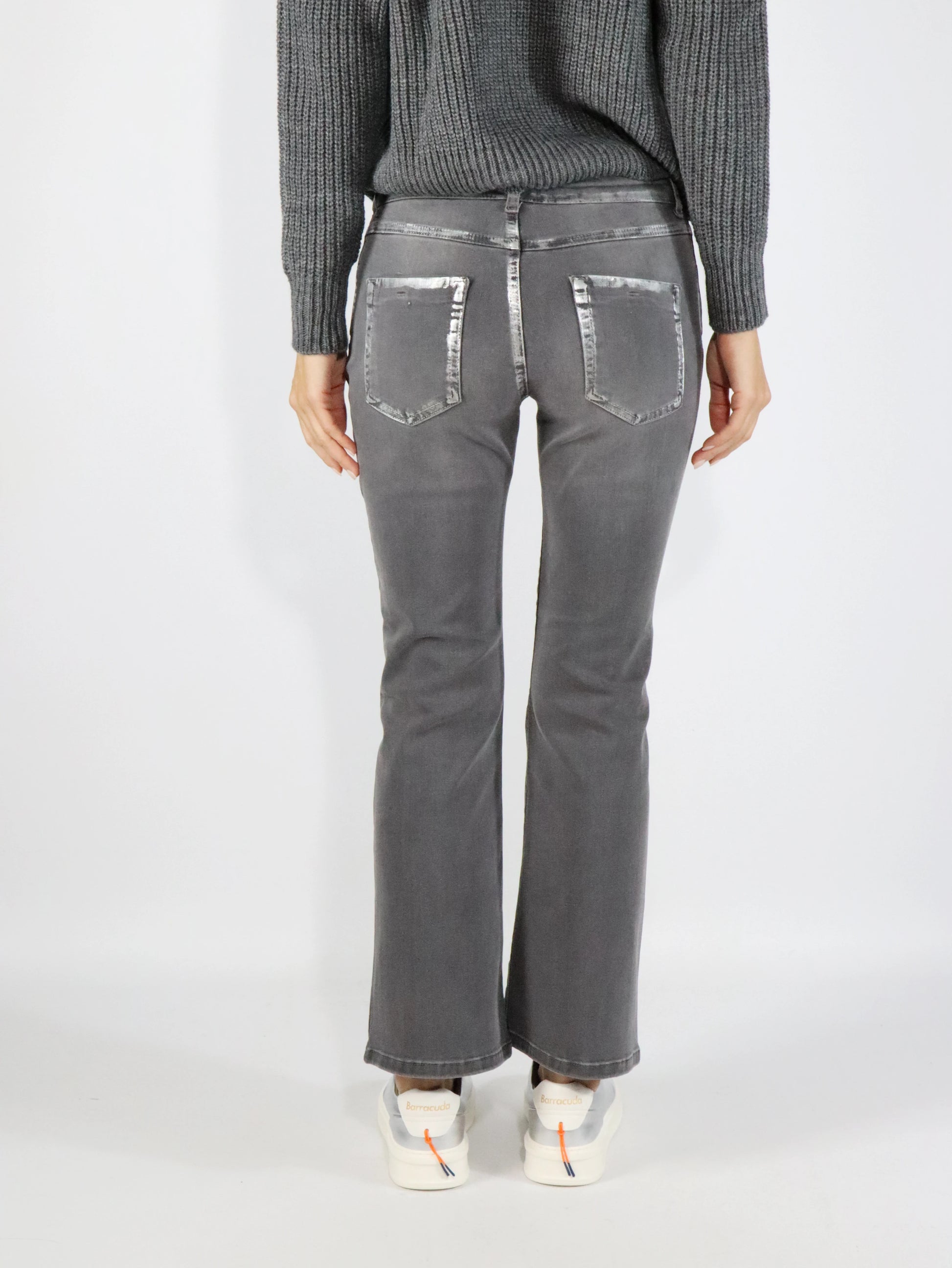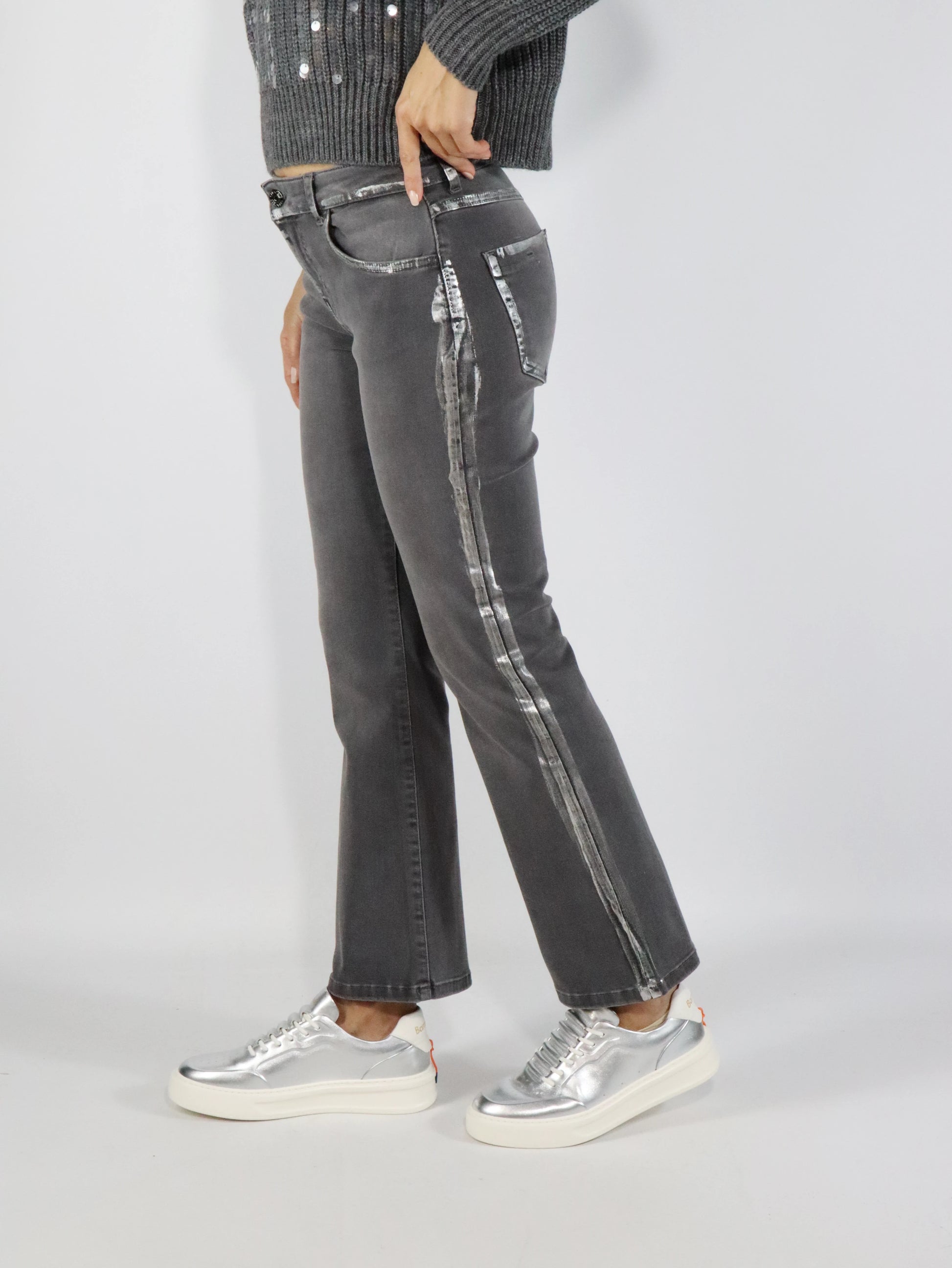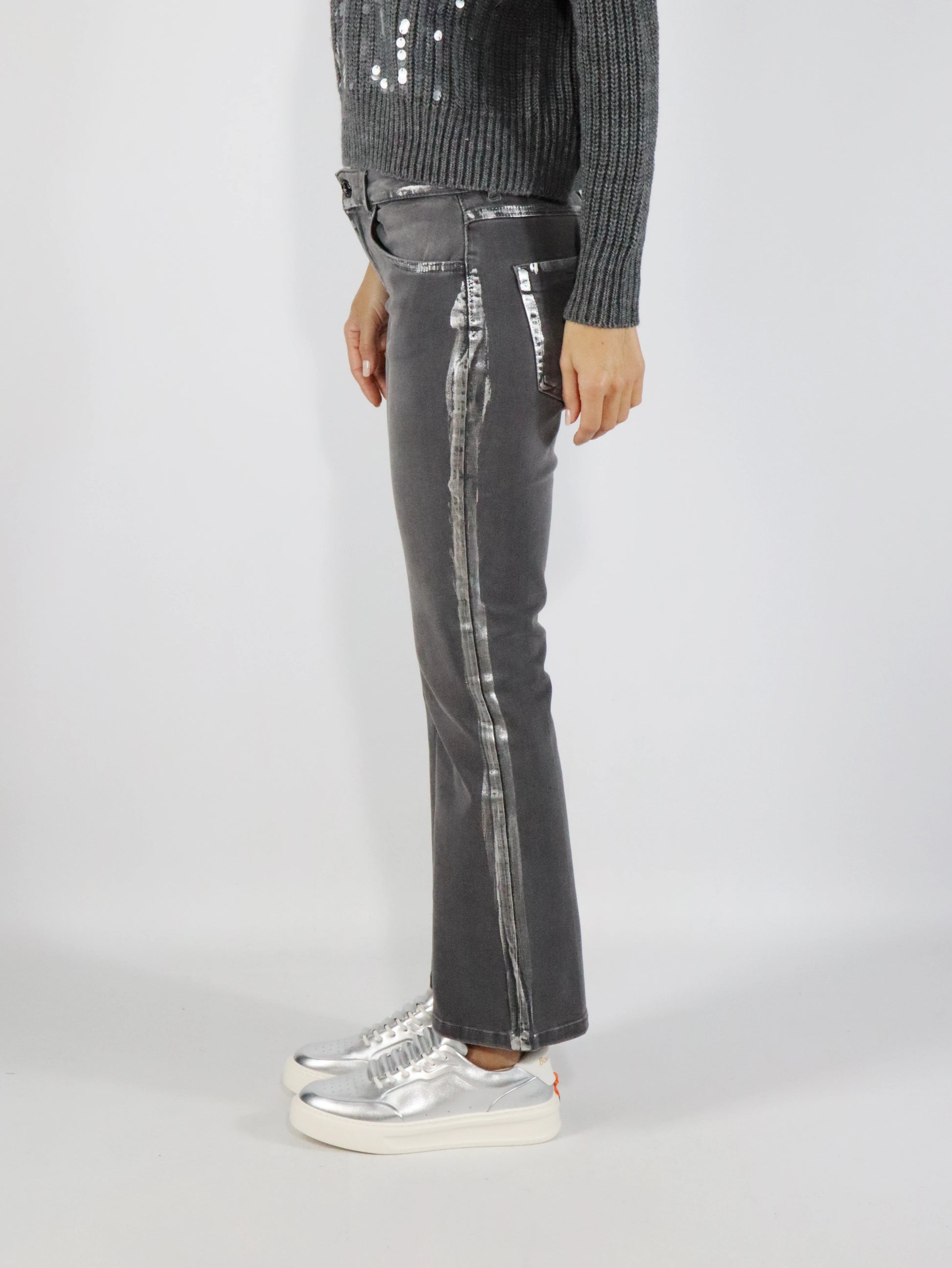 Jeans cinque tasche in denim di cotone stretch con effetto spalmato argento. Linea trumpet. Chiusura con bottone a chiodo e zip nascosta.