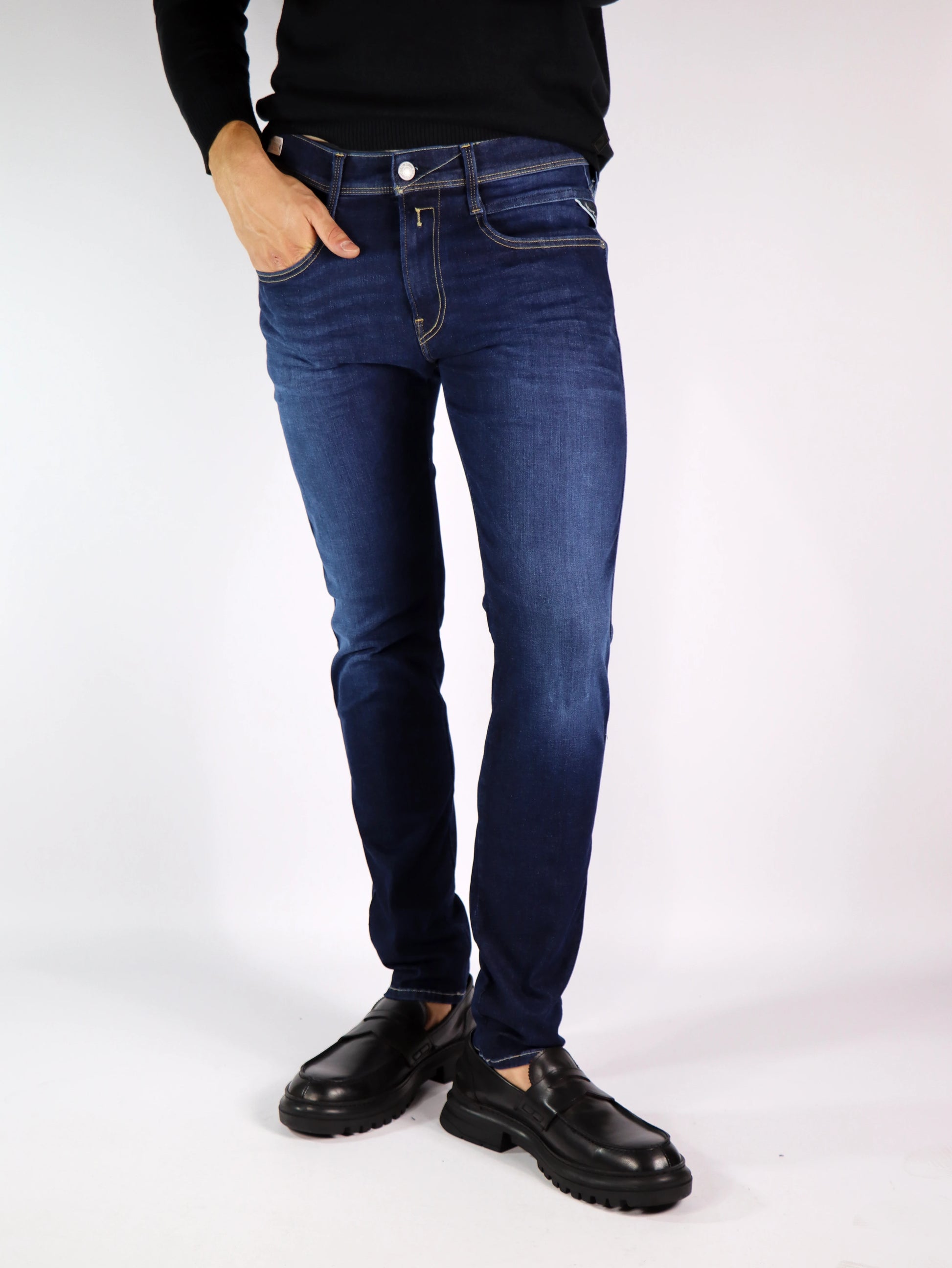 Jeans slim fit con vita regolare e gamba morbida più affusolata verso il fondo per una vestibilità comoda. Il modello dal look minimale e pulito è realizzato in denim di cotone Hyperflex reform riciclato a 360° 11,5 oz con tono di lavaggio scuro. Il capo cinque tasche si caratterizza per il trattamento enzimatico con baffatura e raschiatura che ricrea un effetto spazzolato con contrasti di colore nelle zone d'usura.