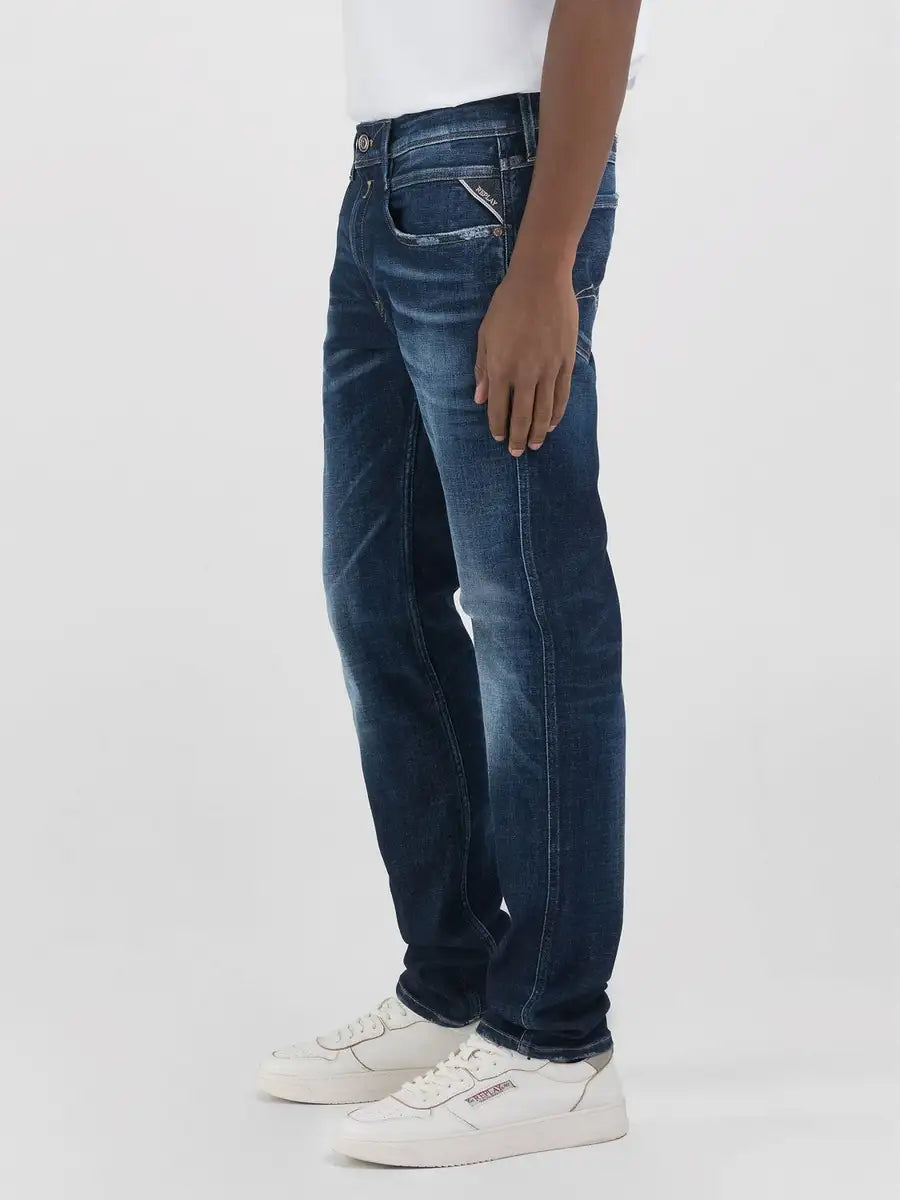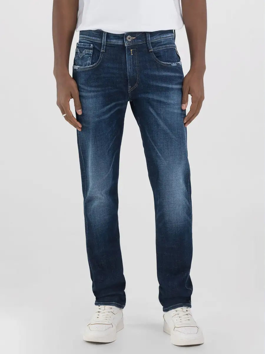 Jeans slim fit con vita regolare e gamba morbida più affusolata verso il fondo per una vestibilità comoda. Il modello è realizzato in power stretch denim blu profondo di misto cotone stretch 12 oz invecchiato 5 anni con tono di lavaggio scuro e asciugatura finalesu manichino. Il capo cinque tasche con abrasioni su tasche e fondo capo presenta inoltre baffi e carteggio eseguiti a mano che creano forti contrasti di colore sulle zone d'usura. Le piccole rotture aperte localizzate accentuano ulteriormente il carattere urban e contemporaneo di questo jeans da uomo. L'iconica cucitura ala di gabbiano caratterizza il quinto taschino e le tasche posteriori, una delle quali reca il ricamo R, mentre su una delle tasche frontali è presente un piccolo inserto personalizzato. Chiusura con bottone e zip.