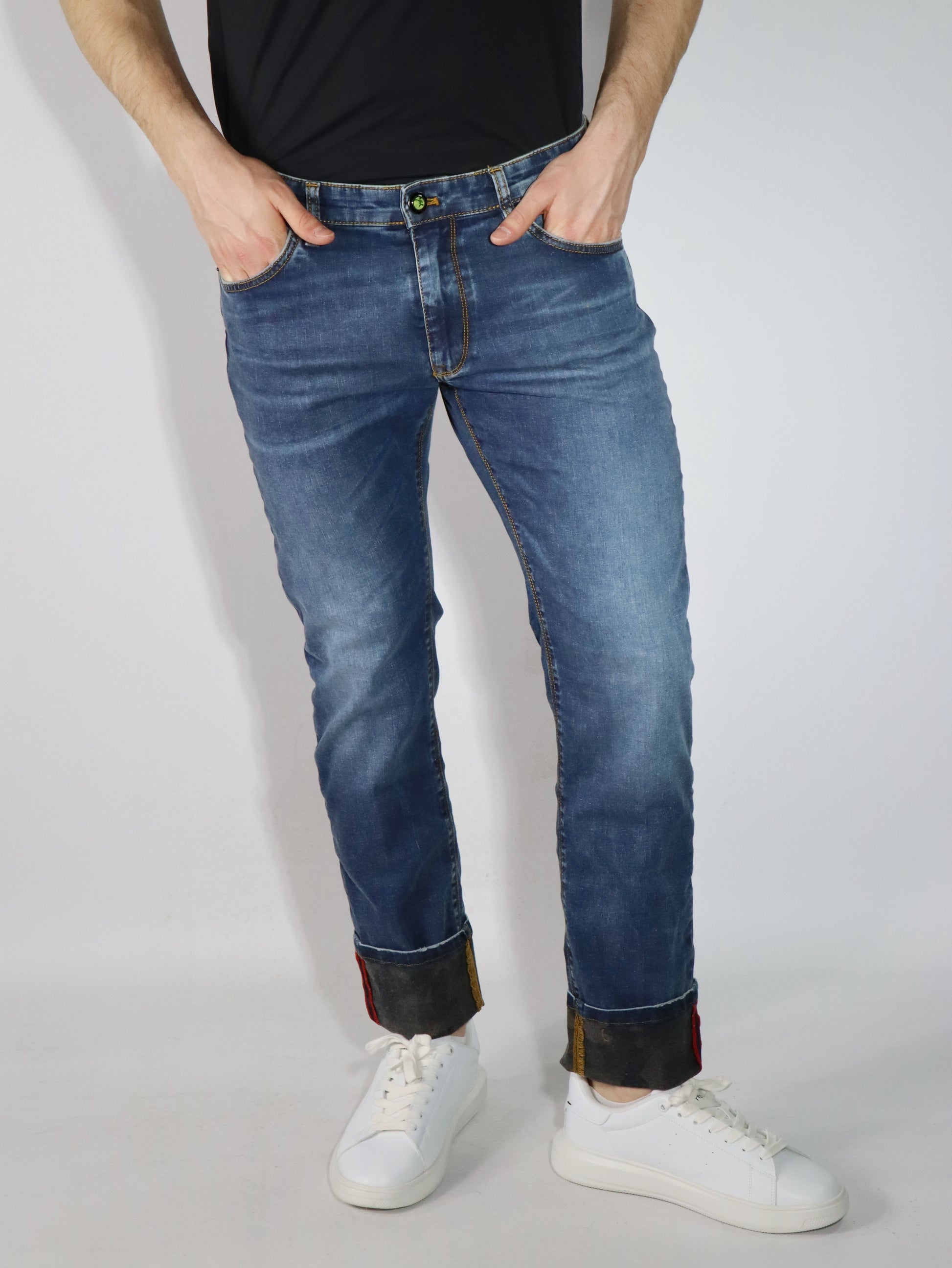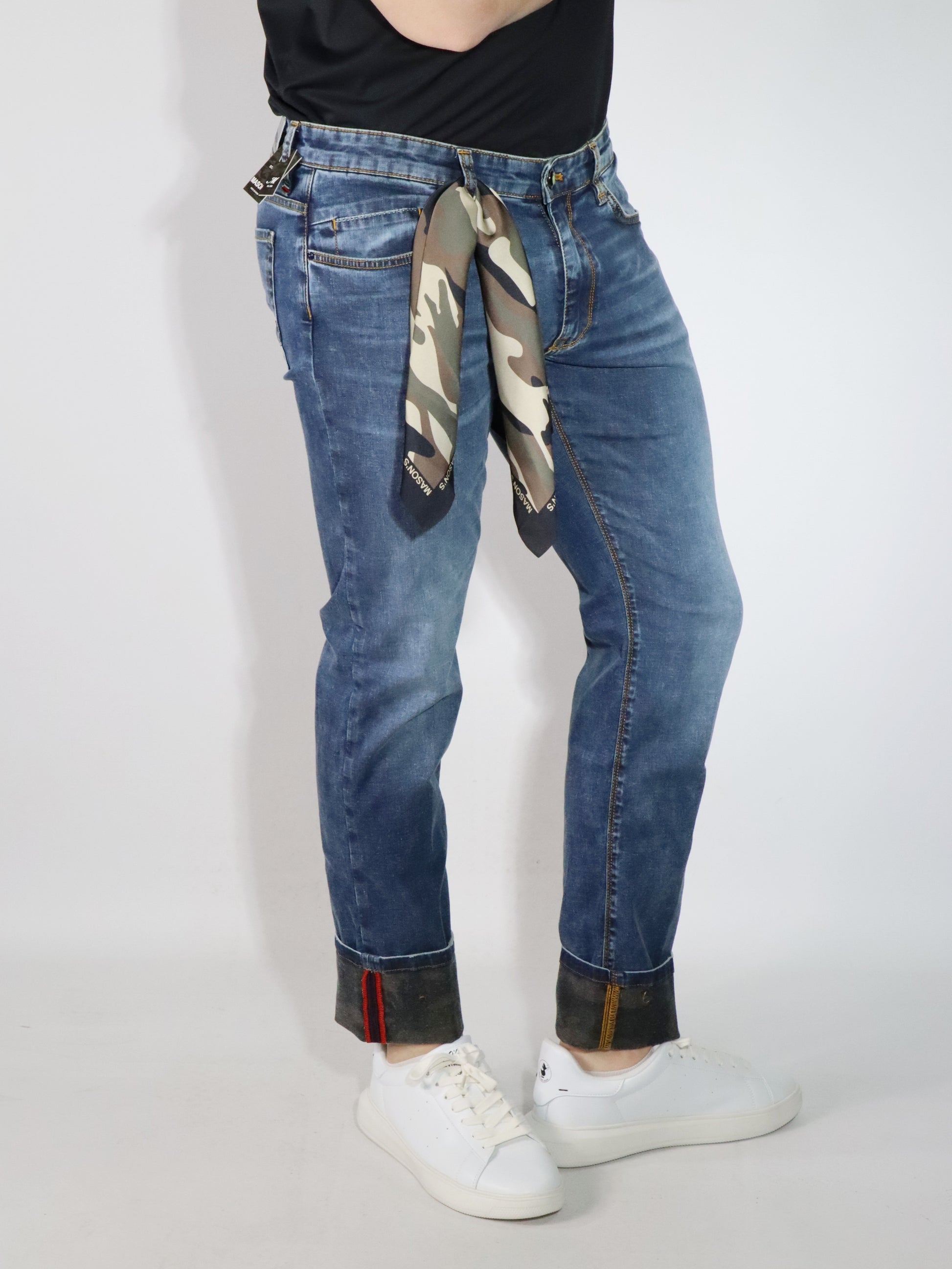L'estate è la stagione del denim, e i nostri pantaloni denim uomo modello Harris sono il trend del momento. Progettati per l'uomo moderno che apprezza un look casual, questi pantaloni in denim stretch rappresentano la fusione perfetta tra stile e comfort. Il blu navy intenso del tessuto è intervallato da un pattern mimetico, un dettaglio che aggiunge un tocco di personalità e distinzione. La tela del denim modello Harris è composta da una percentuale di memory elastan, una fibra stretch, che assicura durata e resistenza anche dopo molti utilizzi.