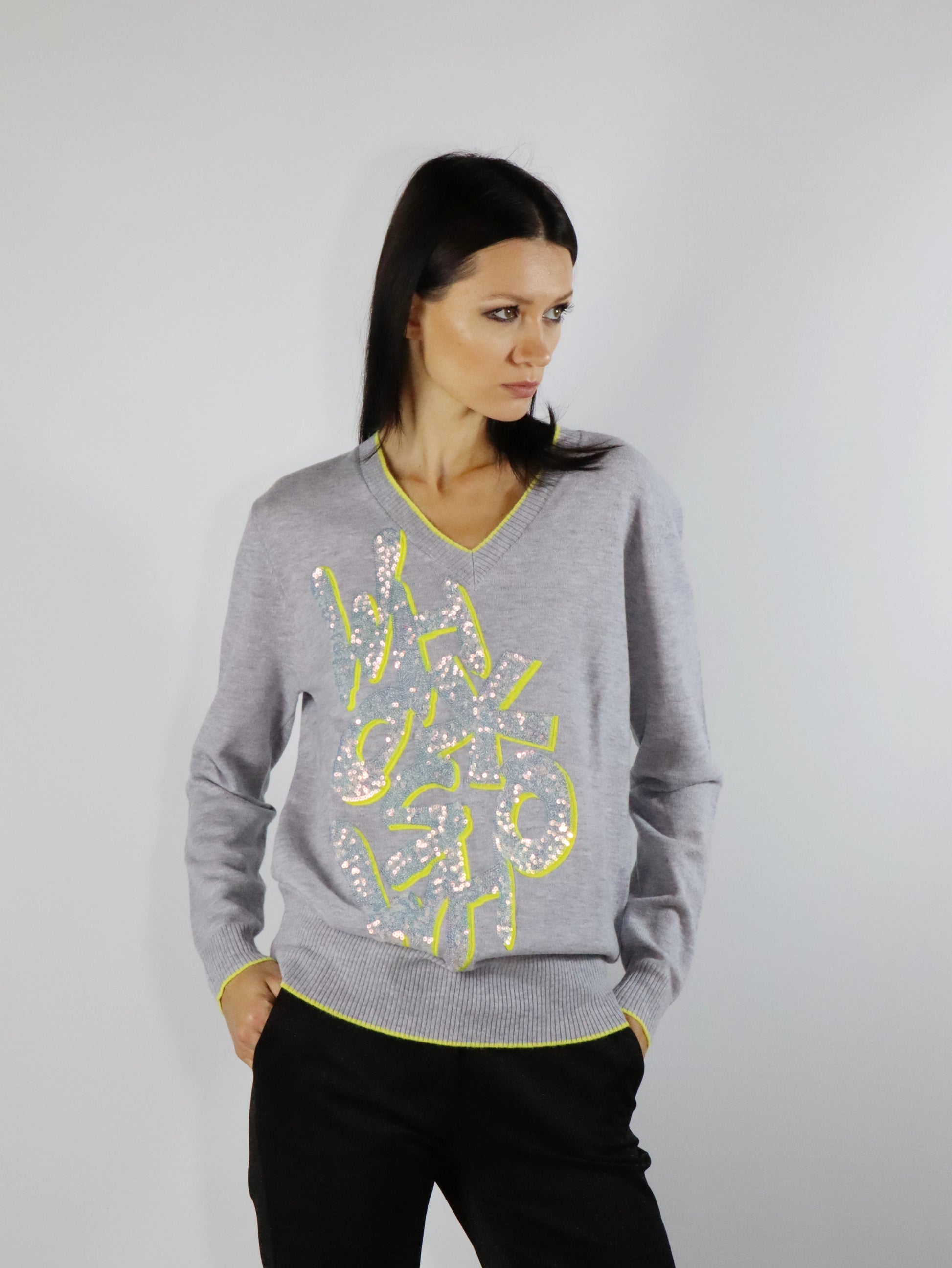 Maglia realizzata in pura lana con applicazioni di paillettes sulla parte anteriore, scollo a V, profilo a contrasto.