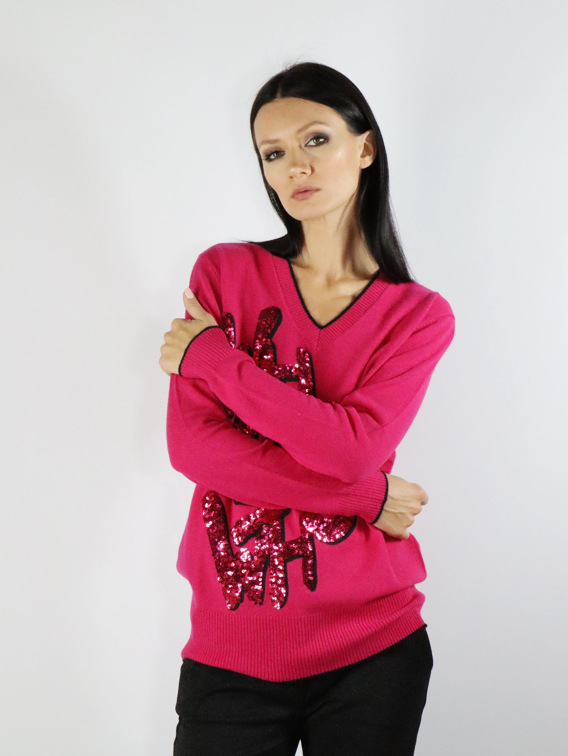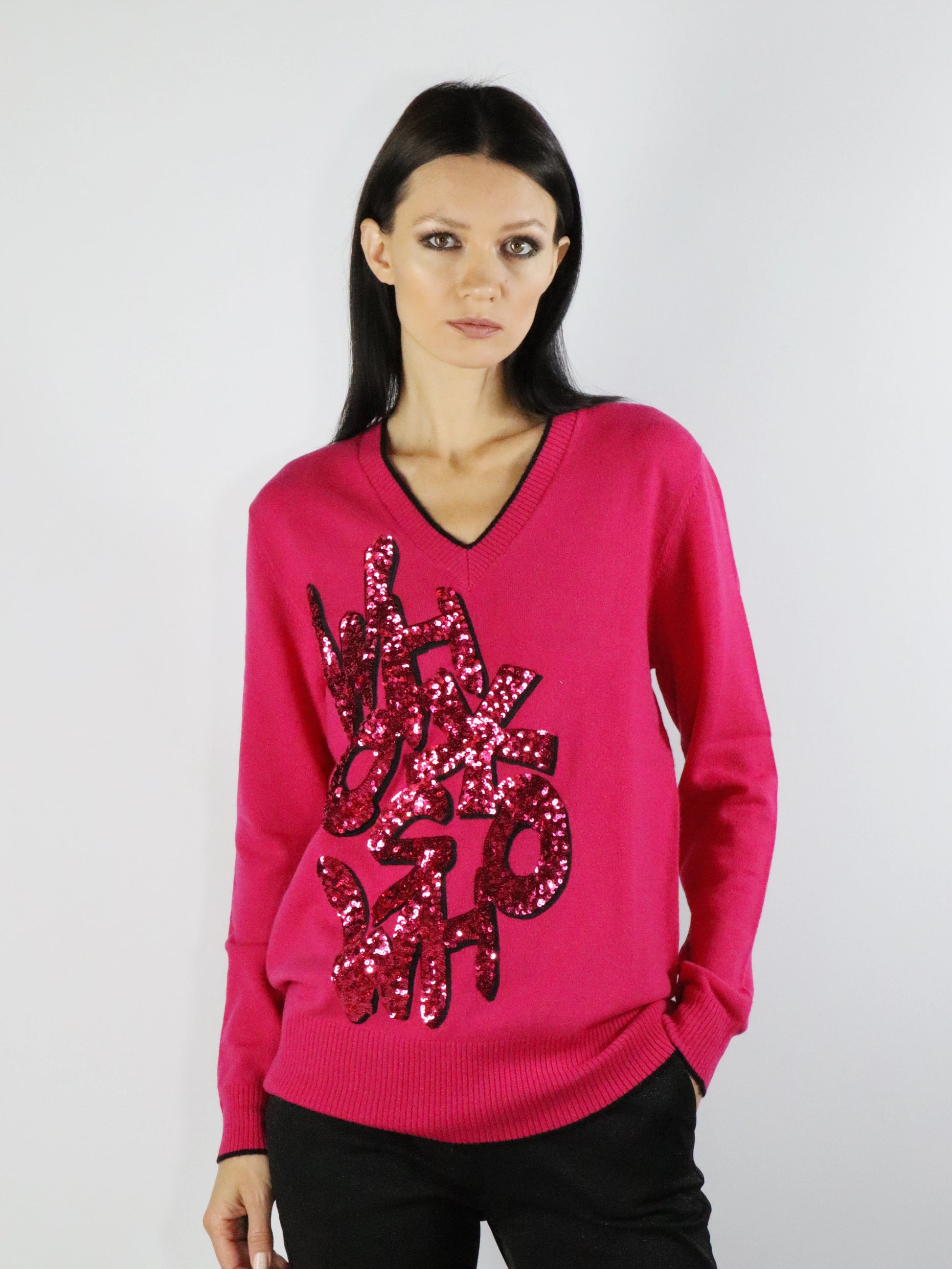 Maglia realizzata in pura lana con applicazioni di paillettes sulla parte anteriore, scollo a V, profilo a contrasto.