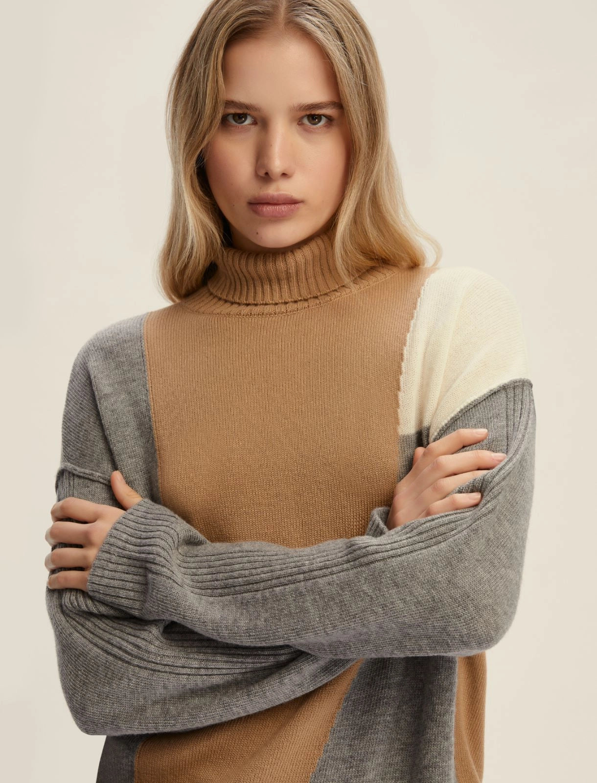 Oversize e grafica, questa maglia in misto lana mixa comfort e personalità con ampie geometrie colorate dall’effetto color block. Il collo alto e le proporzioni morbide la rendono perfetta per look urbani d’ispirazione artsy.