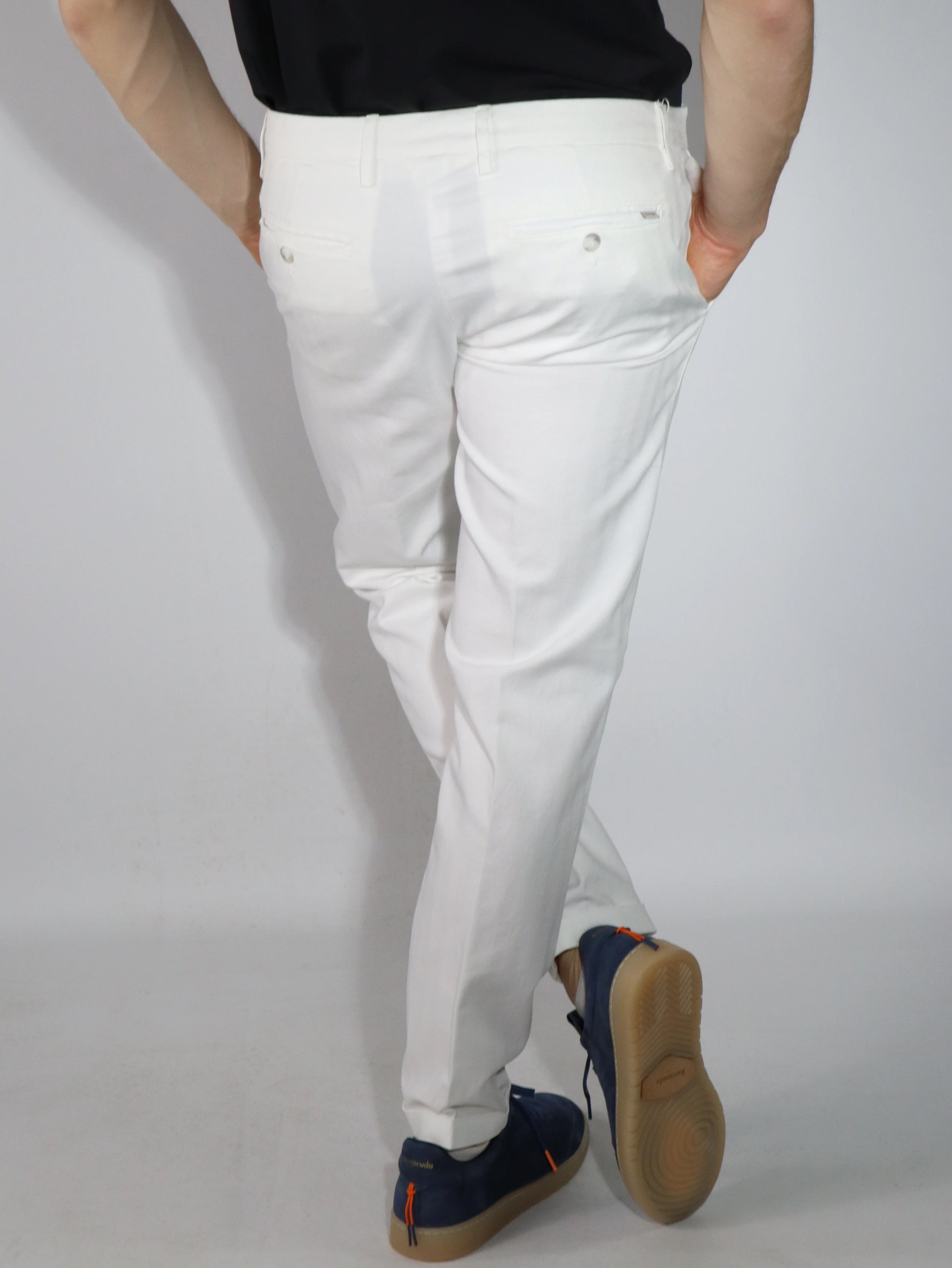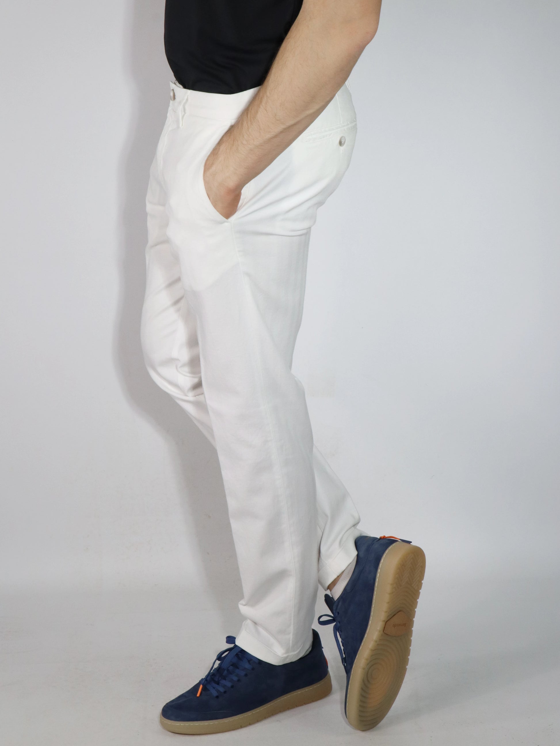 Pantalone chino realizzato in tessuto leggero in cotone e lino con effetto spinato. Risvolto al fondo vestibilità slim.