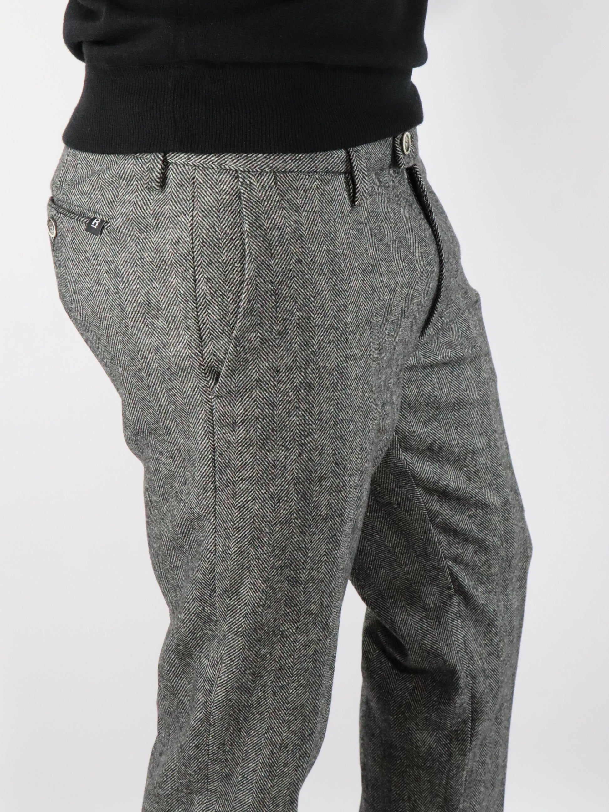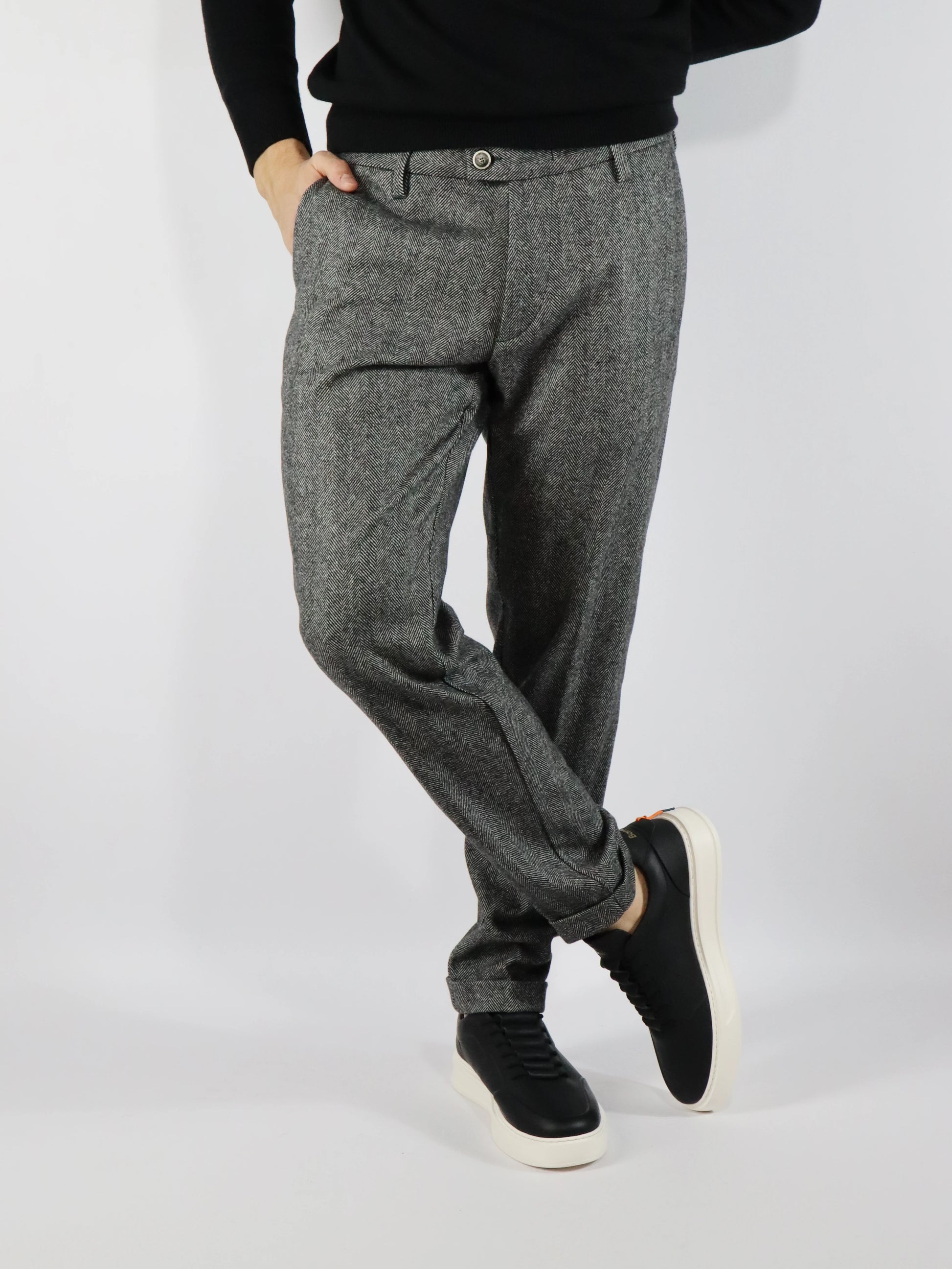 Pantalone realizzato in un caldo tessuto con effetto spinato, due tasche sul davanti due tasche sul dietro, fondo con rivolto. Made in Italy