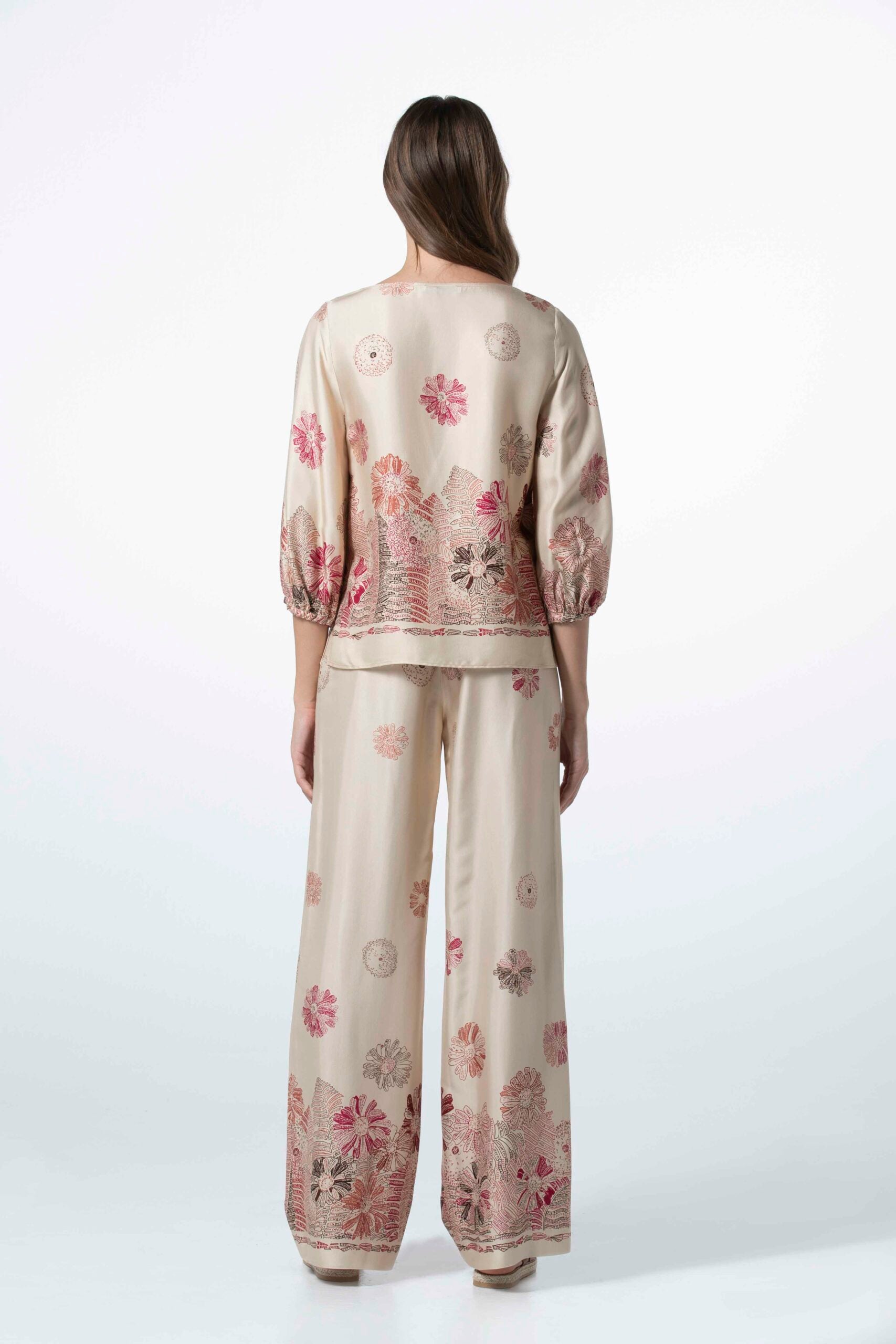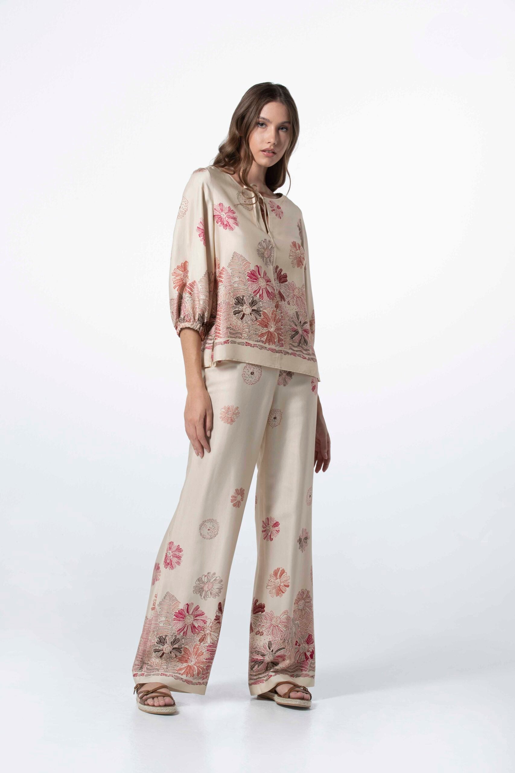 Pantalone a fantasia vita alta, gamba larga, chiusura con zip invisibile. Vestibilità morbia. Composizione: 100% Viscosa. La modella indossa una tg. 42. Altezza : 180 cm. Vita : 61 cm. Torace: 86 cm. Fianchi: 90 cm.