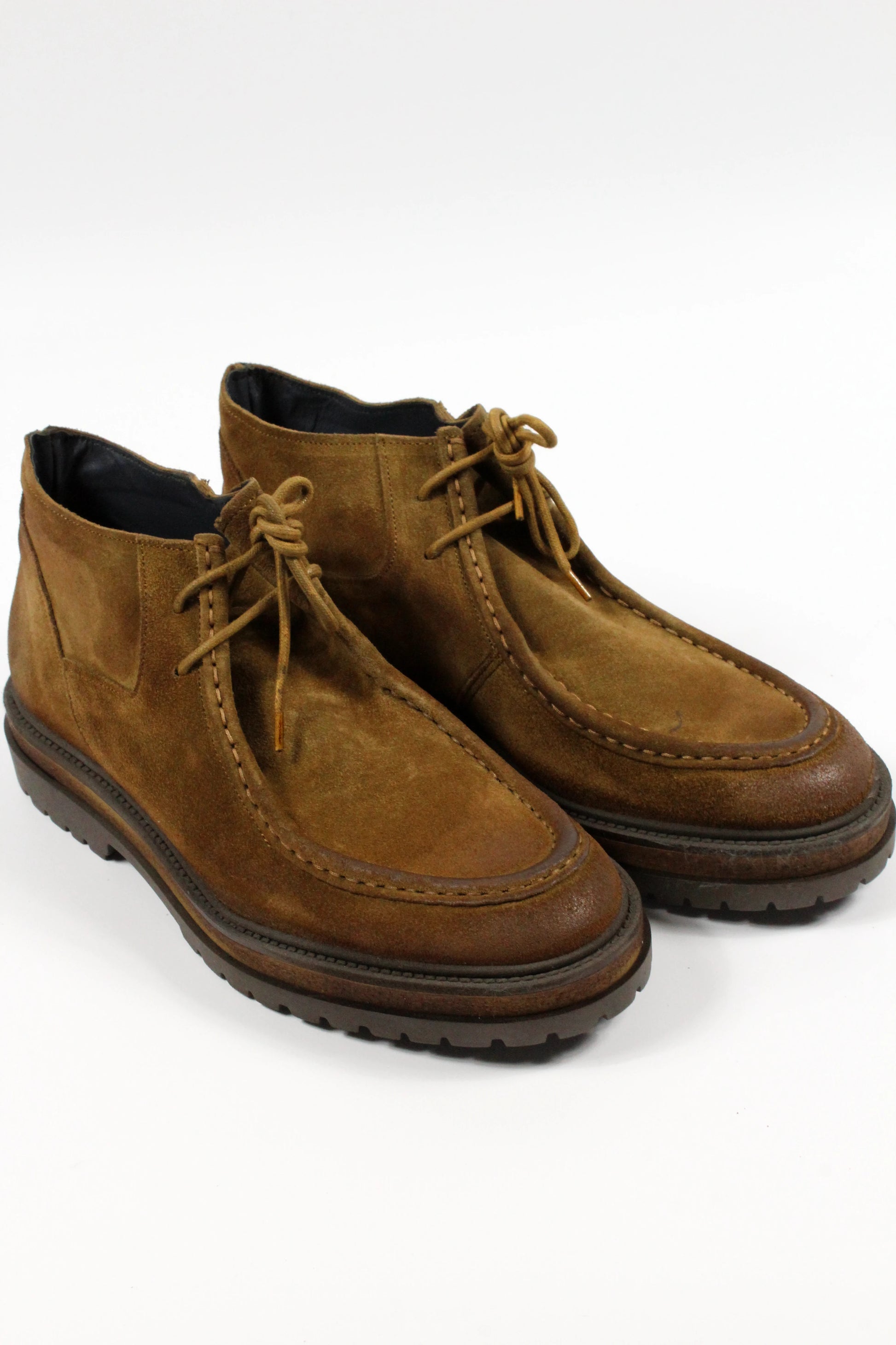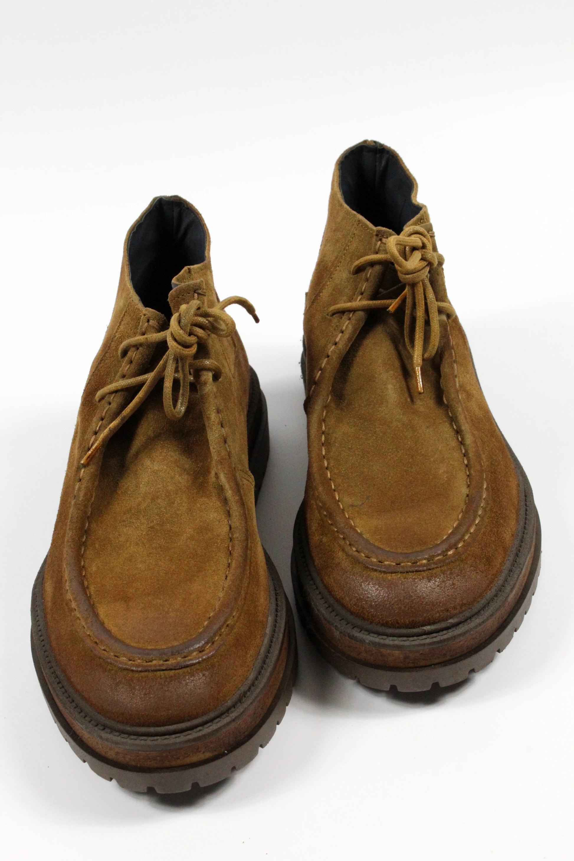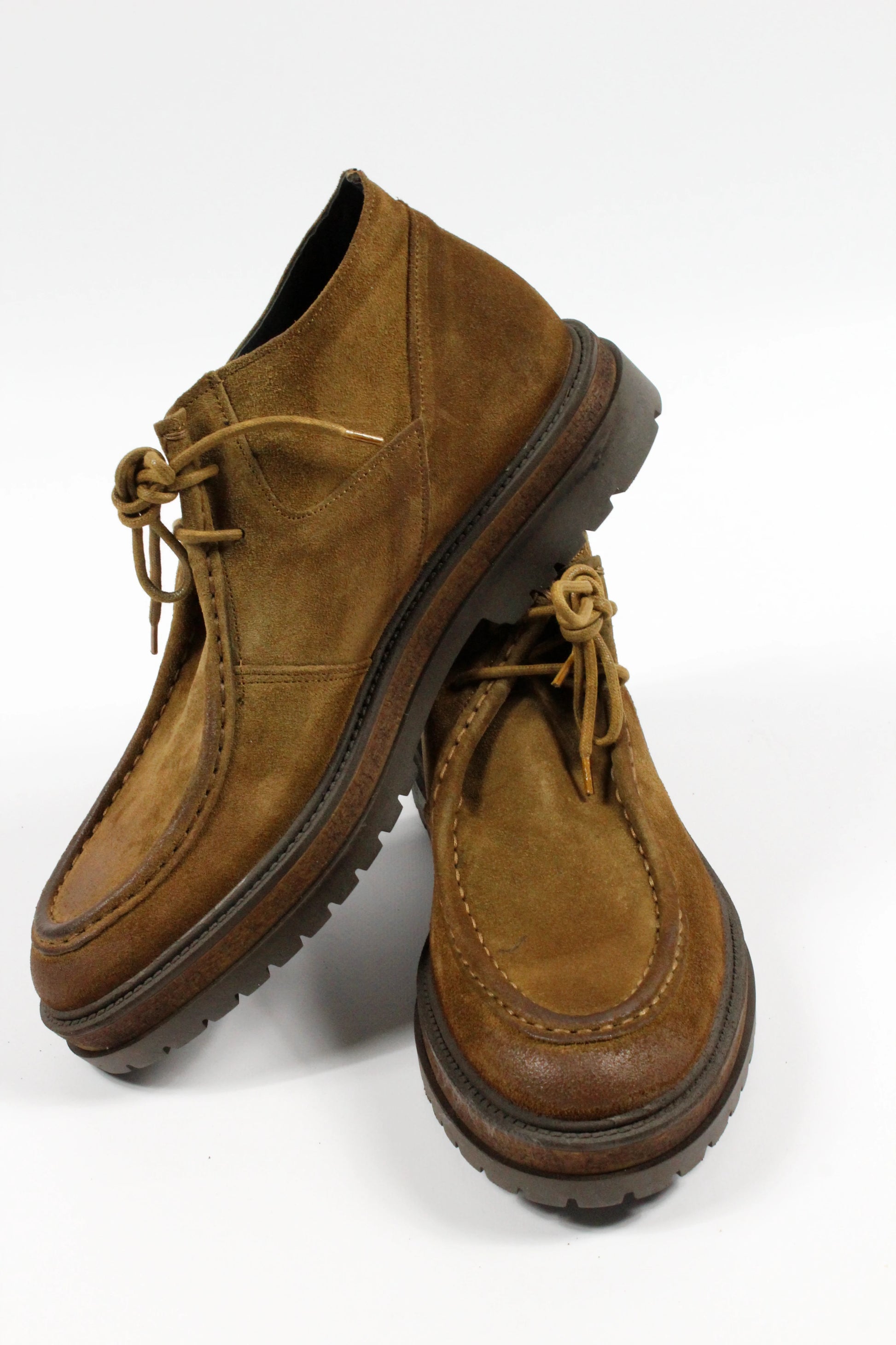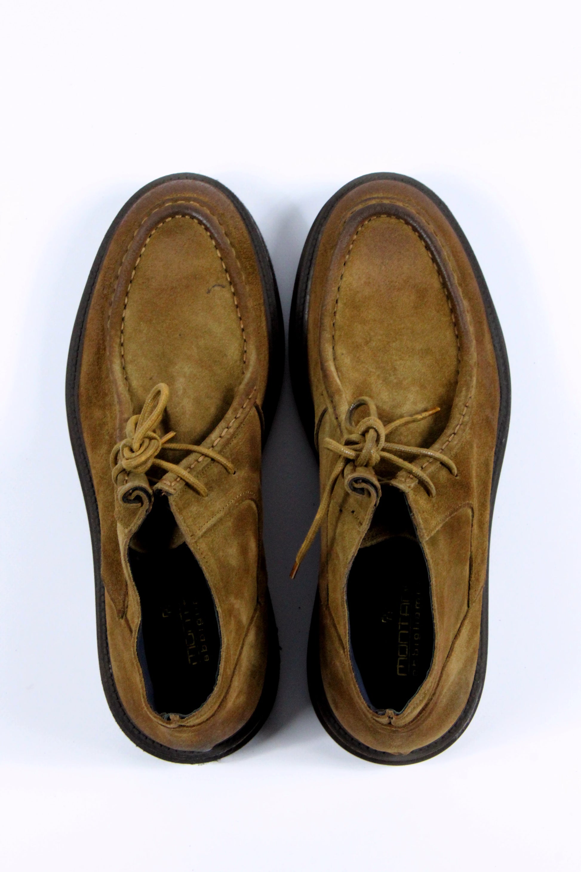 Scarpa in camoscio invecchiato color tabacco con lacci in tono, cuciture artigianali sulla punta e suola in gomma con carro-armato. Calzata regolare. Made in Italy.
