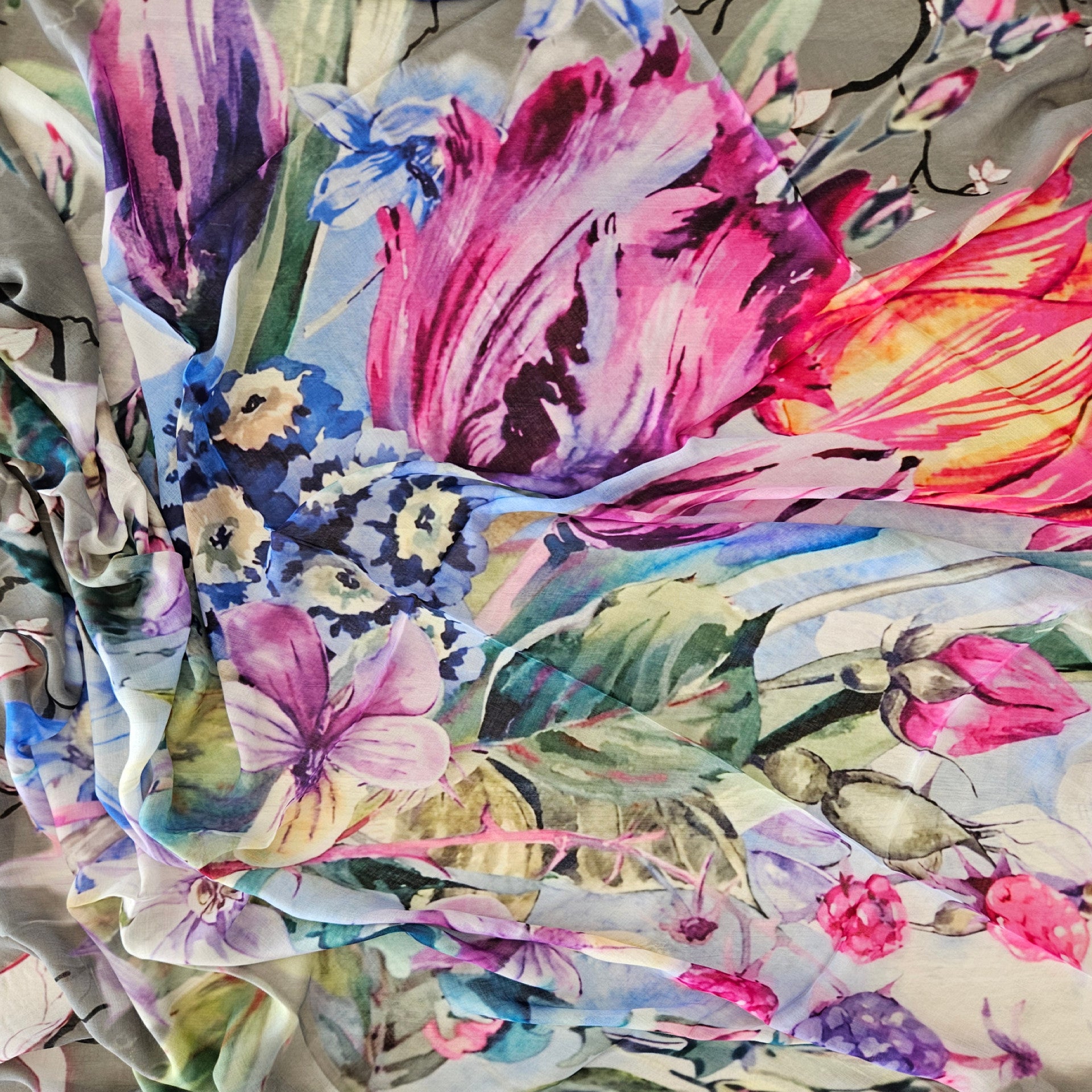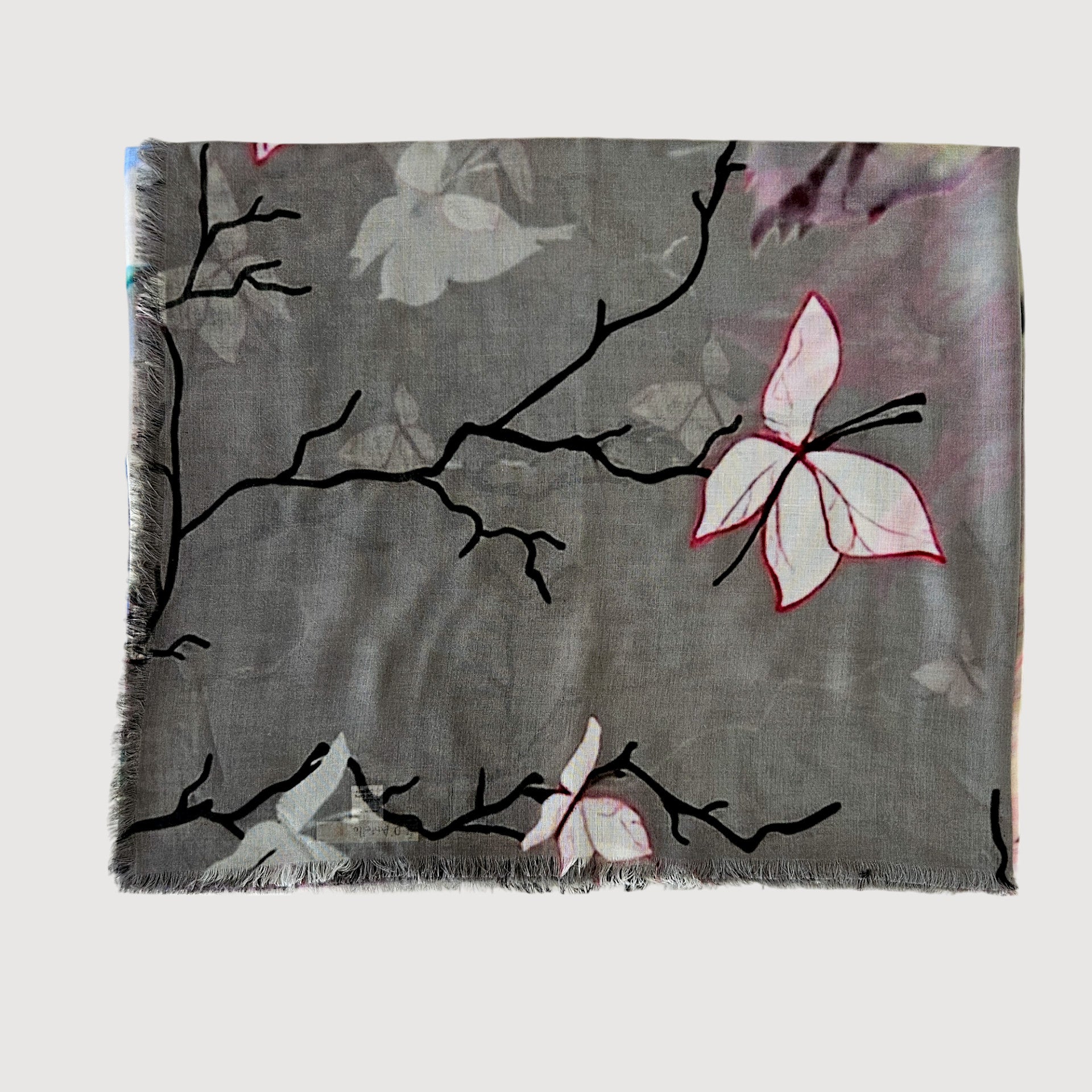 Una sciarpa raffinata in modal e cachemire, caratterizzata da un disegno centrale di un mazzo di fiori vivaci che si staglia su uno sfondo grigio. Il tessuto, morbido e avvolgente, unisce leggerezza e calore, mentre il motivo floreale aggiunge un tocco di eleganza e femminilità.