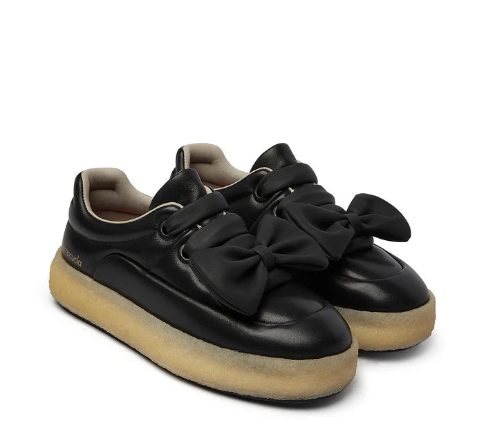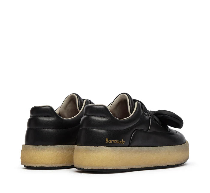 La nuova sneakers Crane di Barracuda, realizzata in morbida nappa nera, esprime al meglio lo stile streetwear contemporaneo. Questo modello si distingue per i lacci oversize, che aggiungono un tocco audace e innovativo al design. La suola rialzata in gomma naturale, dal look crepe, non solo garantisce una maggiore altezza, ma offre anche comfort e aderenza eccellenti. Fiocco amovibile. Colore: Nero Materiale: Nappa