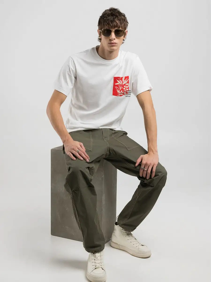 T-shirt girocollo a maniche corte in fresco jersey di cotone. Il design dalla vestibilità regolare presenta un taschino sul petto con motivo floreale a contrasto, sovrastato da una stampa lettering. L'etichetta esterna con logo sul bordo della manica, un dettaglio distintivo di Replay, aggiunge il tocco finale.