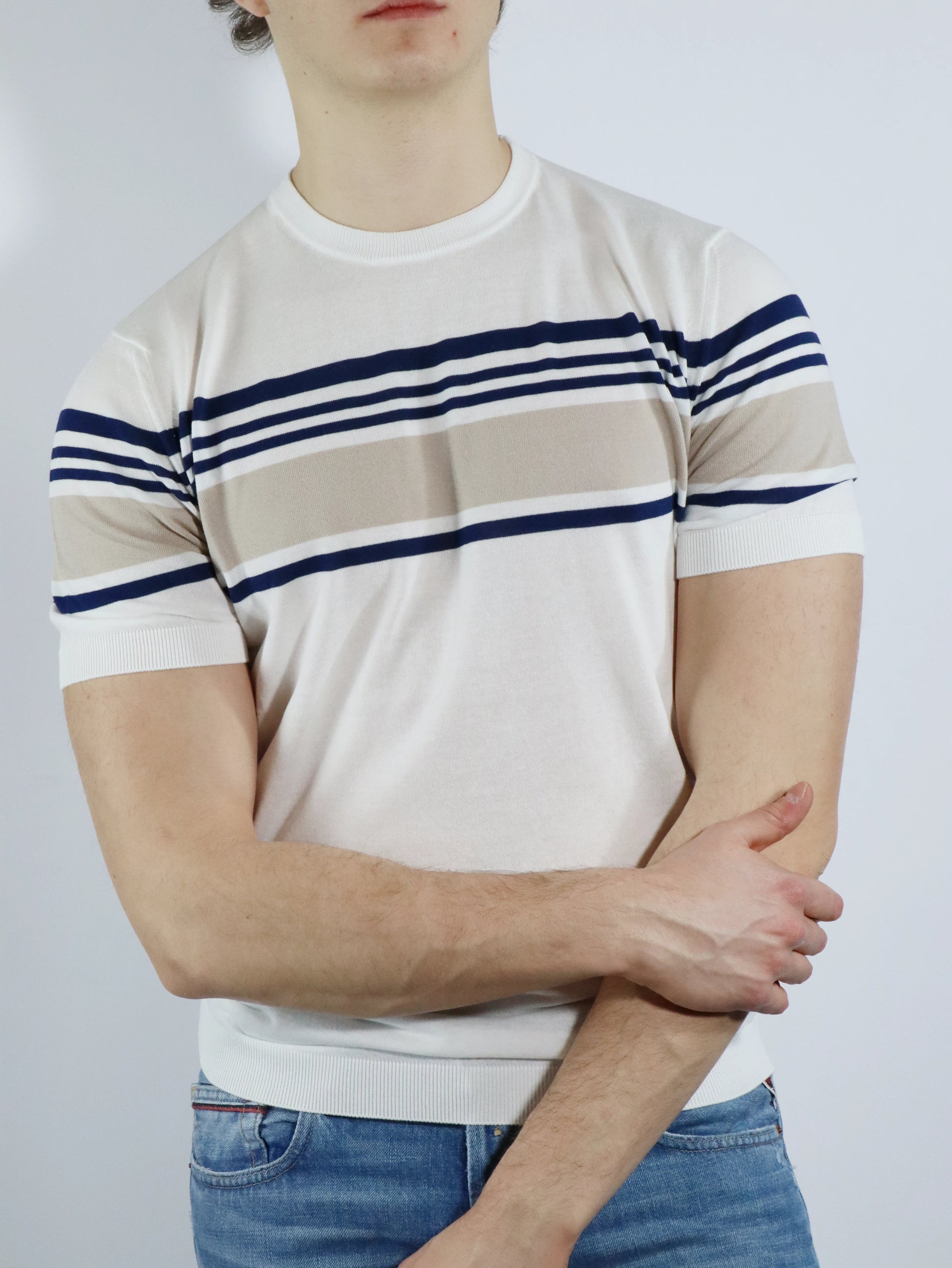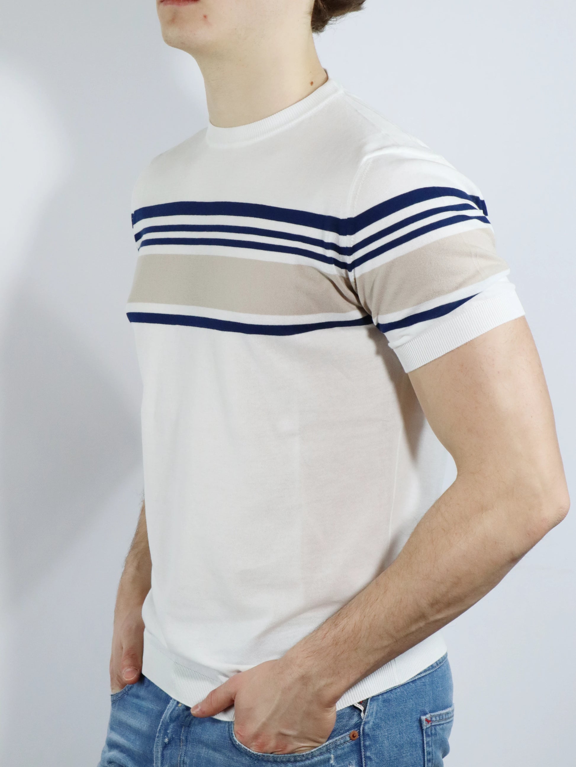 Realizzato in Italia, questa t-shirt in filo a righe FERRANTE 29103 è perfetta per l'estate grazie alle sue maniche corte e abbinabile con qualsiasi outfit. Goditi il massimo comfort e stile con questo prodotto made in Italy.
