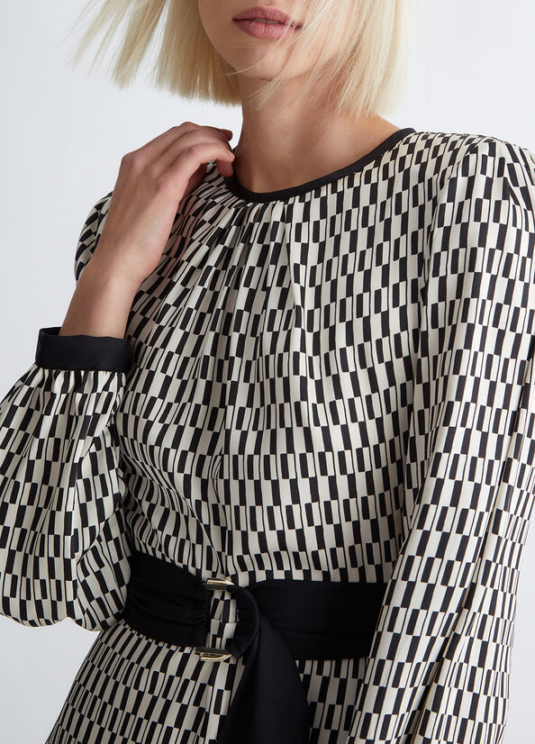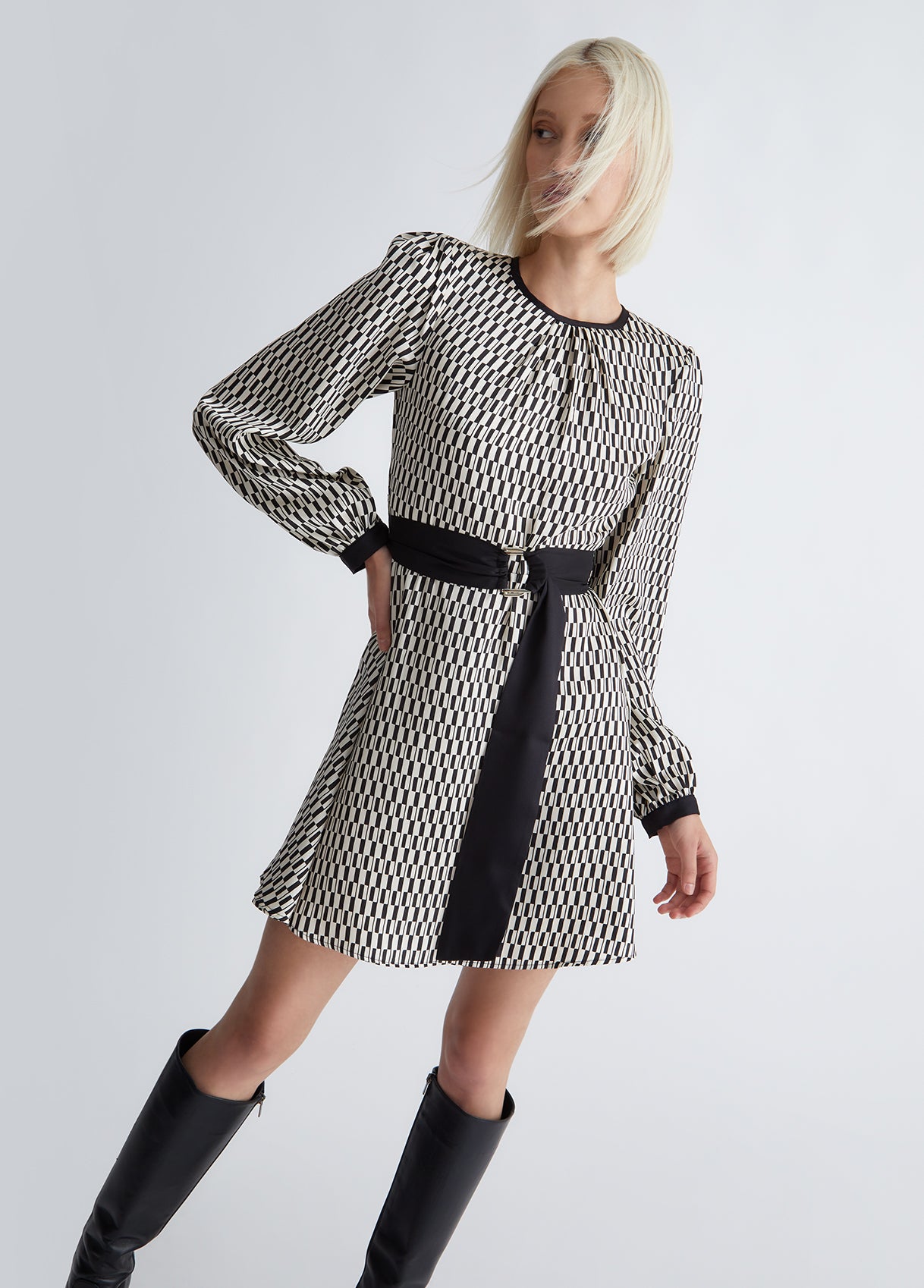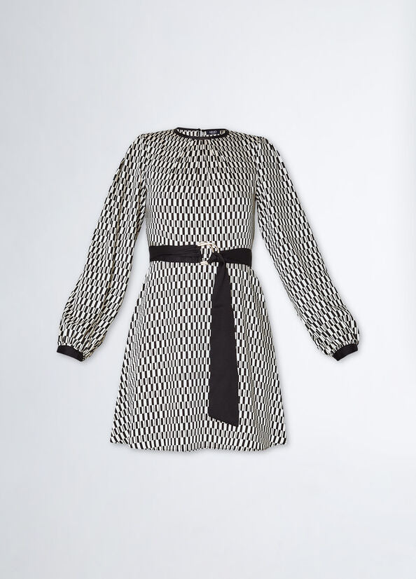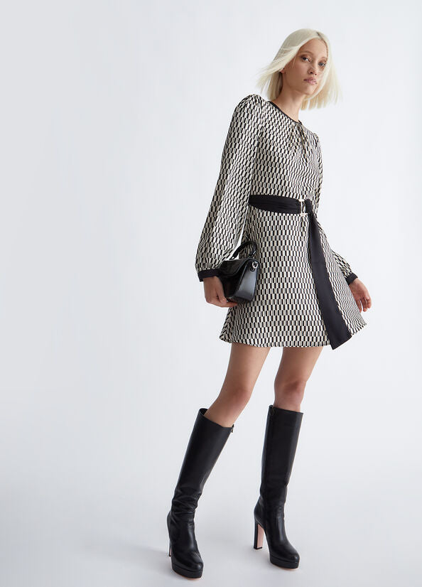 Less Impact, same style. Femminilità e glam si traducono in amore e rispetto per l'ambiente, oggi più che mai. Inserito all'interno della proposta di collezione "Liu Jo Better", questo vestito corto bianco e nero in twill stampato è realizzato con almeno il 20% di fibre riciclate. La fantasia optical e il taglio fit & flare con cintura lo rendono una scelta elegante e disinvolta da sfoggiare agli eventi in programma. Il procedimento green utilizzato per la sua realizzazione limita l'utilizzo di prodotti chimici e i criteri ambientali e sociali sono rispettati in tutte le fasi della filiera produttiva. Be Better, do better.